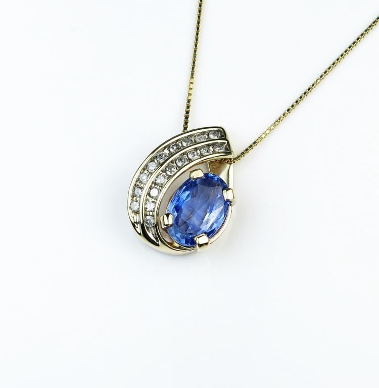 Stylish Cornflower Blue Sapphire and Diamond pendant featuring a 2.41 carat Sapphire accented with 18 channel set Diamonds set in a 10 karat yellow gold setting. Estimates $1,000- $1,500