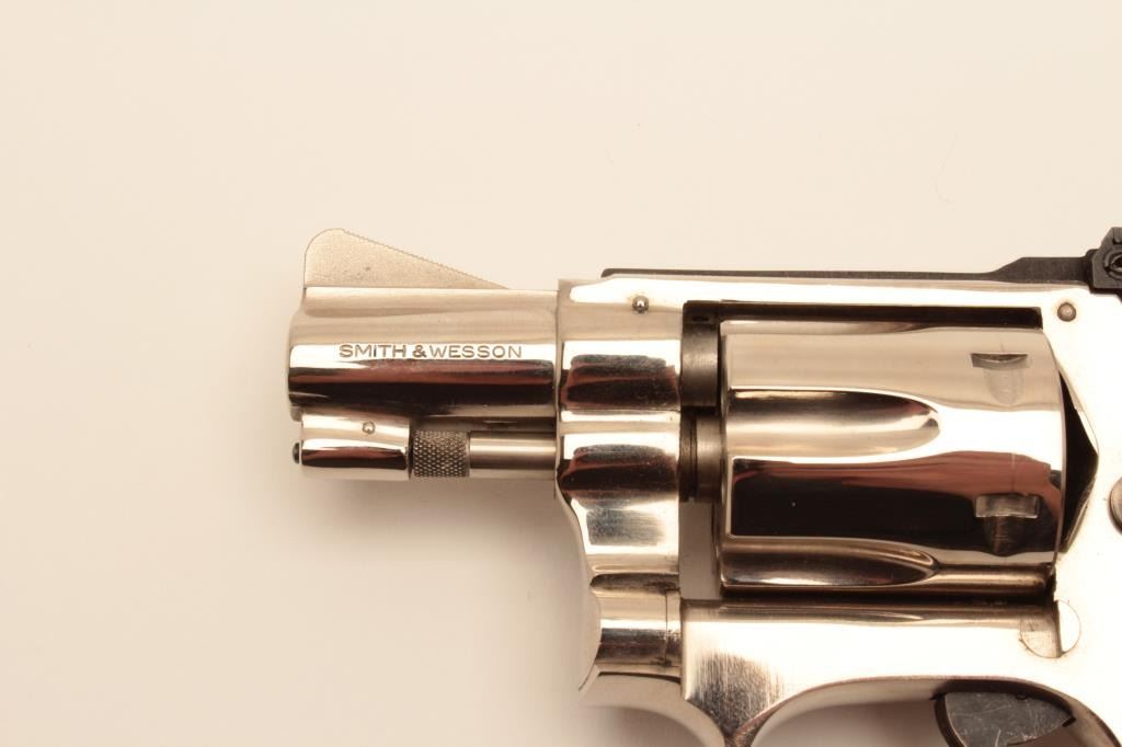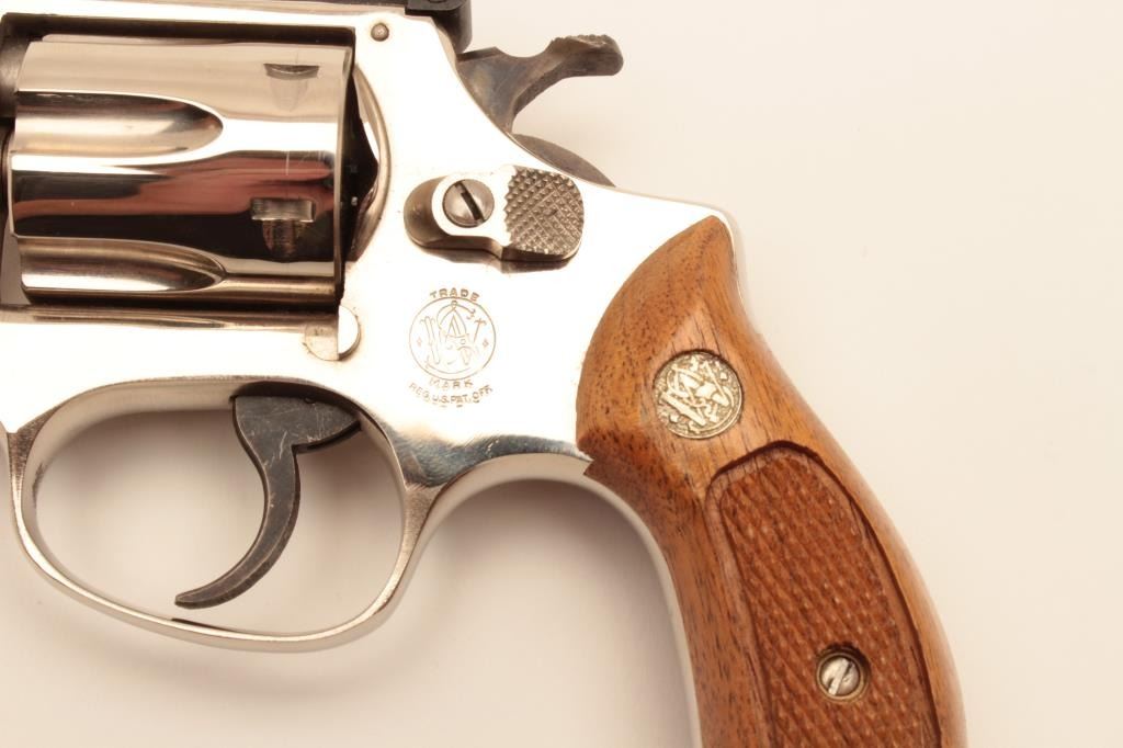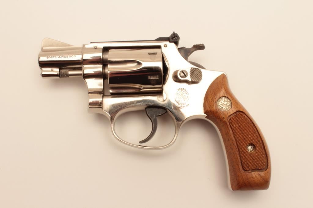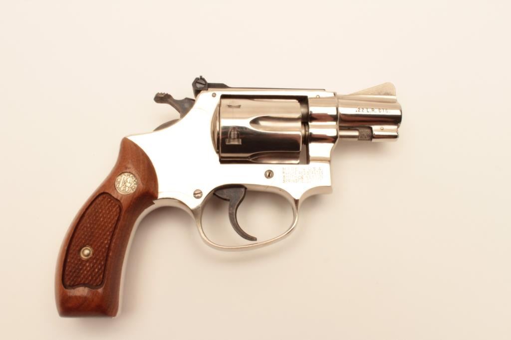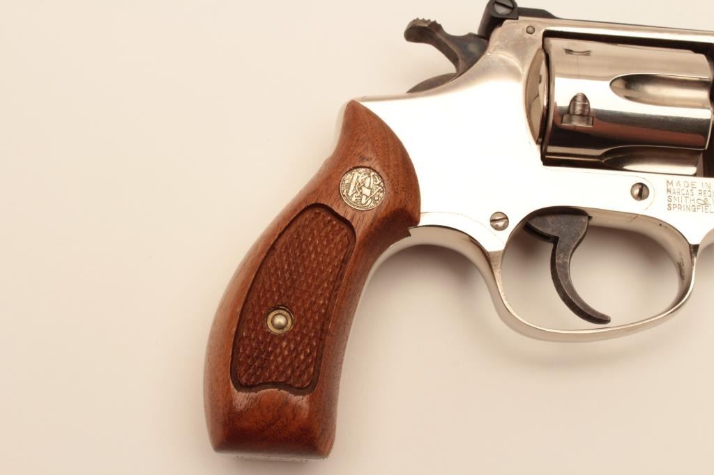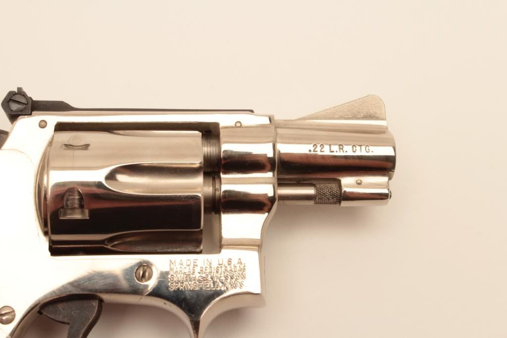 Smith & Wesson Model 34-1 DA revolver, .22LR caliber, 2” barrel, nickel finish, checkered wood medallion grips, S/N M66298; overall like new condition with factory two piece silver and blue cardboard box (end labelnumbered to this gun), instructions and cleaning tools. (Modern/NO CAL. SALE). Est.: $500-$1,000.