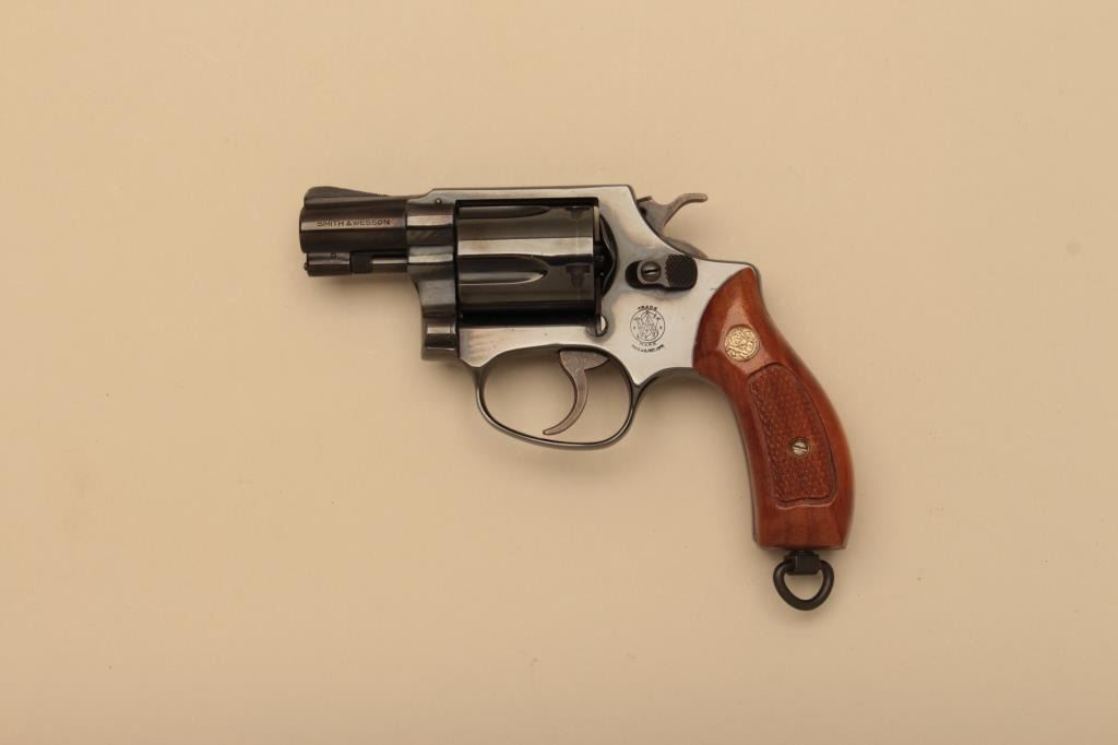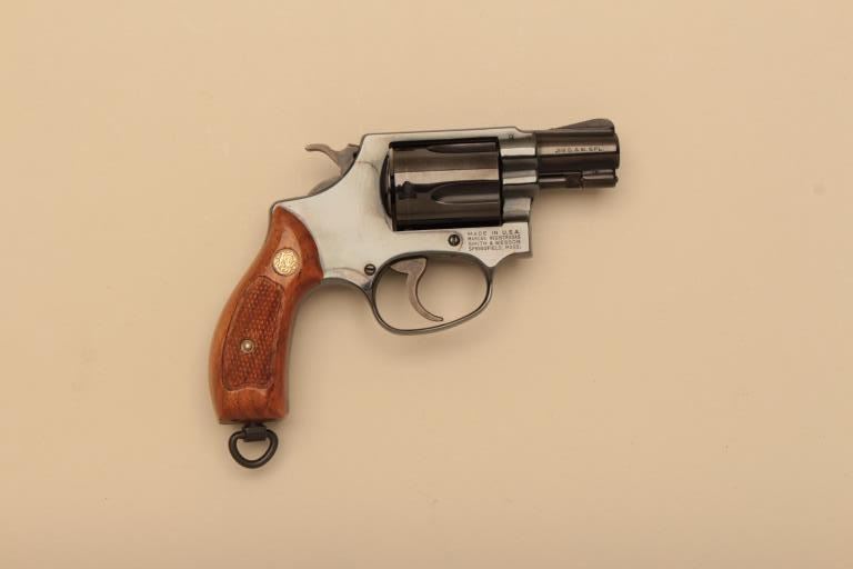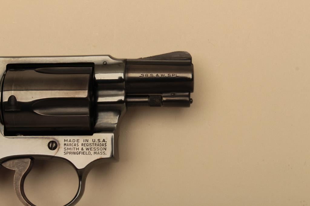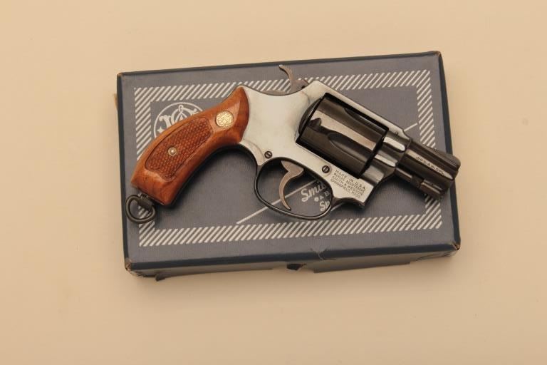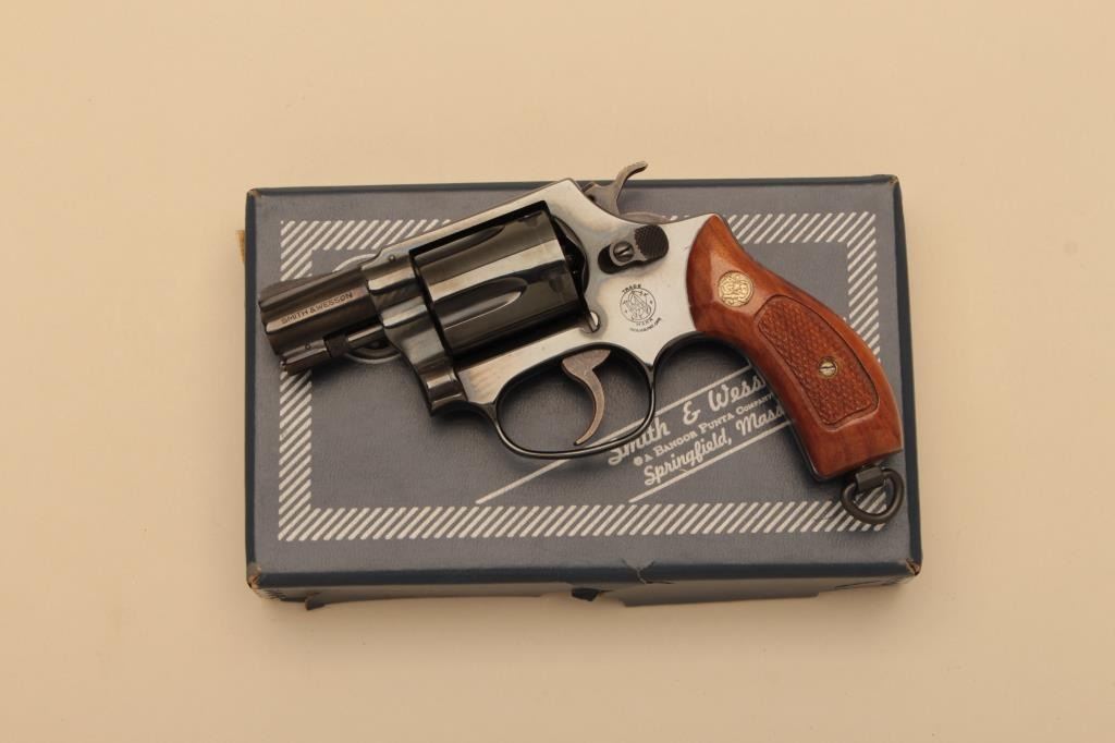 Smith & Wesson Model 36 (no dash) DA revolver, .38 Special caliber, 2” barrel, blued finish, checkered wood medallion grips with lanyard ring, S/N J581767; like new condition with factory cardboard two piecebox with end label numbered to this gun and cleaning tool plus note from consignor “One of 112 Overrun from U.S. Army contract”. (Modern/NO CAL. SALE). Est.: $600-$1,200.