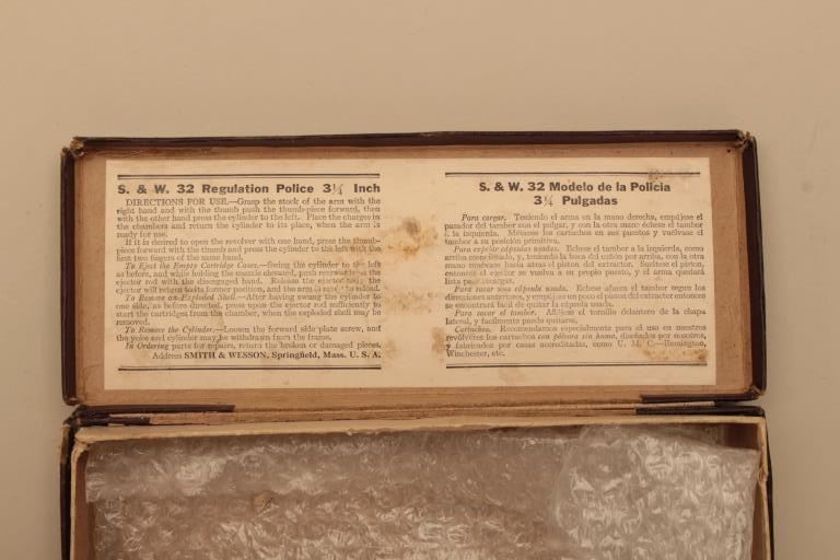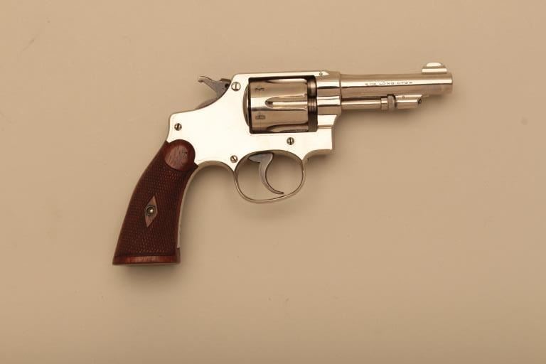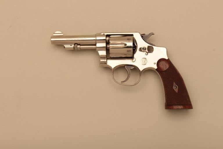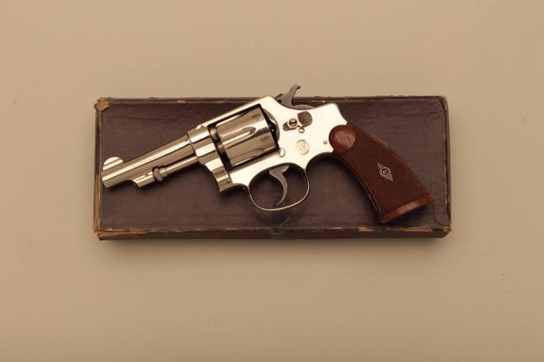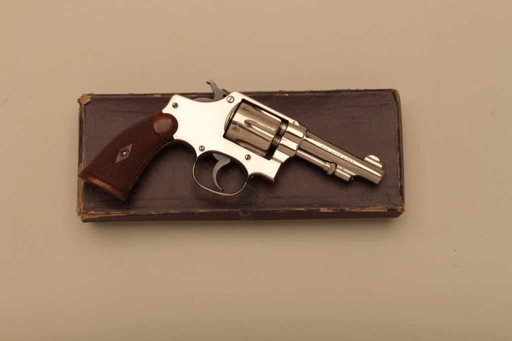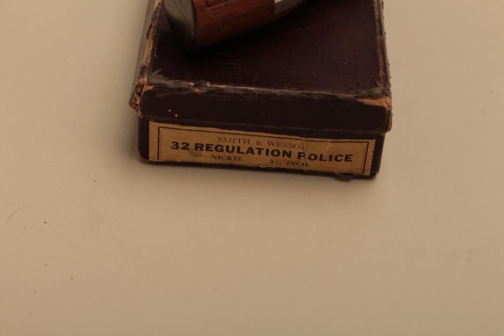 Smith & Wesson Hand Ejector DA revolver, .32Long caliber, 3.25” barrel, nickel finish, checkered wood grips, S/N 311597; overall near new condition and accompanied by a factory fabric covered cardboard box with end label “Smith & Wesson/32 Regulation Police/Nickel/3-1/4 Inch”. (C&R). Est.: $600-$1,200.