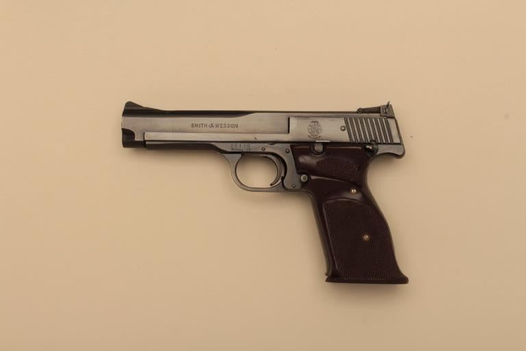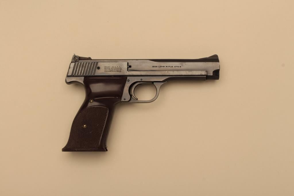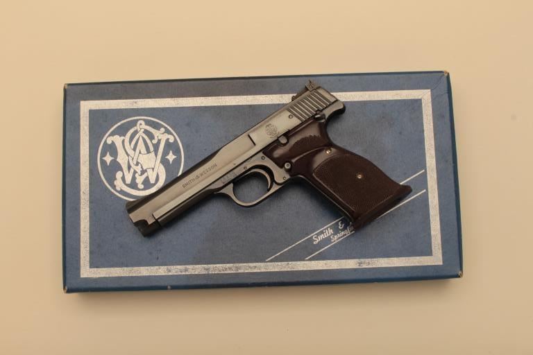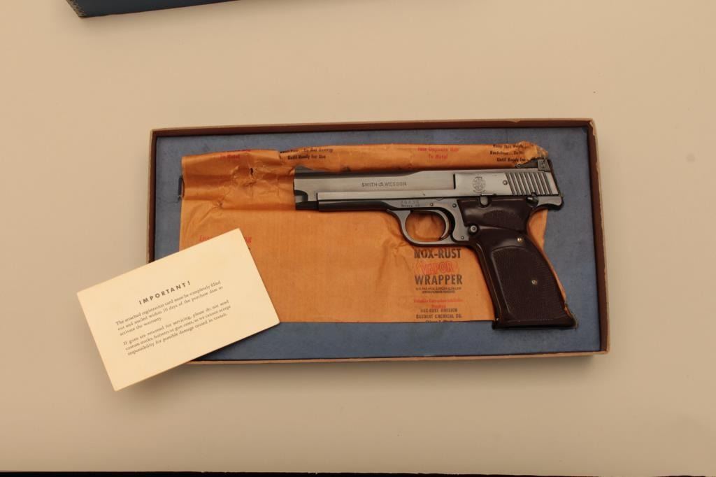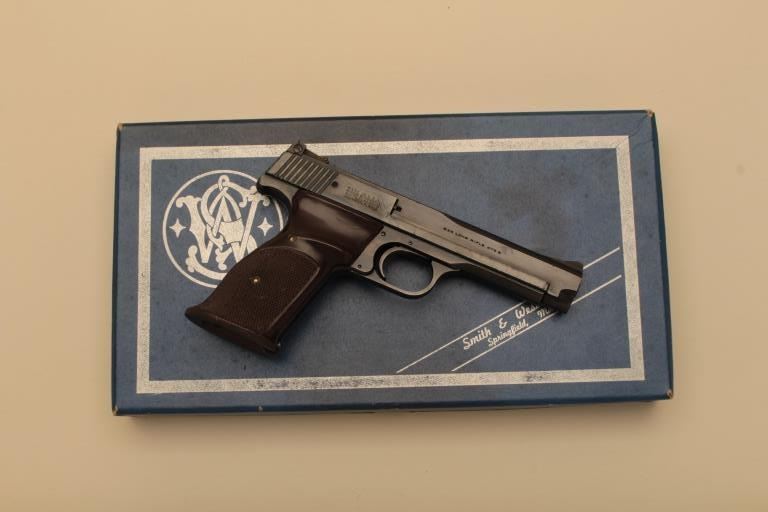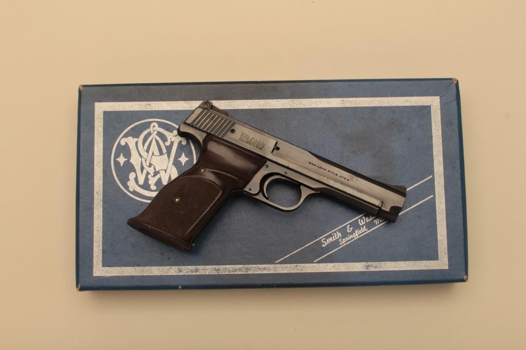 Smith & Wesson Model 46 semi-automatic pistol, .22LR caliber, 5” barrel, blued finish, checkered target grips, S/N 25436; overall near new condition with factory cardboard two piece box. (C&R).Est.: $700-$1,400.