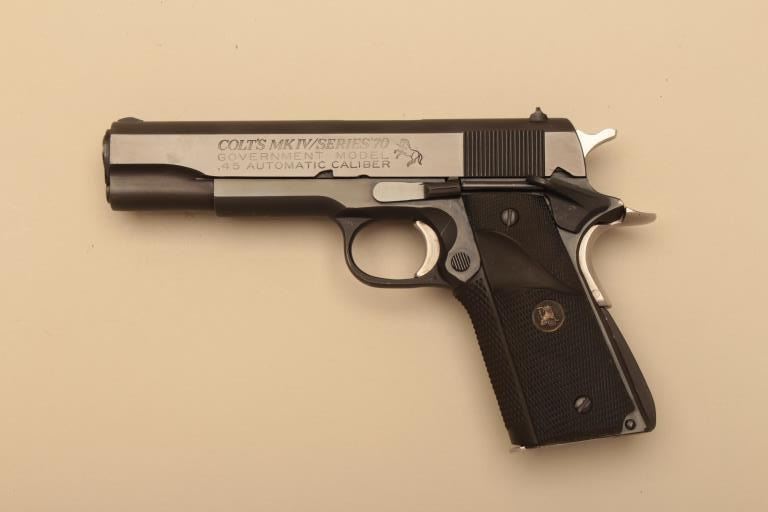 Colt MK IV Series 70 government model .45 A.C.P. caliber Semi-Auto pistol in very good plus condition, S/N 35499670. Hammer, grip safety and trigger changed. Ambidextrous safety. Good quality upgrading and gunsmithtuning. 3 ½-4 lb trigger pull. 95%-98% overall. (Modern/PPT) Est.: $700-$1400