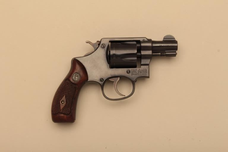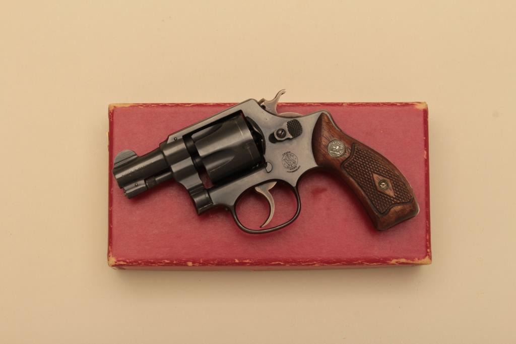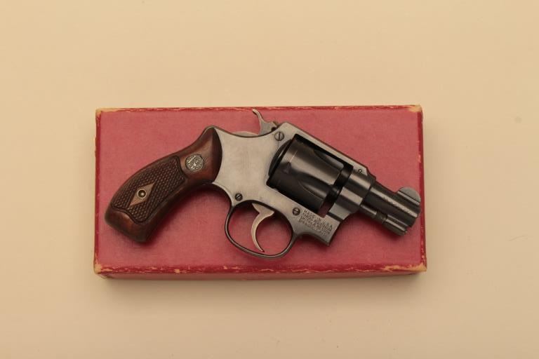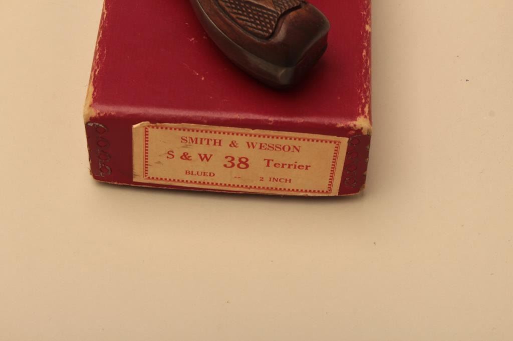 Smith & Wesson Terrier Model DA revolver, .38 caliber, 2” barrel, blued finish, checkered wood medallion grips, 5 screw frame, S/N 59603, in like new condition showing little handling; with factory two piece redcardboard box displaying correct end label; consignor tag inside states “United States Post Office Terrier”; no accompanying factory letter or documentation. (C&R). Est.: $500-$1,000.