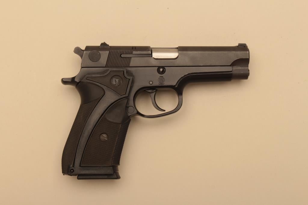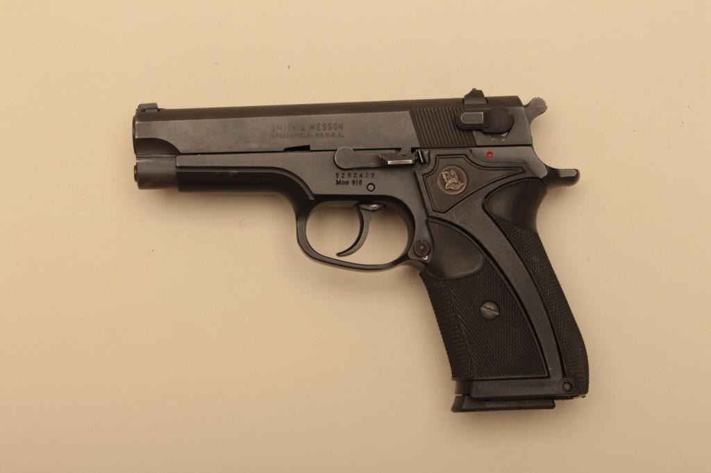 S&W Model 915 9mm Double action Semi-Auto pistol with neoprene grips and 14 round magazine (Must be blocked for CA residents), S/N TZK2427. Very good plus to almost fine used condition. (Modern/PPT) Est.: $250-$500