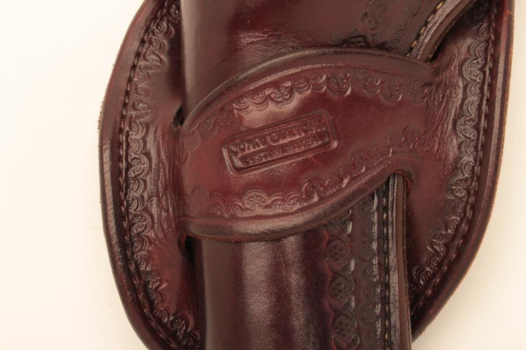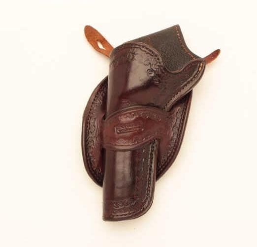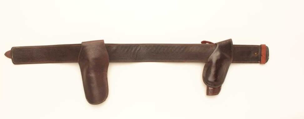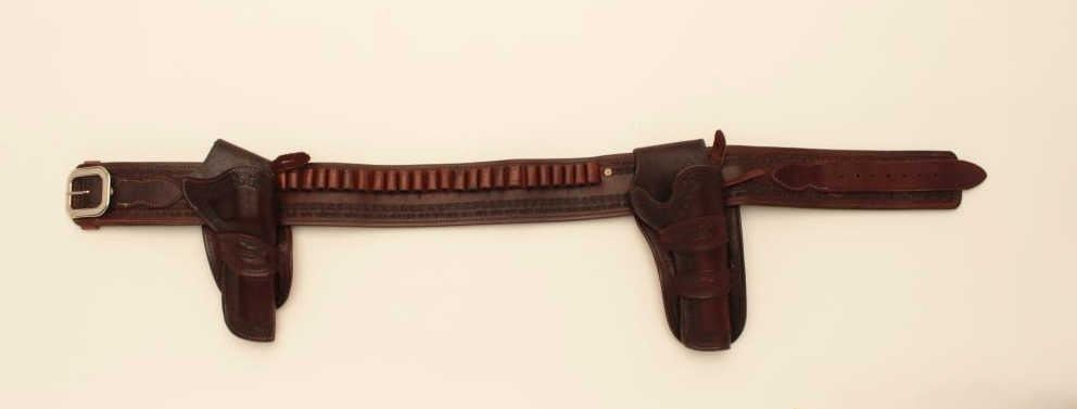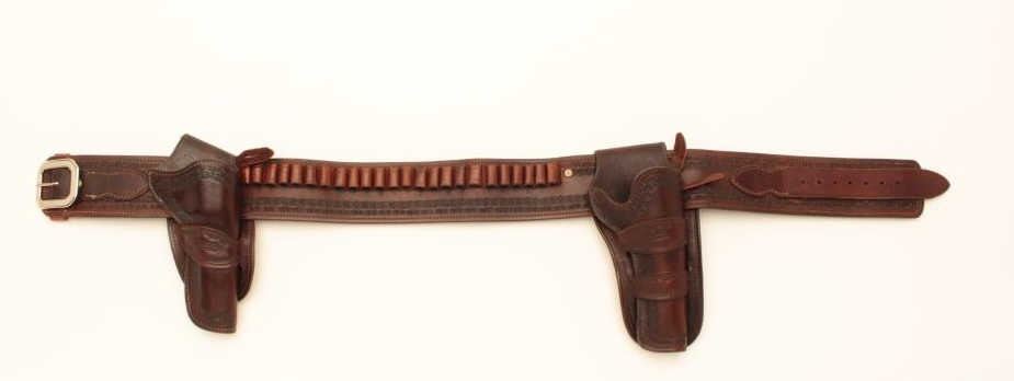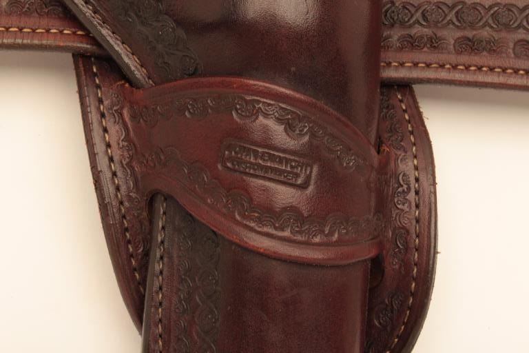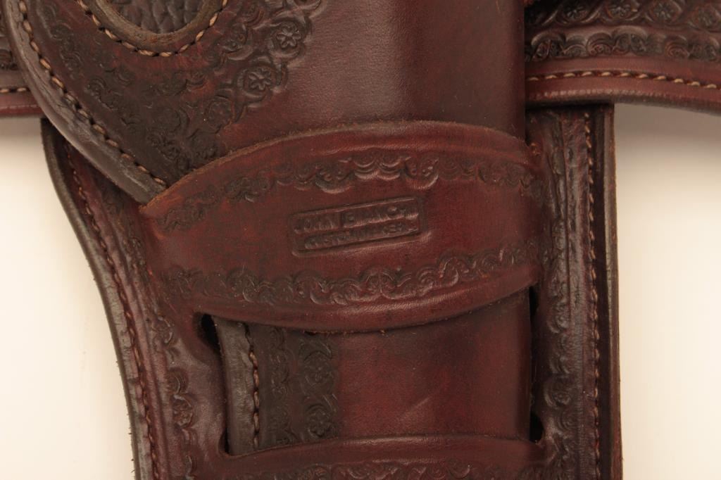 Lot of 3 Bianchi custom made leather holsters for Single Action Colts. 2 for 4 ¾” with 36” belt and 1 for 5 ½” no belt. Fine condition and great quality with old west styling. Est.: $175-$350.