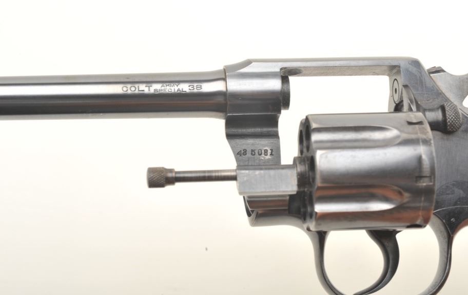 Colt Army Special DA revolver, .38 caliber, 6” barrel, blued finish, checkered black hard rubber grips in overall fine to excellent condition showing approximately 97%+ original blue, crisp action, sharp markings,finebore and very good to near fine grips with an old loss to the rear bottom back side of the right grip. (C&R/PPT). Est.: $1,250-$2,500.