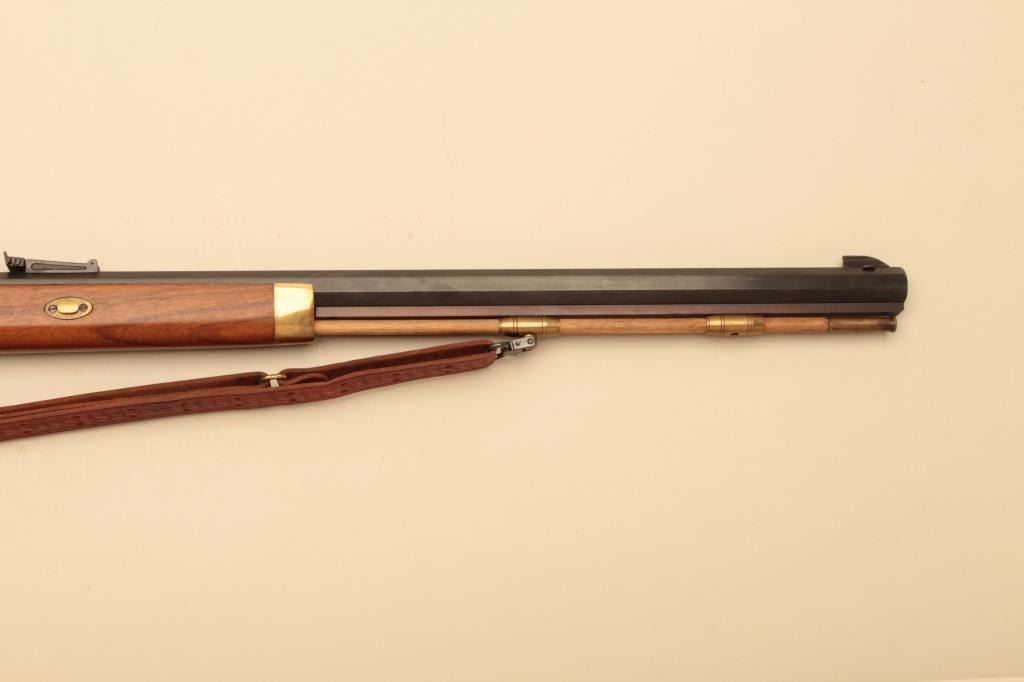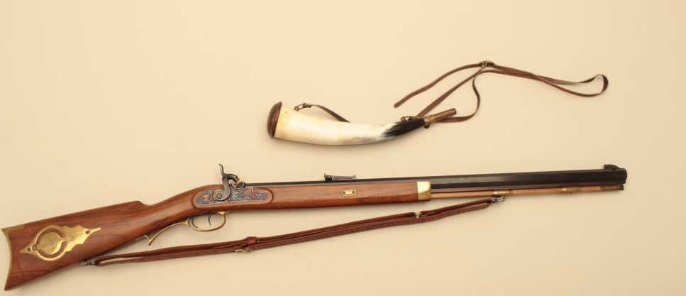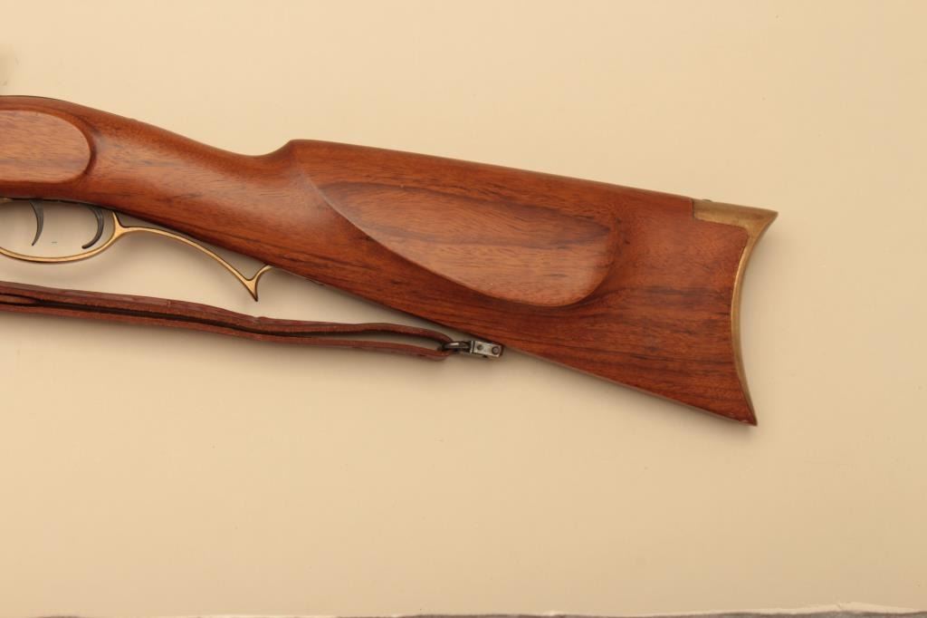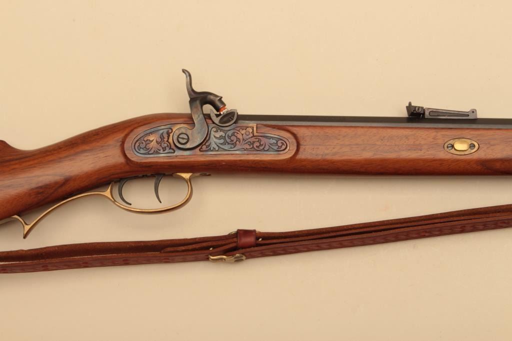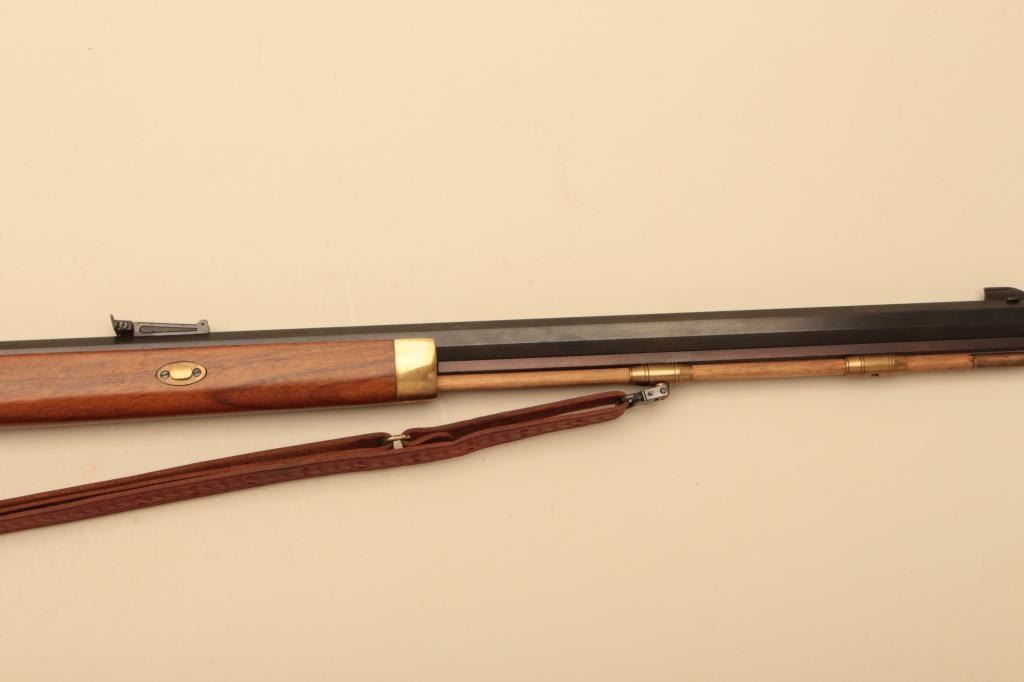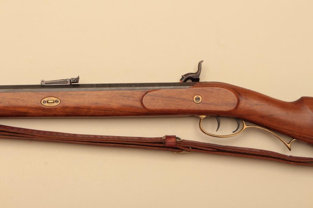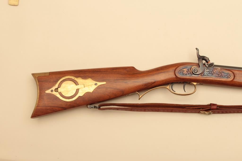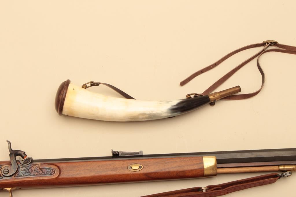 Italian reproduction Hawken rifle by Invest Arms, .50 caliber, Serial #248431. The rifle is in fine overall condition with a 28” octagon barrel with full-length wood and brass ramrod. The barrel retains nearly allof its blue finish with high point edge wear. The side plate and hammer are both beautifully case hardened with double set triggers. The smooth wood stock is in very good condition with brass hardware and anornate brass patch box in the butt. The butt stock ends with a smooth brass crescent butt plate. The lot also includes a leather, military style sling and powder horn made from a bull’s horn with brass tip. Est.:$150-$300.
