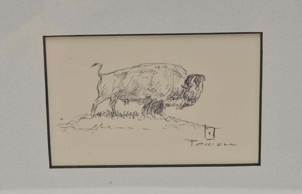 Framed and matted pen and ink drawing of an American Bison by famous Western artist Ace Powell, approximately 8” x 9.5” overall. Est.: $150-$250.
