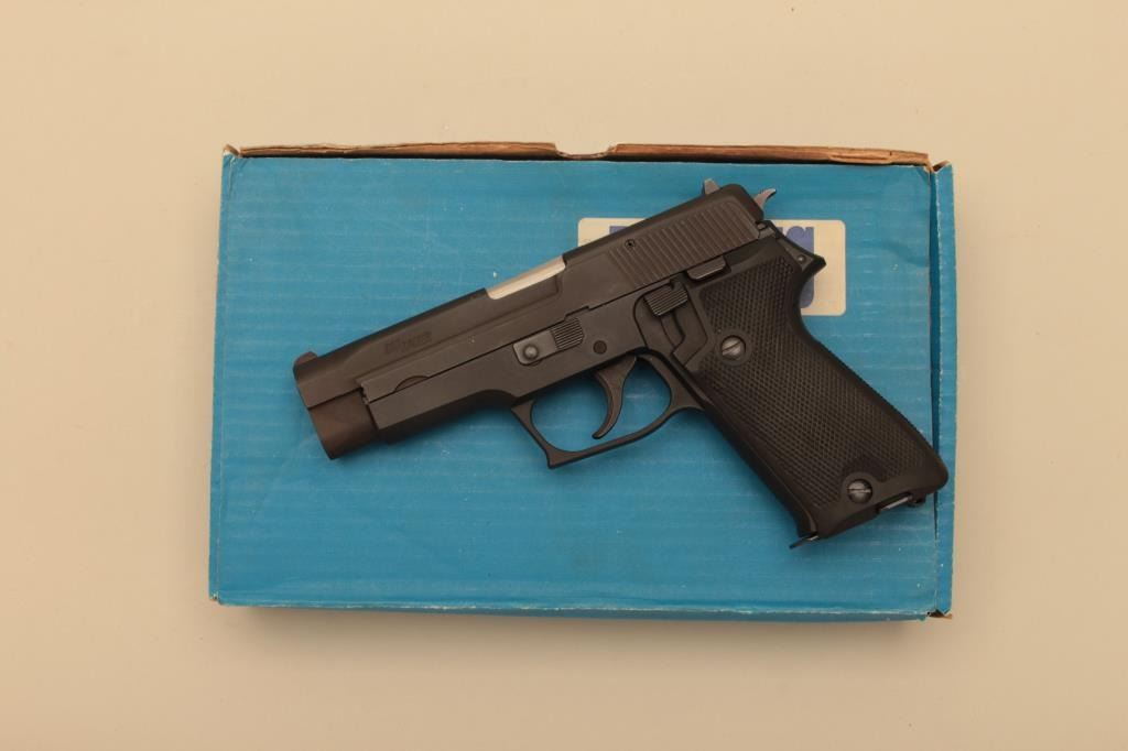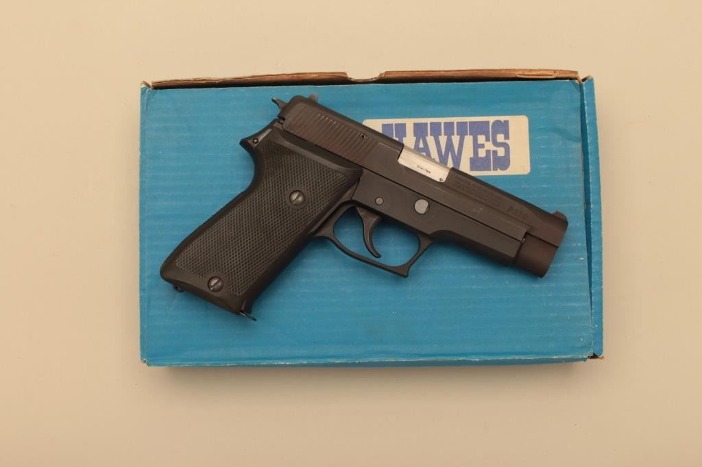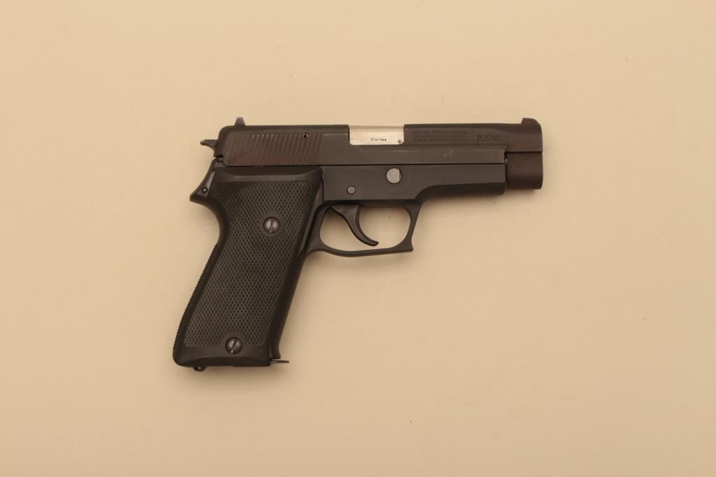 Early Sig Sauer P220 #G104074, 9mm, 4 1/4" barrel, matte finish, fixed sights, European mag release, lanyard loop, checkered plastic grips. Pistol is in very good to near fine condition overall. Excellent grips, verygood bore. The P220 is unusual in 9mm and this is an early example. Includes blue plastic box, (non matching) and one correct mag. (Modern/PPT) Est. $350-700