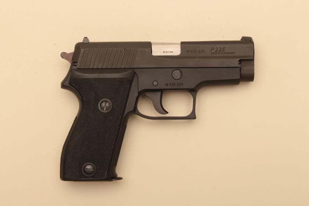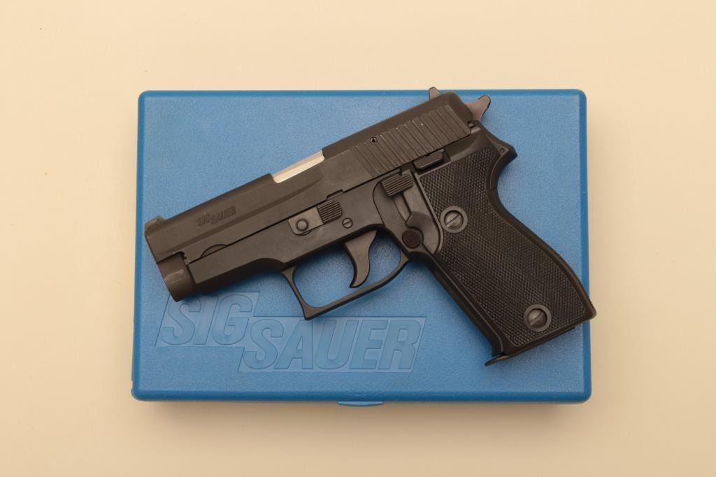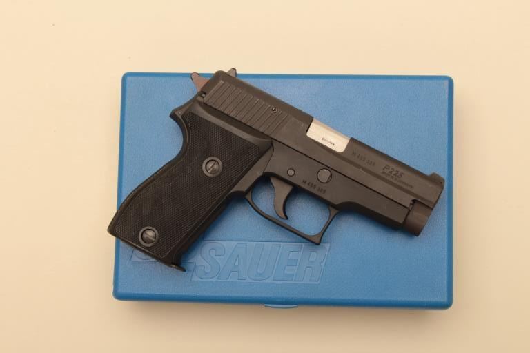 Sig Sauer P225, M455389, 9mm, 3 3/4" barrel, Nitride finish, checkered plastic grips. Pistol is in fine plus condition, showing approximately 96-98% original finish, fine bore, excellent action. Minor handlingmarks. Includes original plastic case and one mag. (Modern/PPT) Est. $400-800