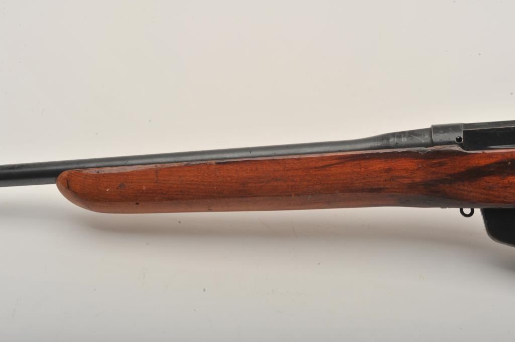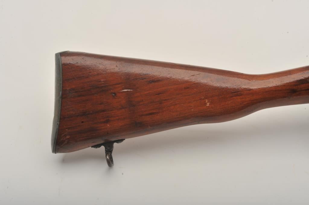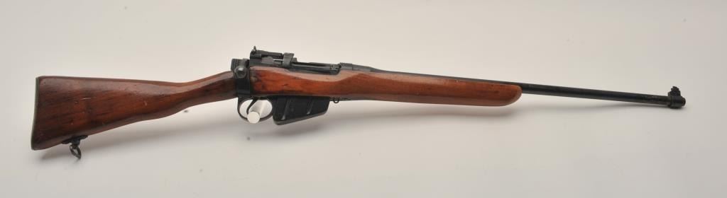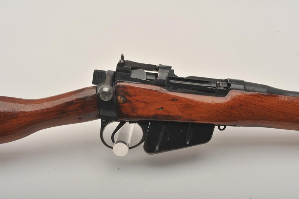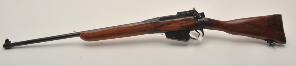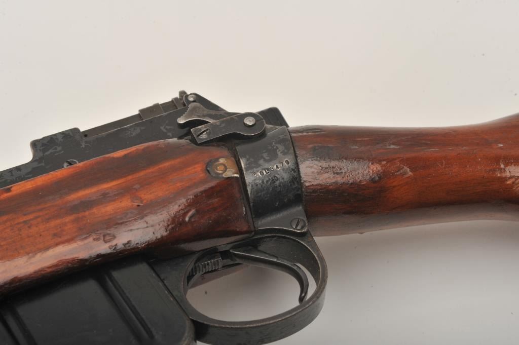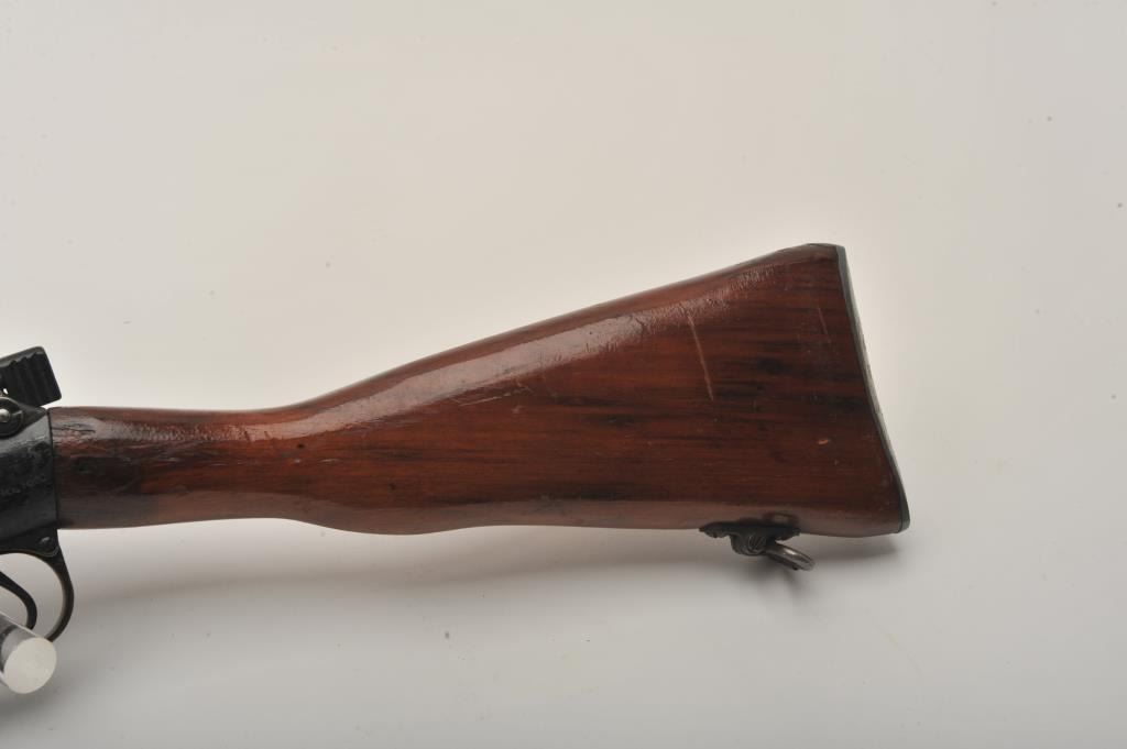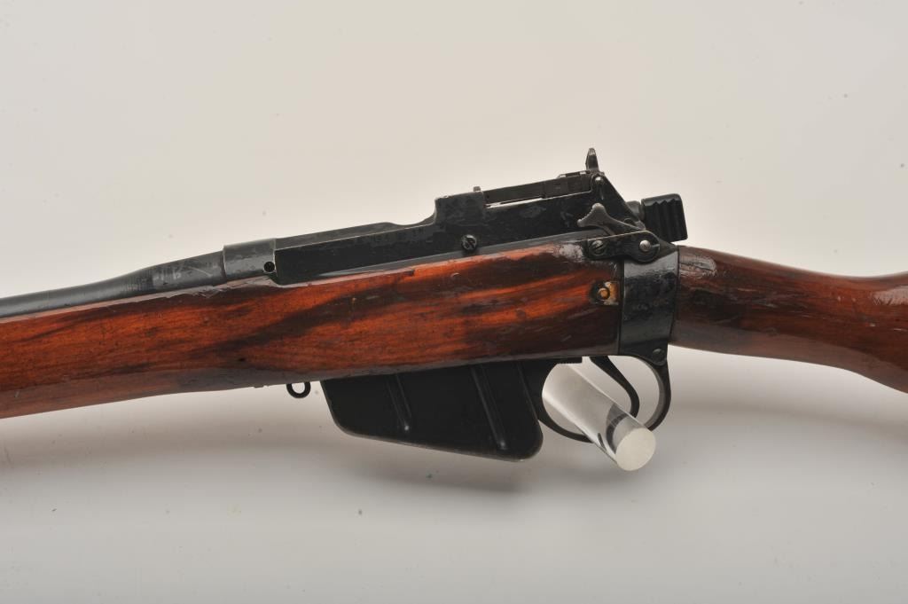 Enfield No. 4 MK I Long Branch bolt action rifle, .303 caliber, 23.5” barrel, black finish, wood stock, S/N 50L3470, fair + condition overall with a good action, good bore, some marring to finish at muzzle,re-finished wood stock with some scattered mars, dings and scratches. (C&R). Est.: $75-$150.