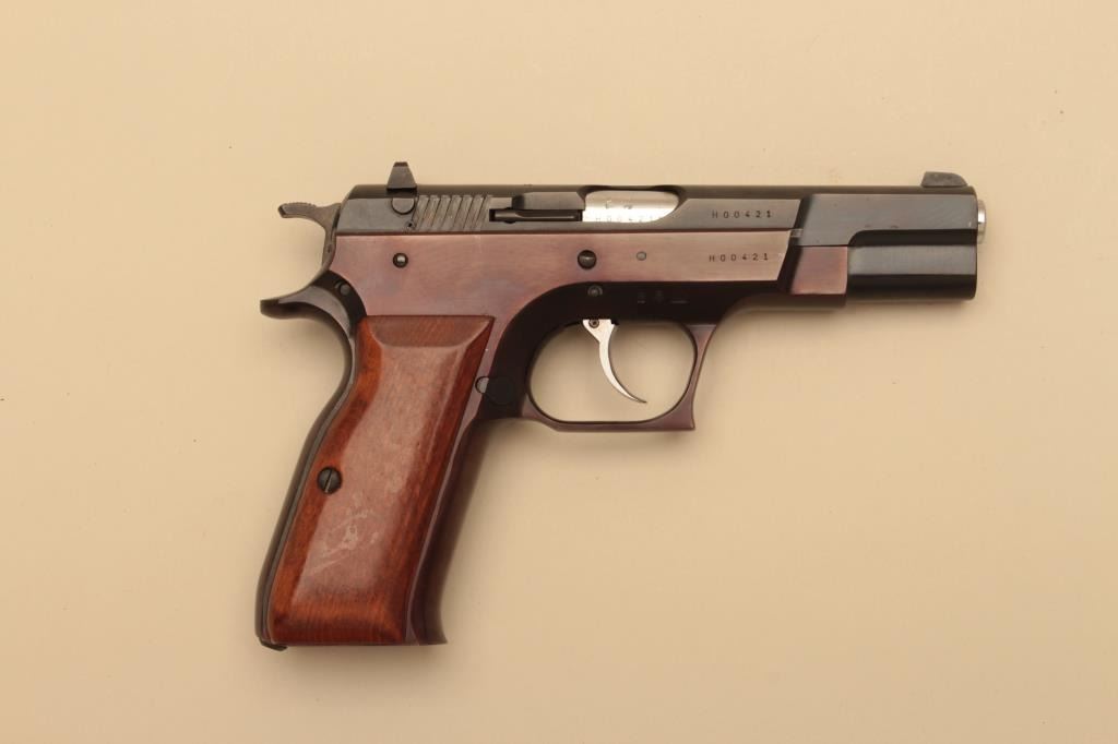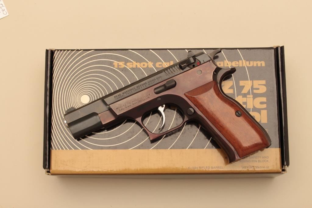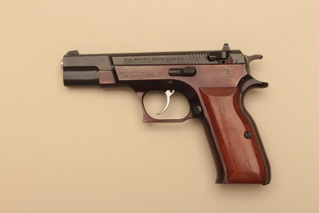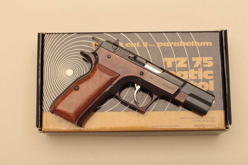 Tanfoglio Model TZ-75 semi automatic pistol, #H00421, 9mm, 4 1/2" barrel, blued finish, fixed sights, smooth wood grips. Pistol is in fine condition overall, retaining 96-98% original finish, frame is turning plumb.Grips are fine, bore is excellent. Includes original box, instructions and one hi-cap mag (not transferrable to CA or other prohibited states or areas). (Modern/PPT) Est. $300-600