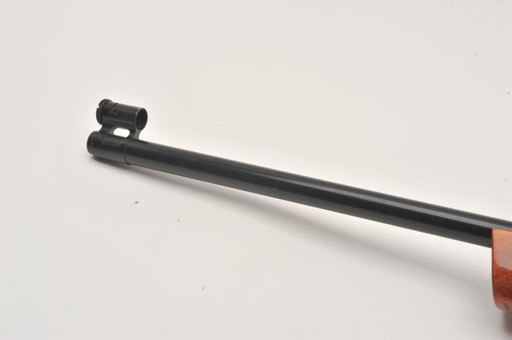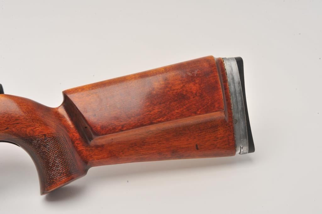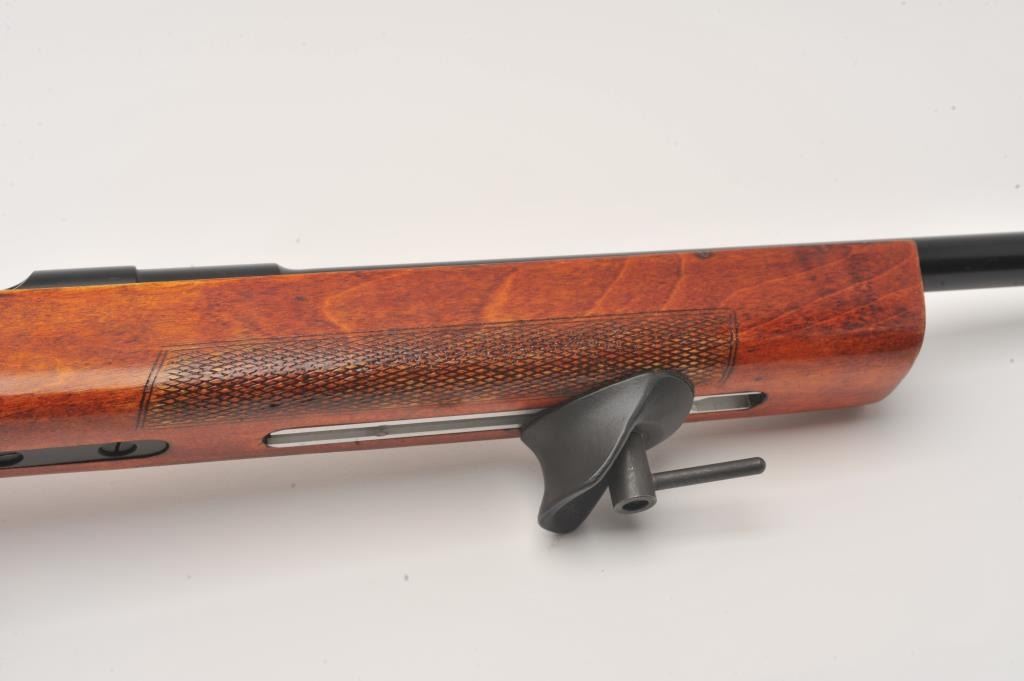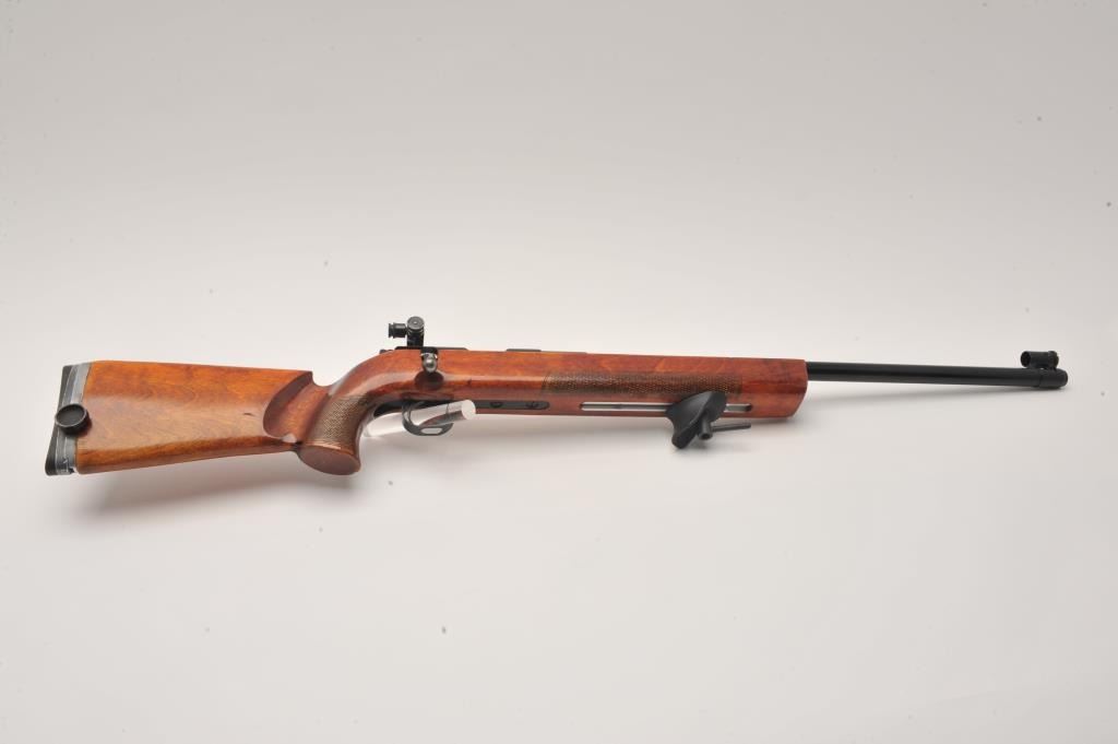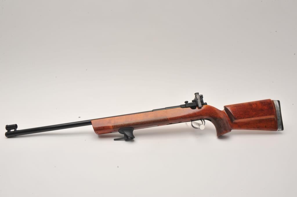 Russian Vostok bolt action single shot target rifle, .22 caliber, Serial #M11158. The rifle is in very good overall condition with a 26 ½” heavy target barrel with match hooded globe front sight and rear aperture sightadded at the tang. The barrel is import marked on the underside. The metal surfaces retain the majority of their blue finish with just storage marks. The checkered wood target stock is in very good condition withlight handling marks. The butt ends with an adjustable rubber butt plate. The bore is dirty but should clean to good, the action crisp and markings are sharp. Est.: $500-$1,000. (Modern).