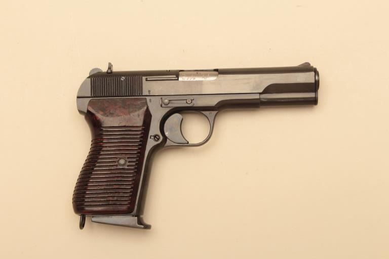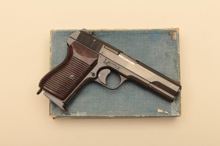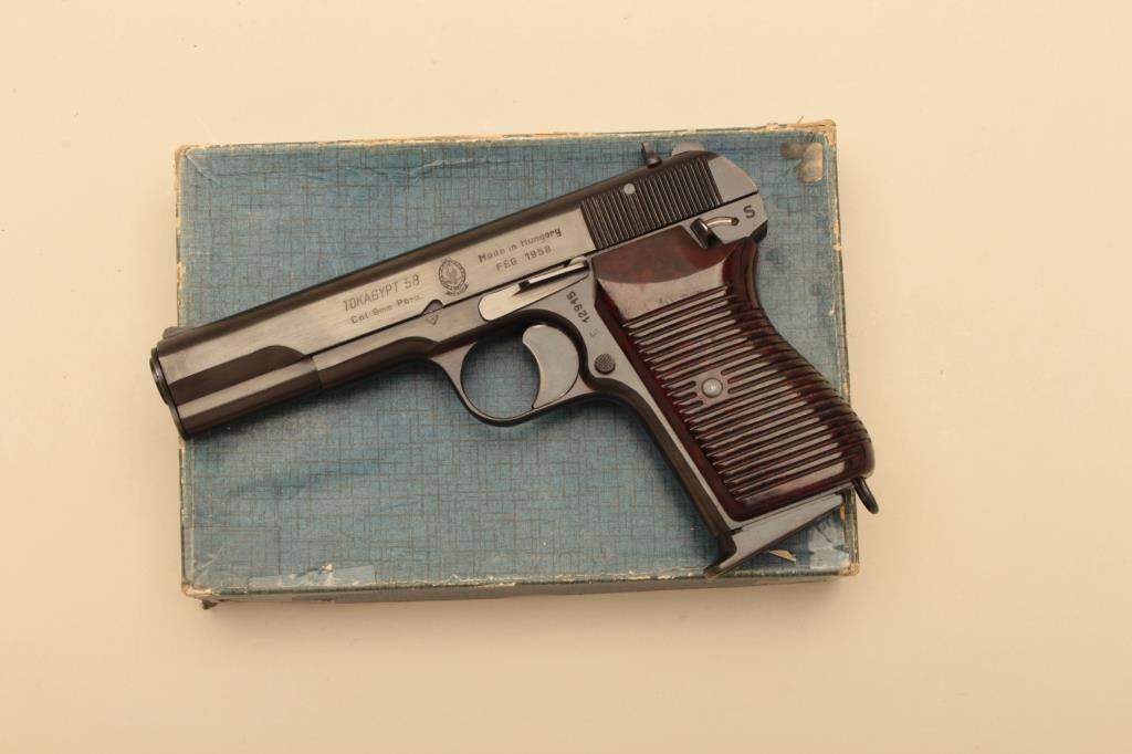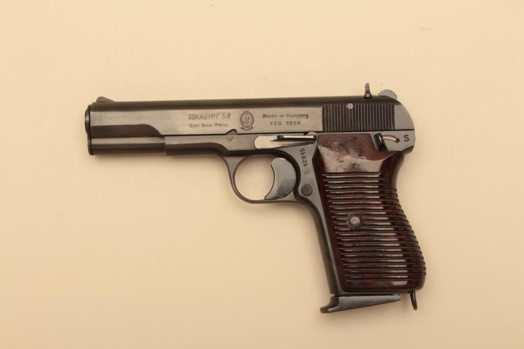 Tokagypt 58, #E12915, 9mm, 4 1/2" barrel, blued finish, bakelite grips. Pistol is in as new condition, 96-98% original finish remains, pistol shows just light handling marks. Bore is minty, action is excellent.Includes box and 2 mags. (C&R/PPT) Est. $250-500