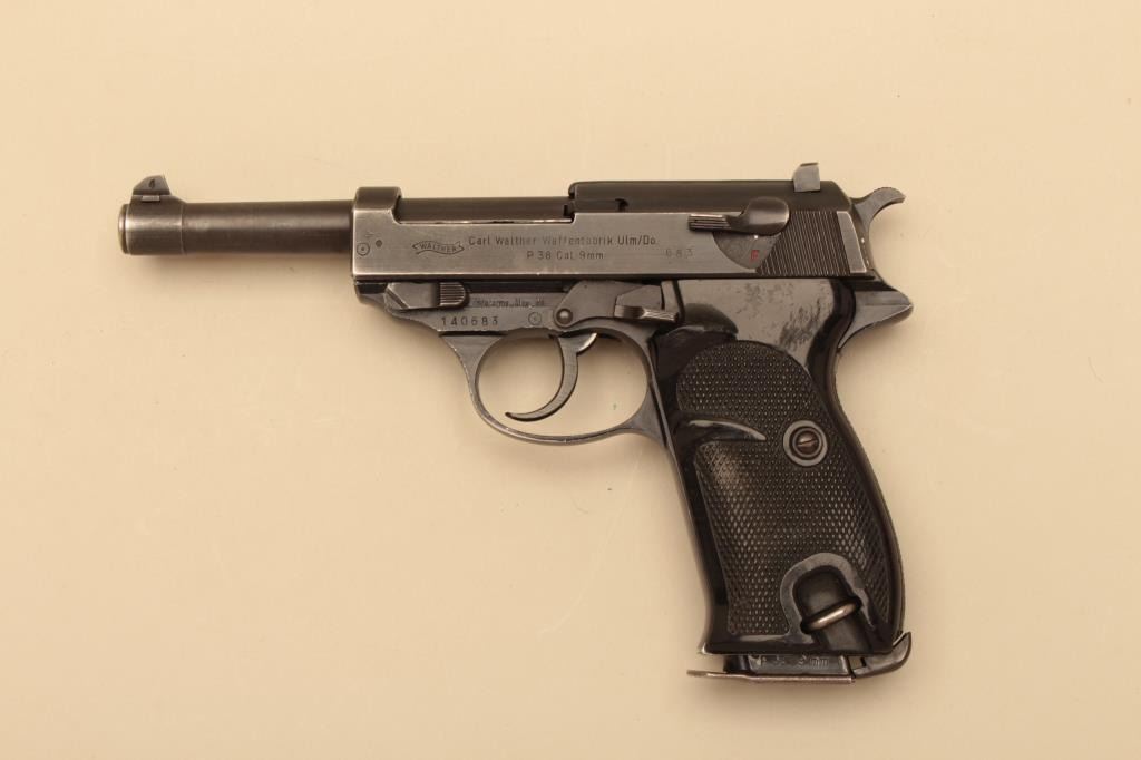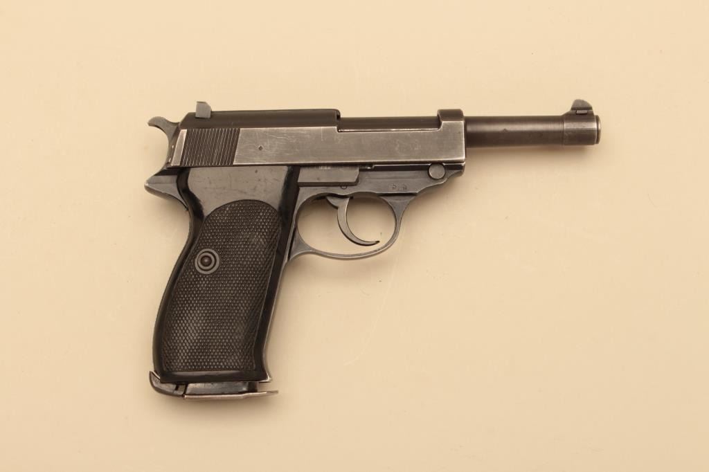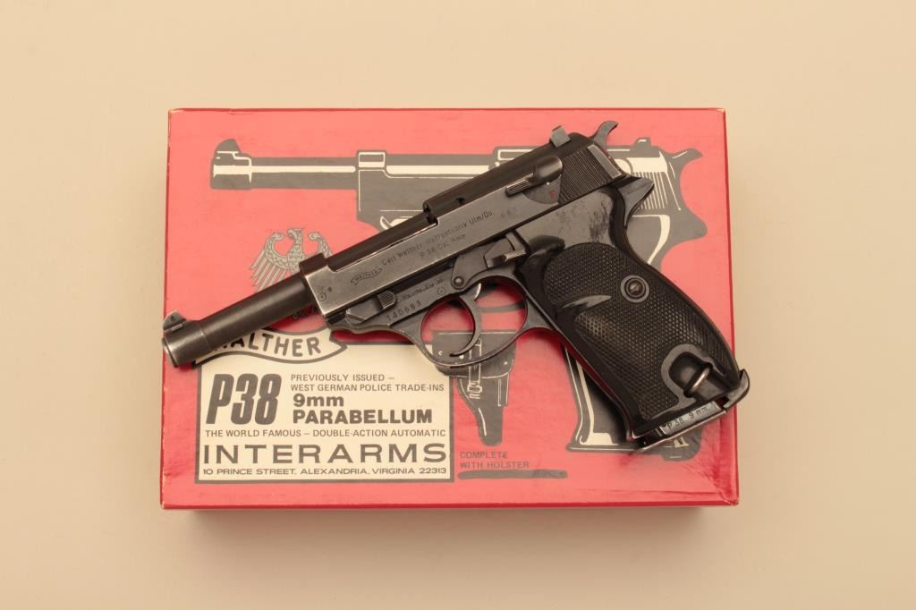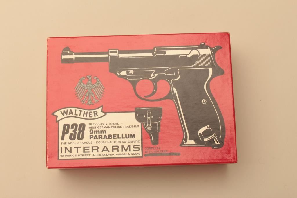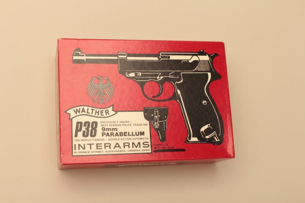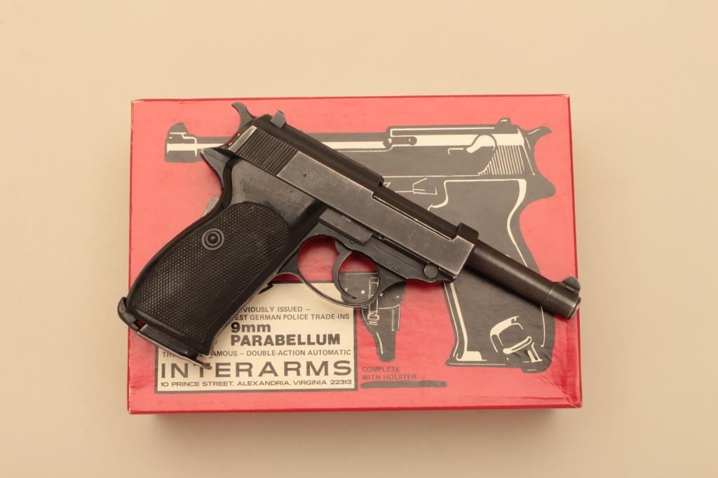 Interarms Walther P-38, #140683, 9mm, 5" barrel, blue finish with checkered plastic gris. Pistol ios in good condition overall, retaining approximately 80-90% original finish, thinning, especially at the edges.9/61 production date on slide. Grips are good with some wear consistant with the rest of the gun. Bore is good, actiion is good. Includes one correct mag and original box. (C&R/PPT) Est. $300-600