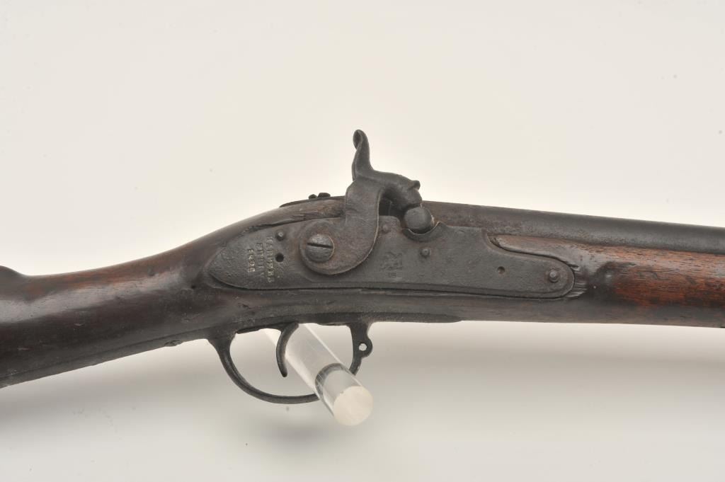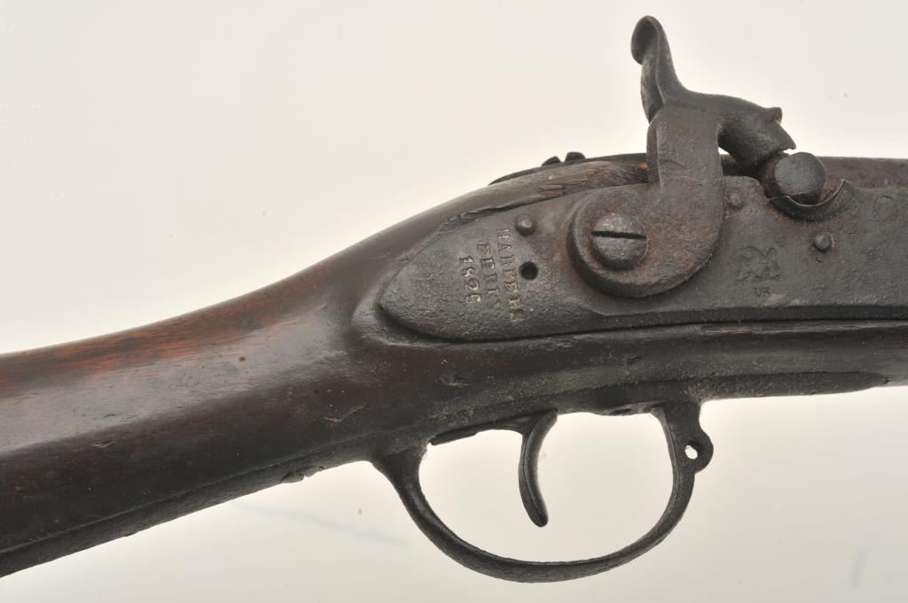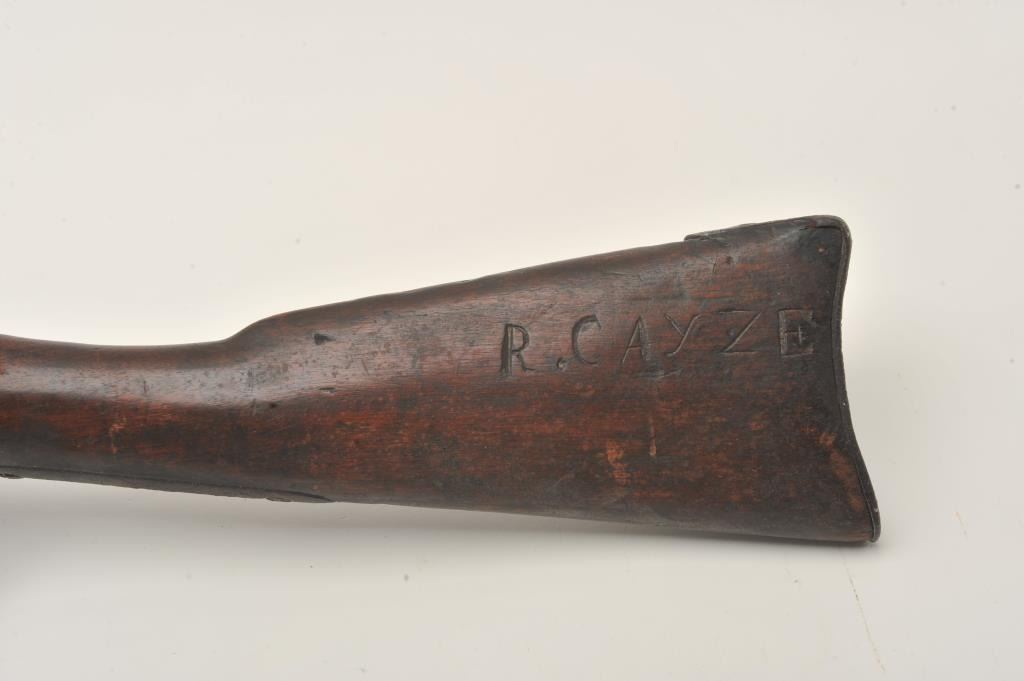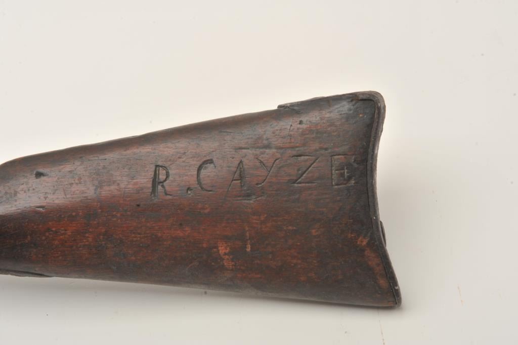 Interesting relic Harper’s Ferry converted to percussion possible Civil War era musket, .69 caliber, 42” barrel, lockplate is dated 1825, dark patina to metal surfaces with general old areas of erosion and surfacerust, iron mountings, wood stock with old modification to forend at rear barrel band, no wood forward of that until the front barrel band/sight where there is an approximate 6” section of forend to hold onthe front barrel band/sight; action working, wear and shaping to the butt stock with some losses at the upper tang; left side of butt stock shows old carved “R. CAYZE”; wood ramrod. May be researchable.(Antique). Est.: $200-$400.