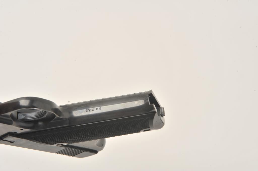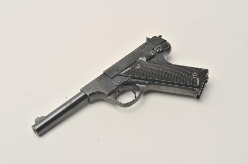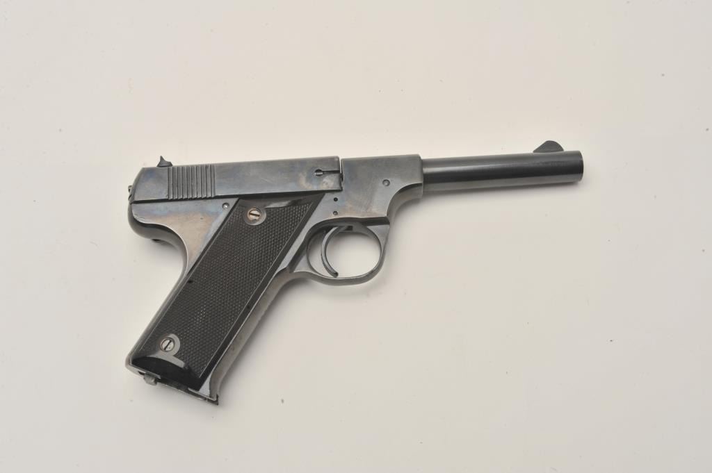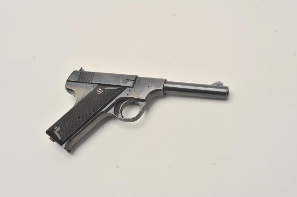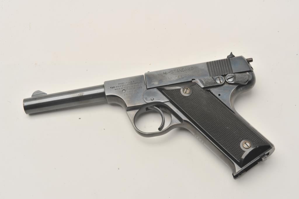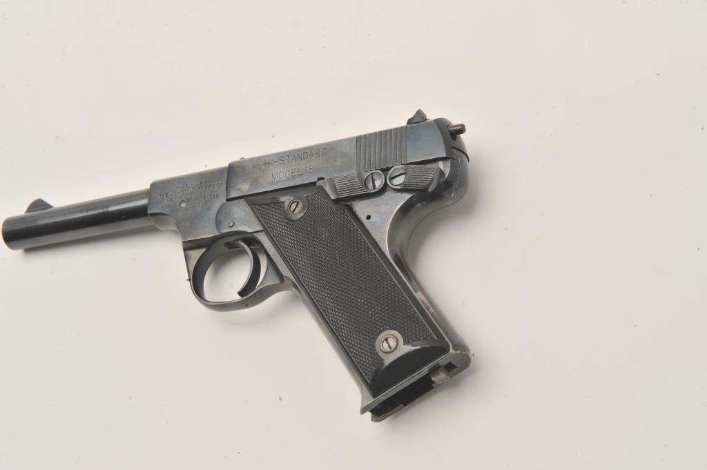 Hi-Standard Model B semi-automatic pistol, .22 Long Rifle, Serial #27028. The pistol is in very good to nearly fine overall condition with a 4 ½” barrel. The metal surfaces retain nearly all of their bluefinish with light handling marks noted. The checkered plastic grips are in very good condition with only storage marks. The bore is good, the action crisp and markings are sharp. The lot does not include a magazine. Est.: $400-$800. (Modern).