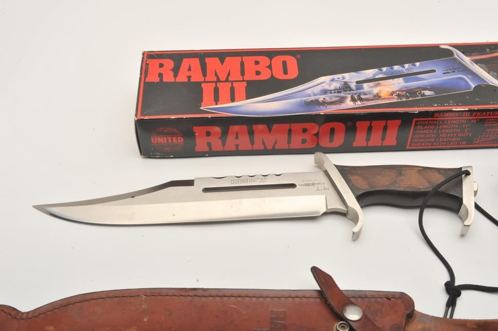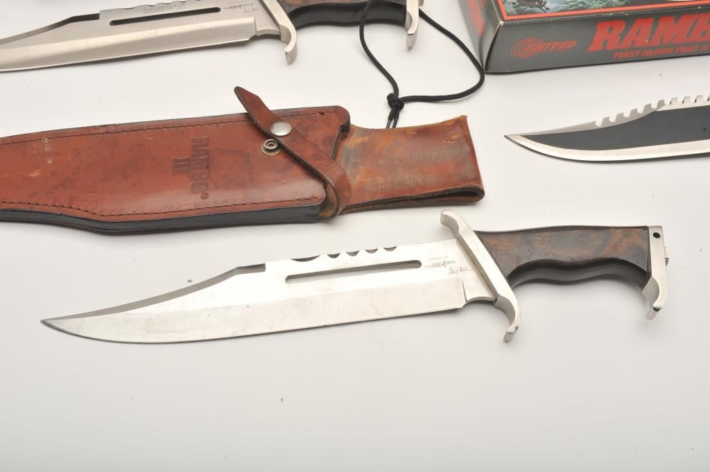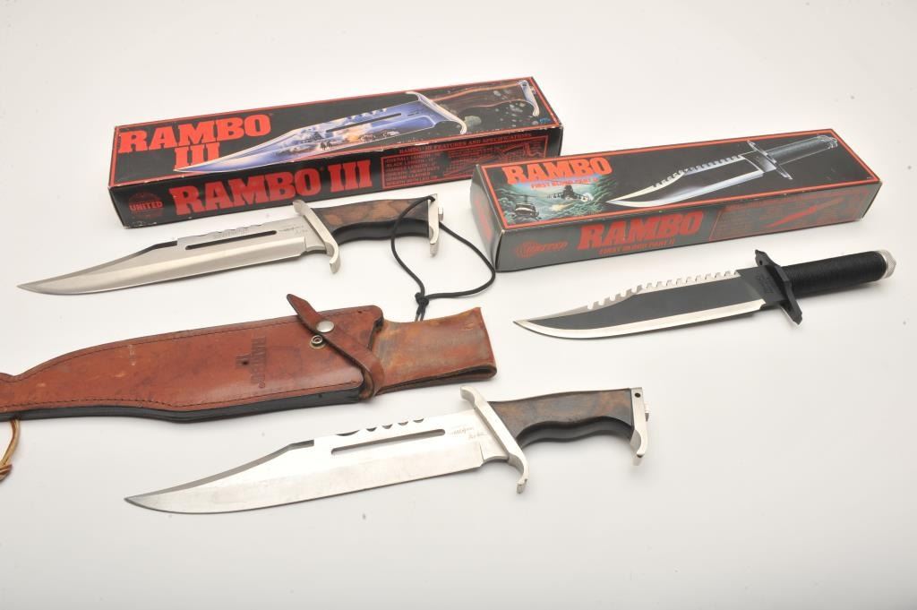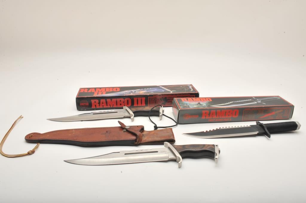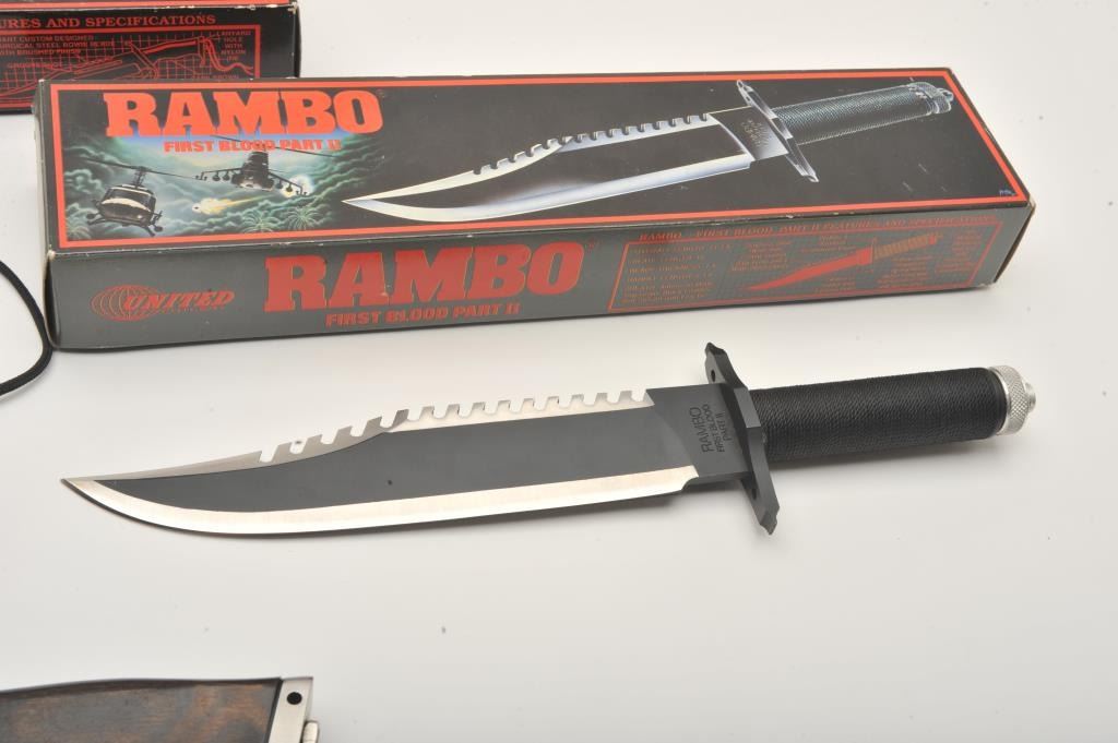 Lot of three Rambo knives. The lot consists of two Rambo III marked Bowie knives, each 16” in total length with an 11” blade. Both knives feature a large stainless handguard with smooth wood handles. Both knives are in good condition with two leather Rambo III marked leather sheaths and a factory box. The third knife is a large survival knife/ Bowie marked, “RAMBO FIRST BLOOD PART II”. The blade is finished in black matte with acord wrapped grip and threaded pommel with storage area in the grip. The knife appears as new with a black leather sheath and the factory box. Est.: $150-$300.