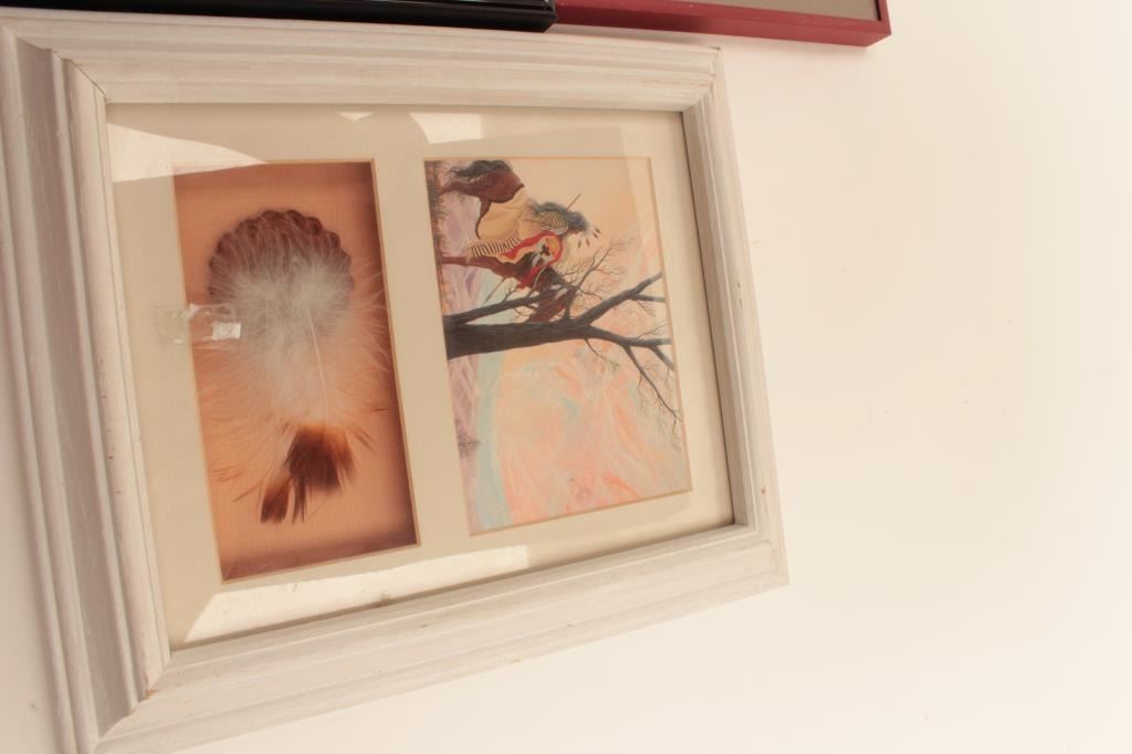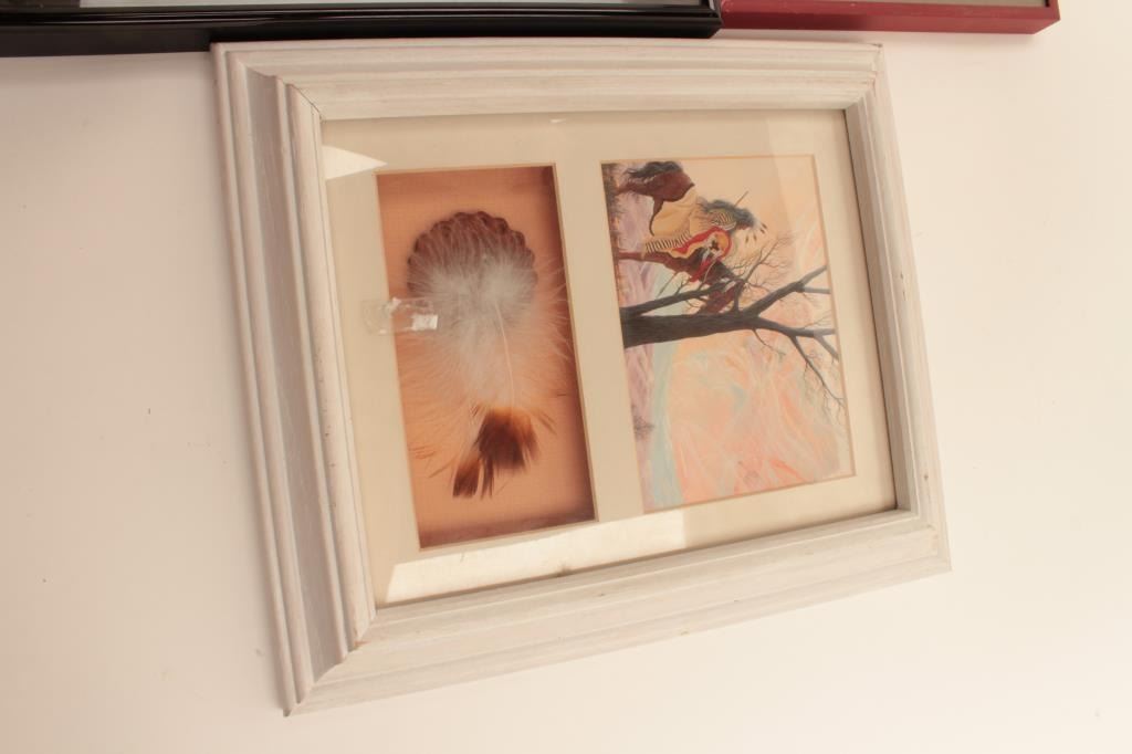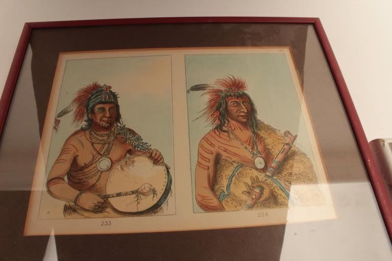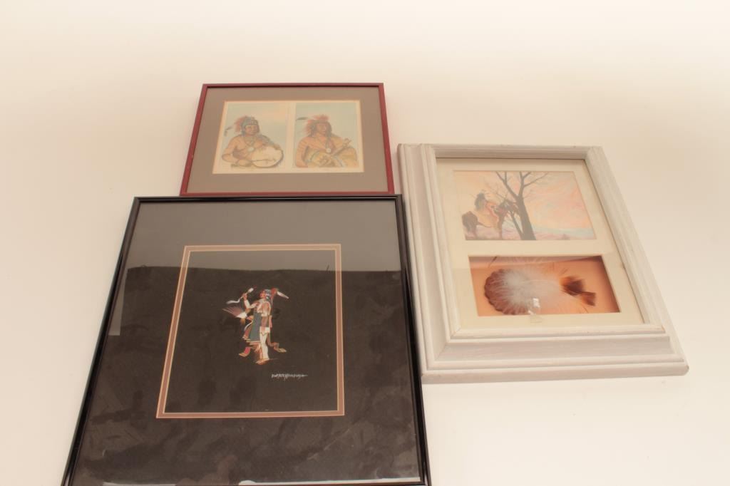 Lot of 3 small framed Native American pieces of artwork; one framed and matted of dancer signed Doc Tate Neva Quaya; one as a shadow box by William Rabbit and framed and matted showing 2 vintage North American Indians byGeorge Catlin. Est.: $125-$175.