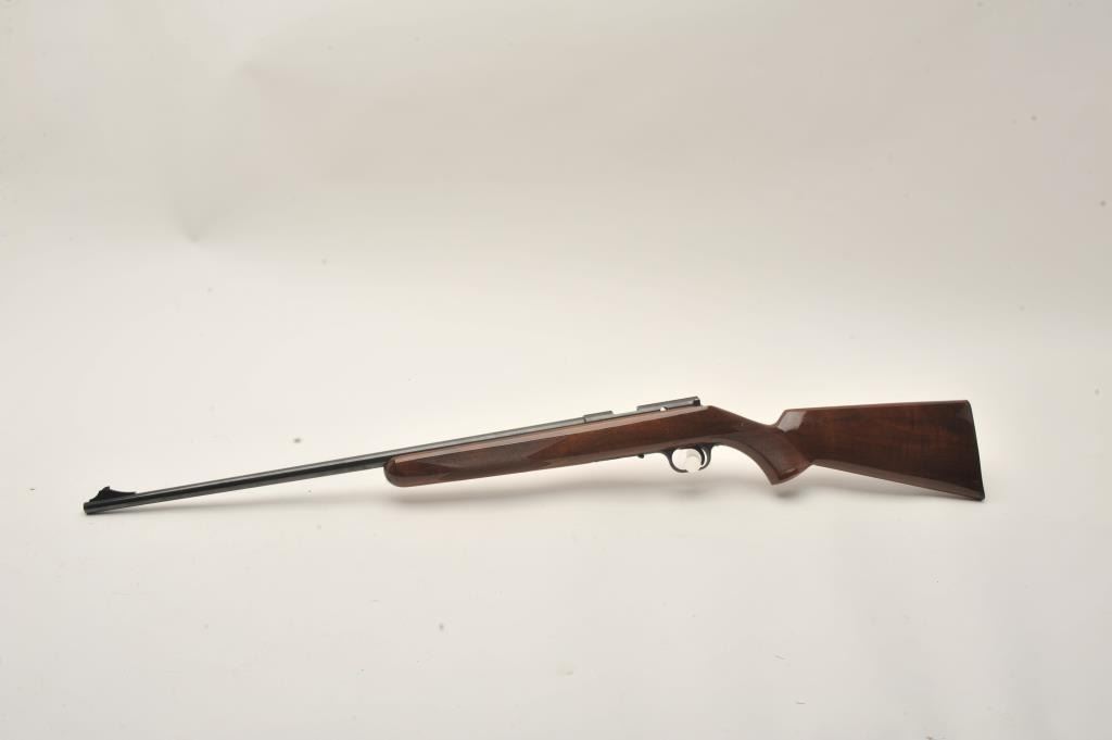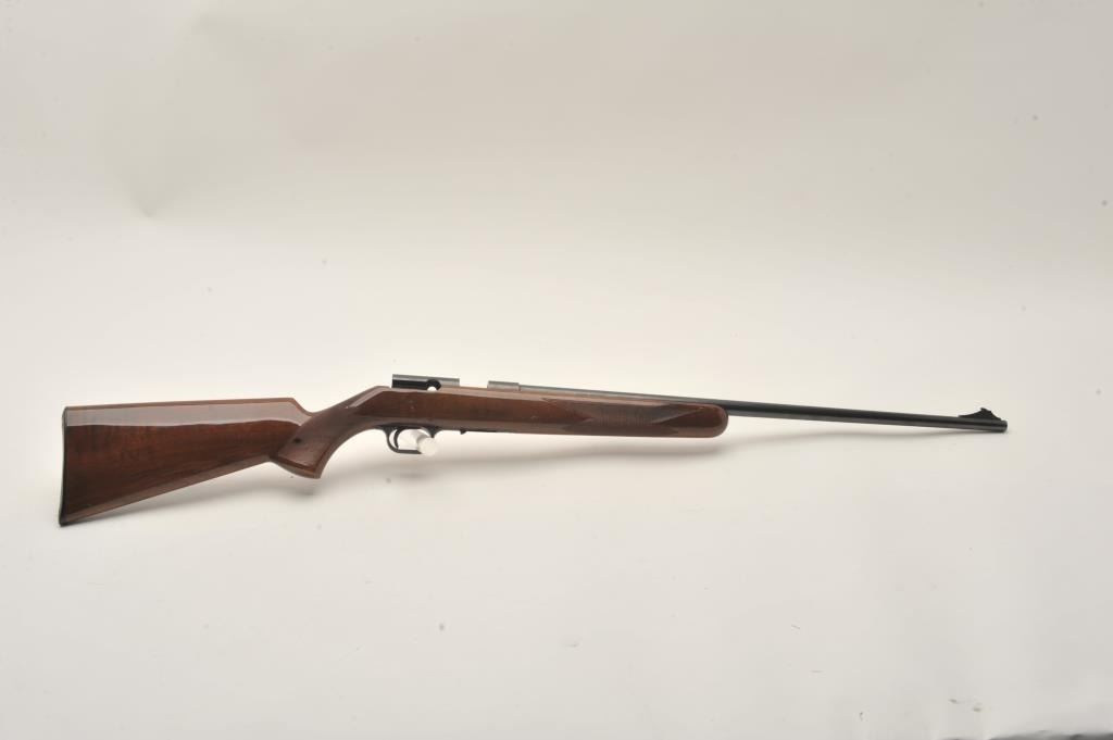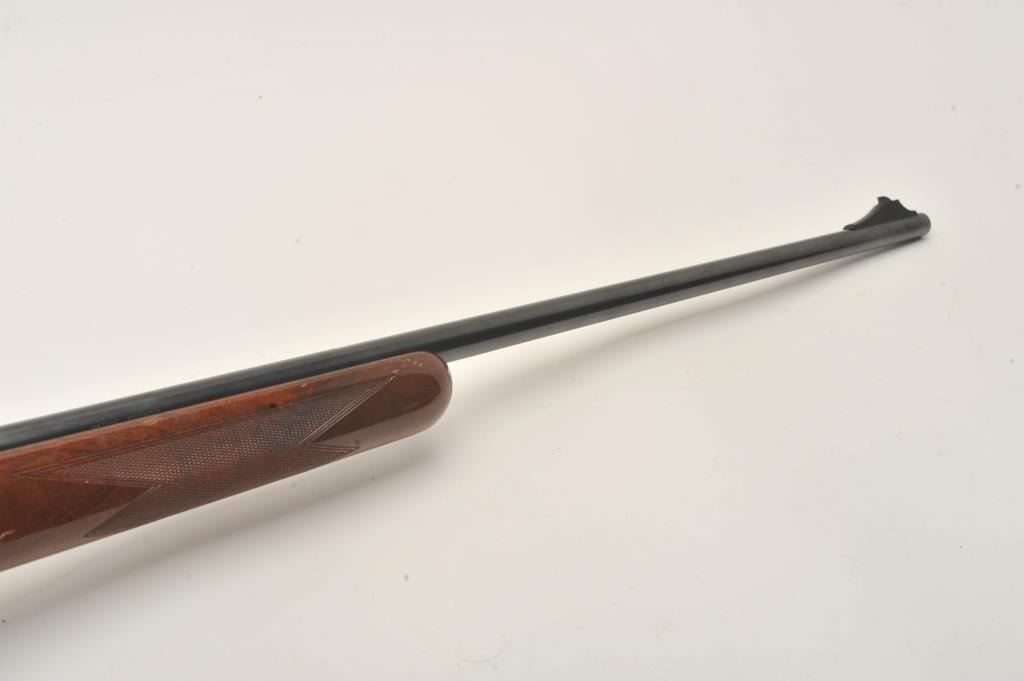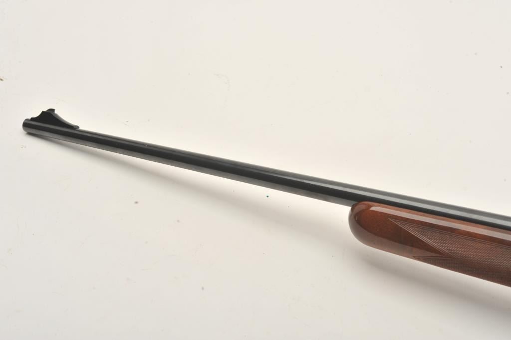 Browning T-Bolt rifle, .22LR caliber, 24” barrel, blued finish, checkered wood stock, missing bolt and magazine, S/N 19484X6, majority of original blued finish remaining, very good + bore, good to very good woodstock with some scattered nicks and mars from storage. (Modern). Est.: $200-$300.