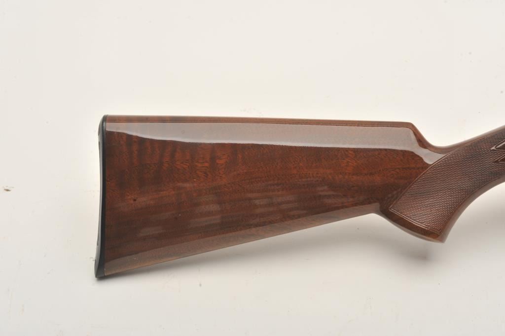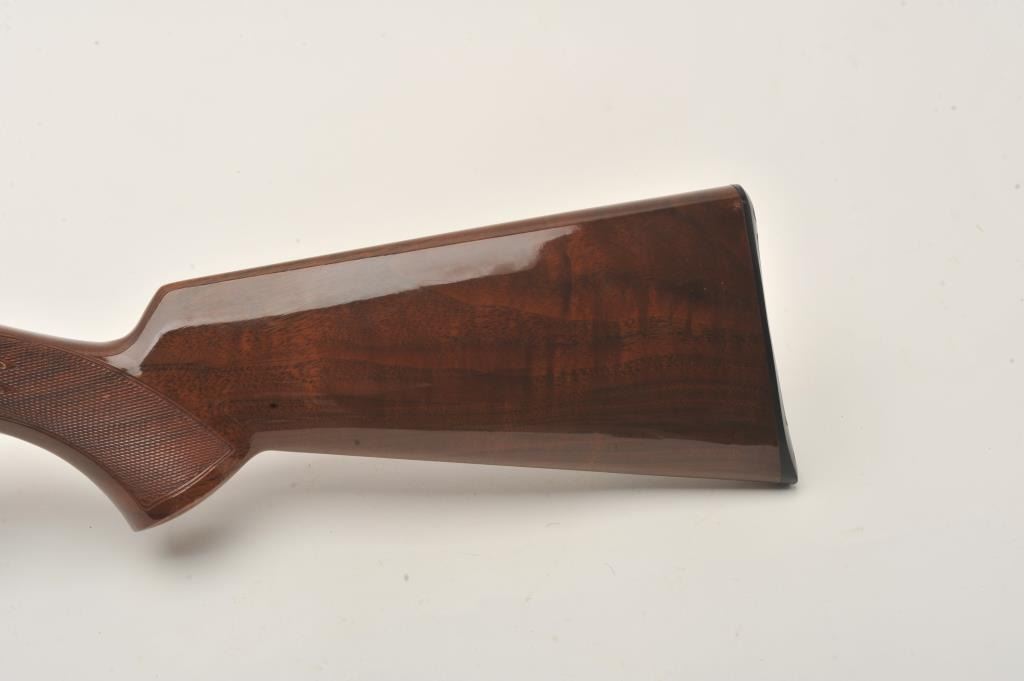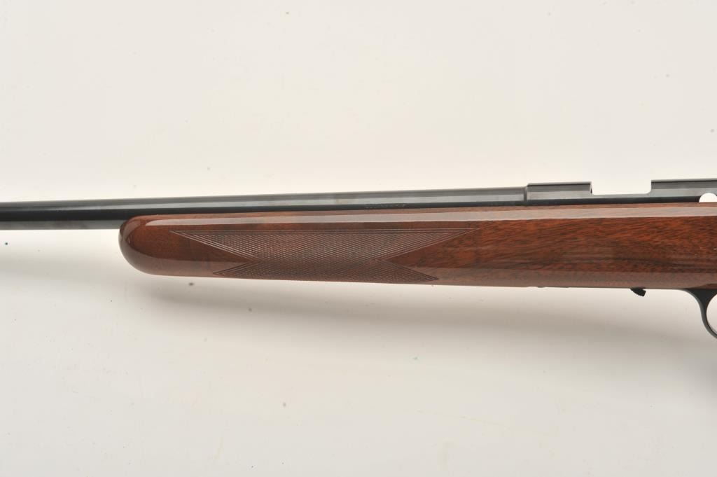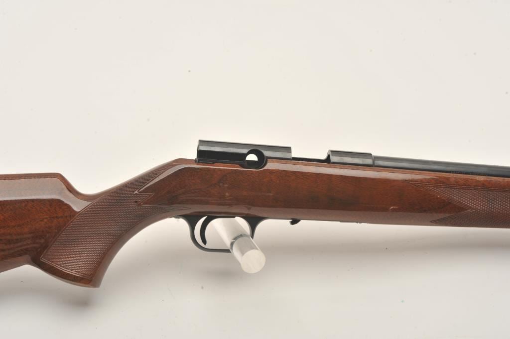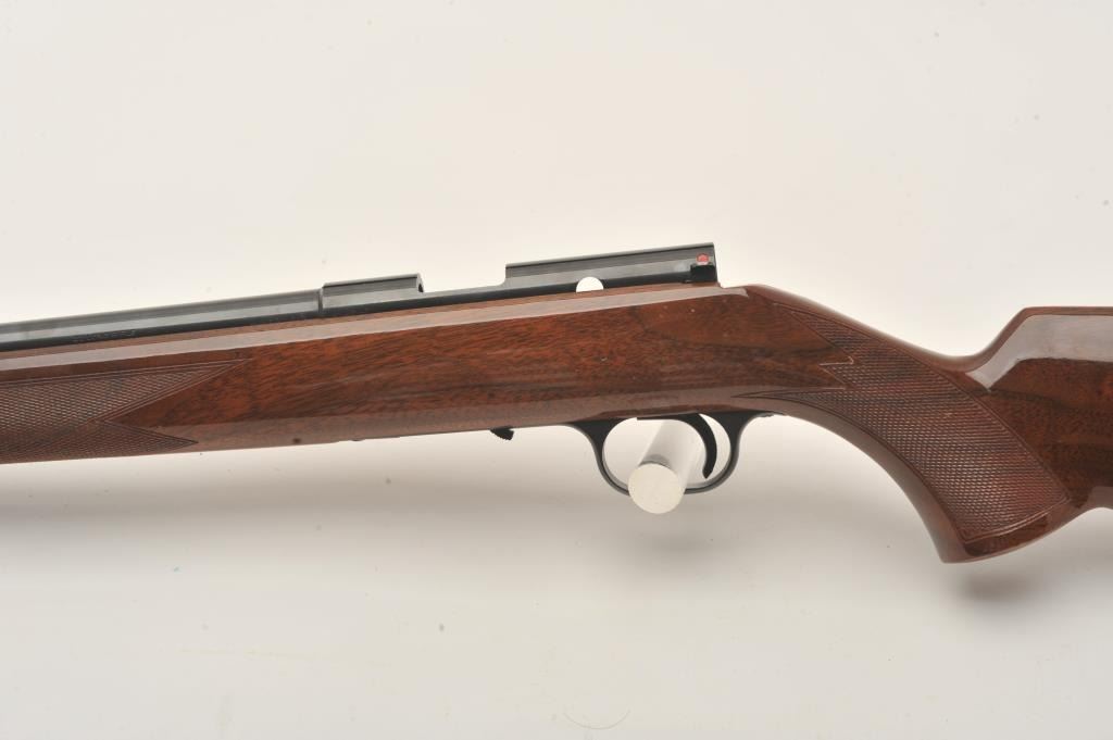 Browning T-Bolt rifle, .22LR caliber, 24” barrel, blued finish, checkered wood stock, missing bolt and magazine, S/N 19484X6, majority of original blued finish remaining, very good + bore, good to very good woodstock with some scattered nicks and mars from storage. (Modern). Est.: $200-$300.