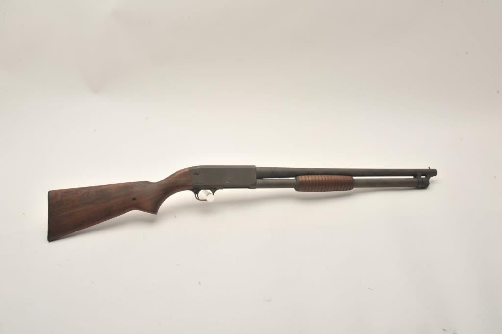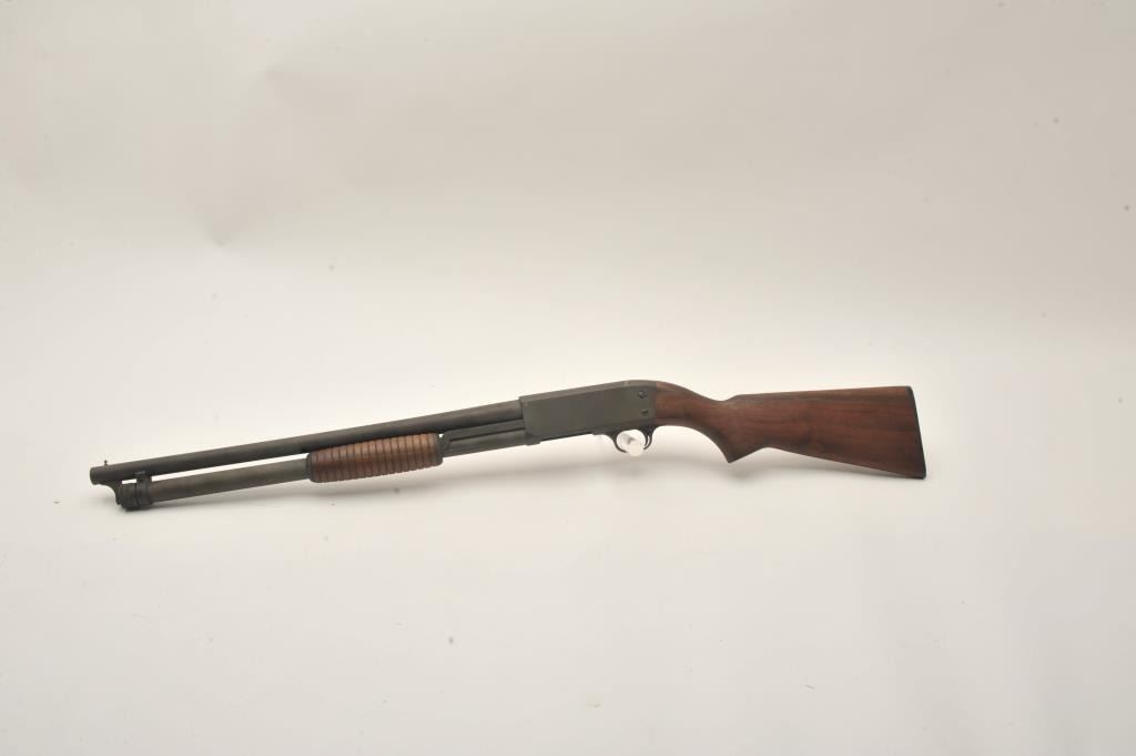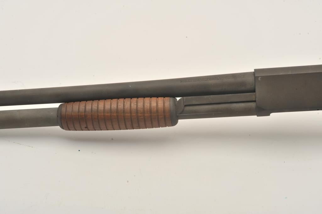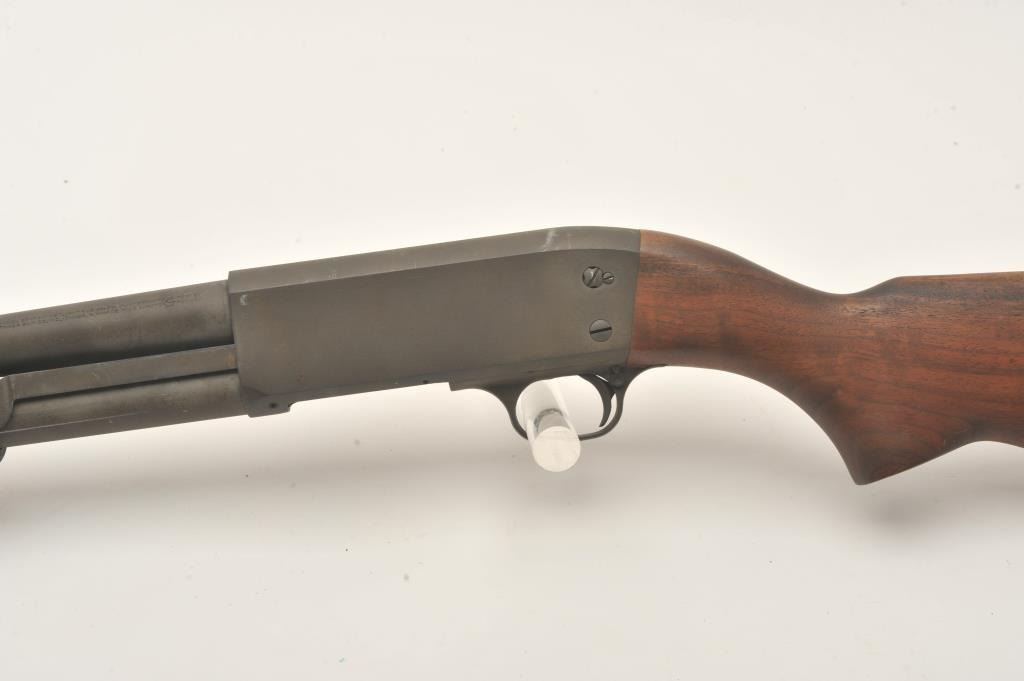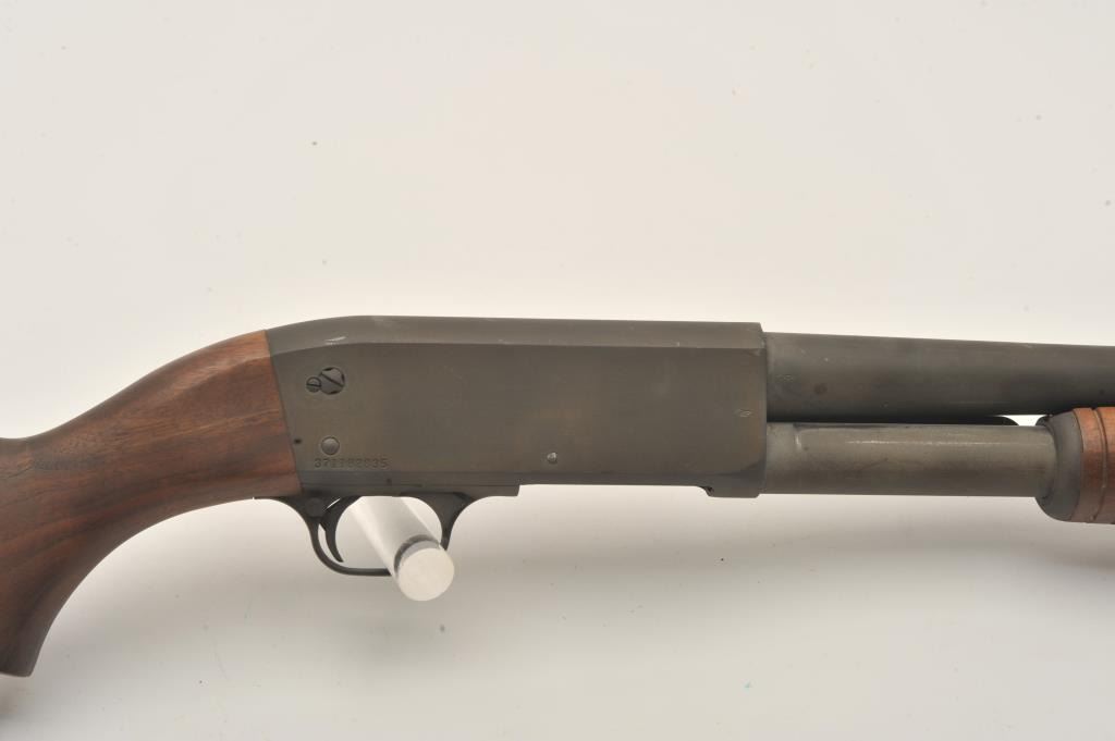 Ithaca Model 37 pump action shotgun, 12 gauge, 20” barrel, parkerized finish, wood stocks, S/N 371182835; some “frosting” to finish on barrel, tube and receiver, fine bore, crisp action, sharp markings and verygood ++ wood. (Modern). Est.: $200-$400.