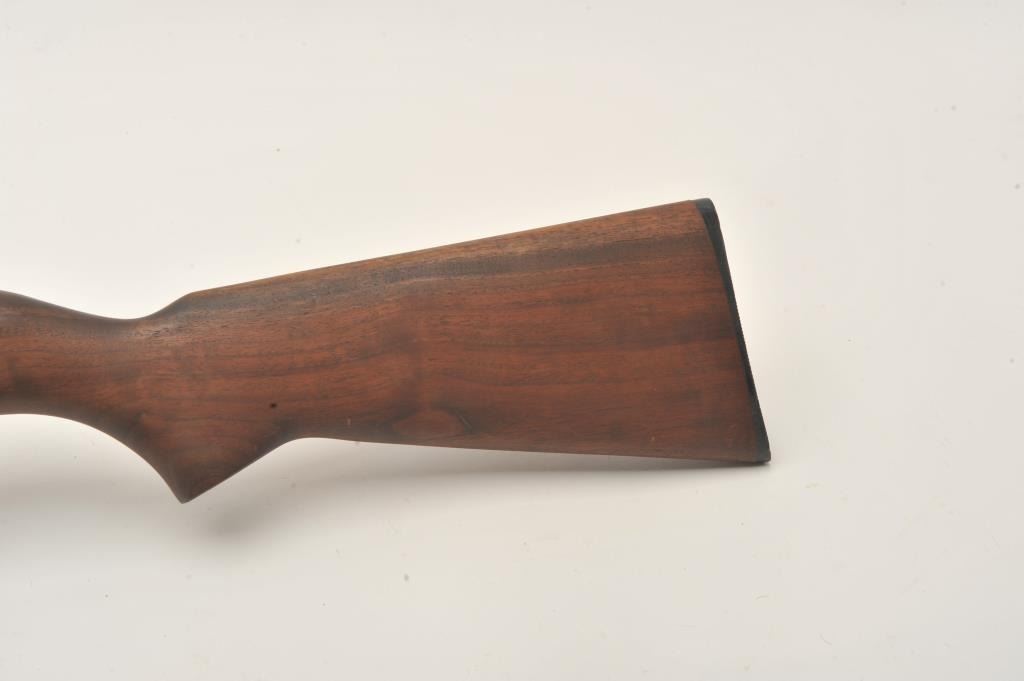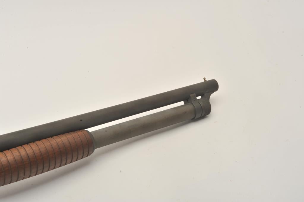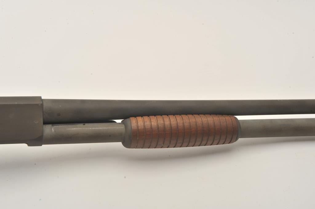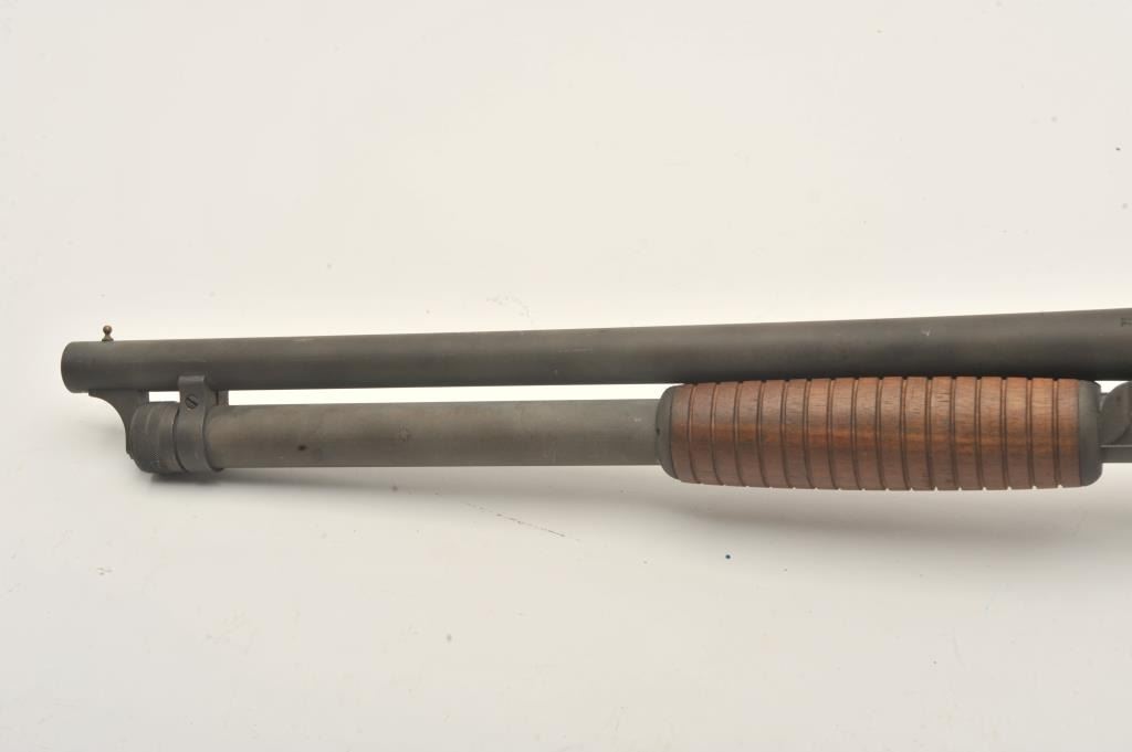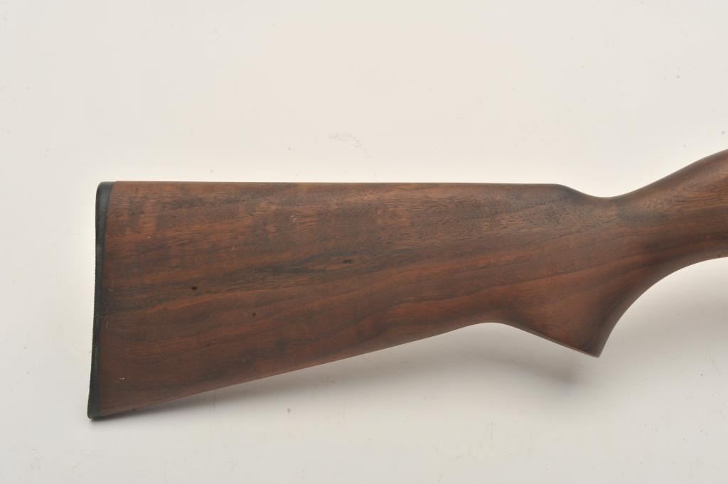 Ithaca Model 37 pump action shotgun, 12 gauge, 20” barrel, parkerized finish, wood stocks, S/N 371182835; some “frosting” to finish on barrel, tube and receiver, fine bore, crisp action, sharp markings and verygood ++ wood. (Modern). Est.: $200-$400.