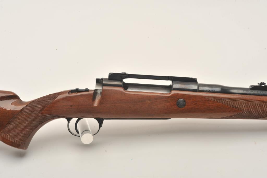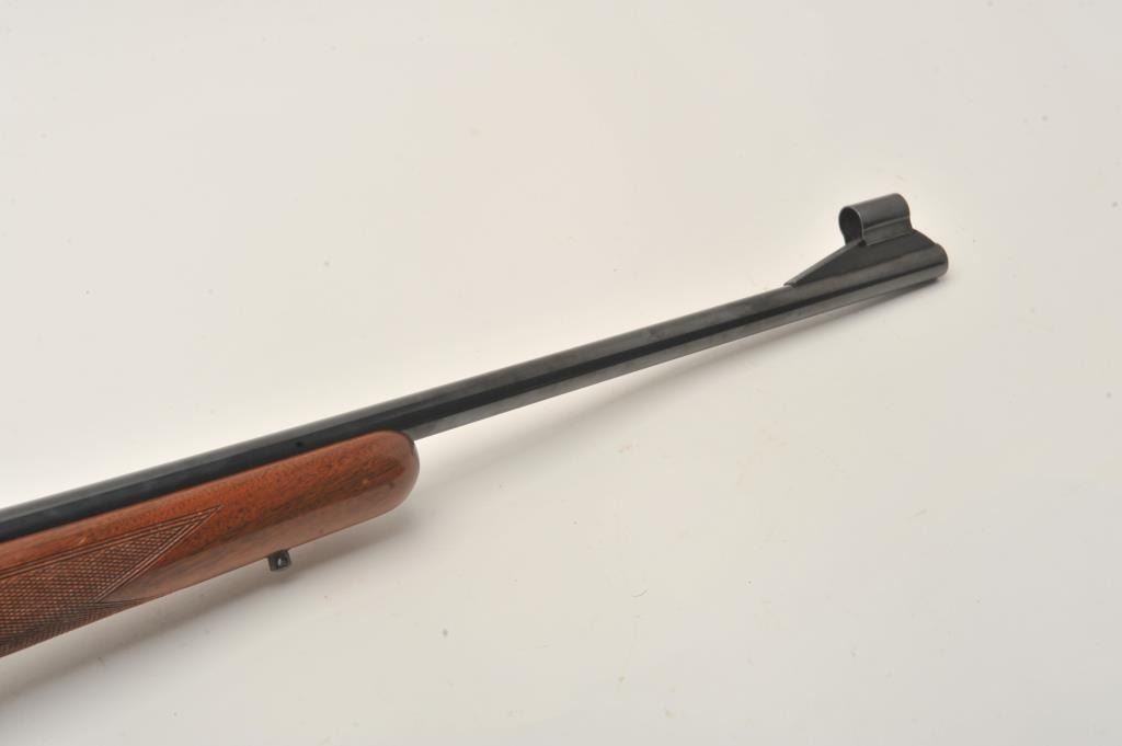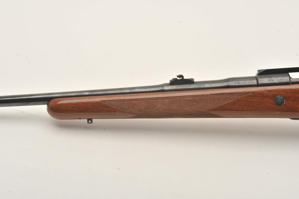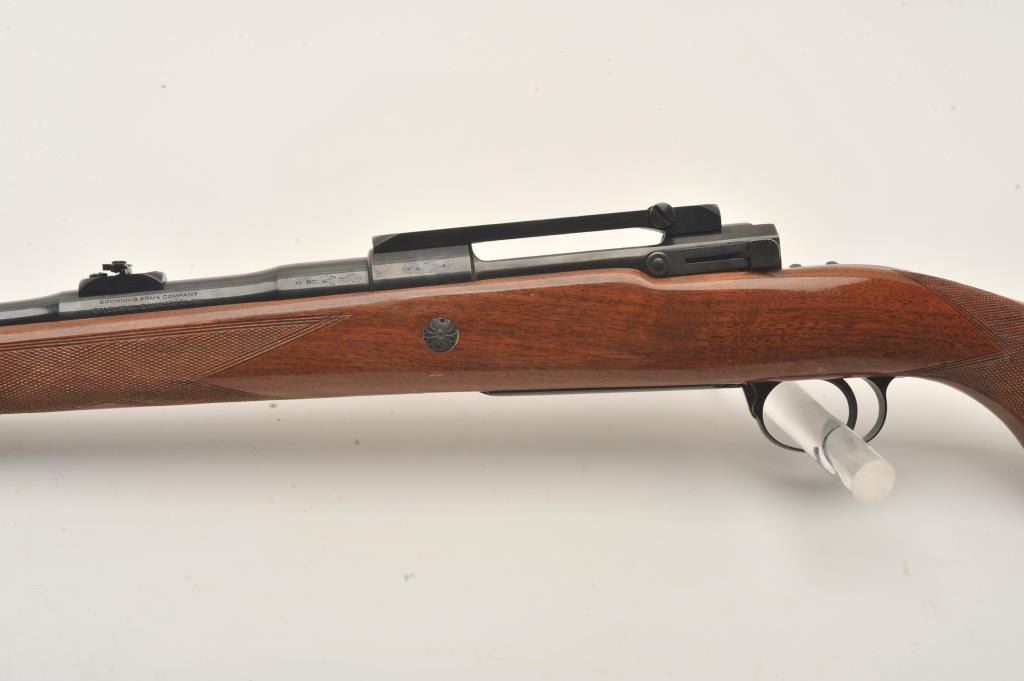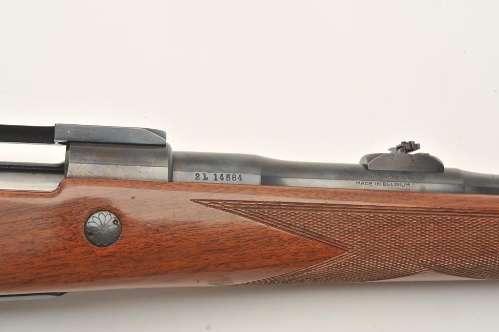 Belgian-made Browning Safari bolt action rifle, missing bolt, 264 Win. Mag. caliber, 23” barrel, blued finish, checkered wood stock, S/N 2L14584; very good bore, majority of original finish to metal surfaces, crispmarkings, good wood with several spots of re-finish to right side of butt stock. (Modern). Est.: $300-$600.