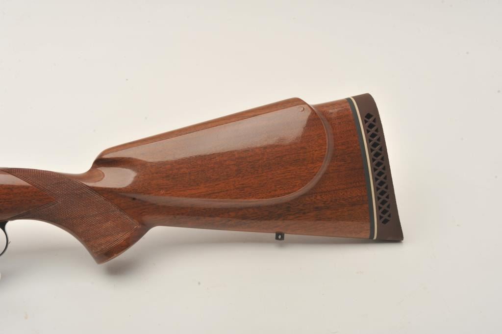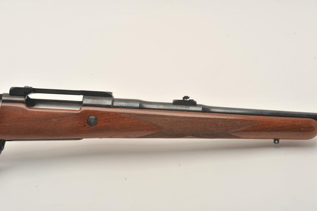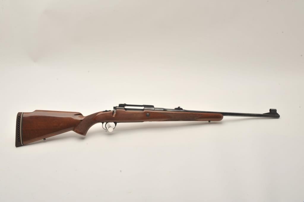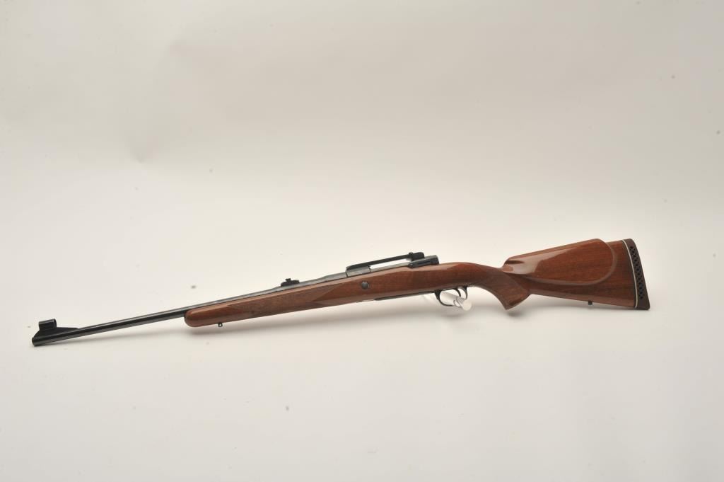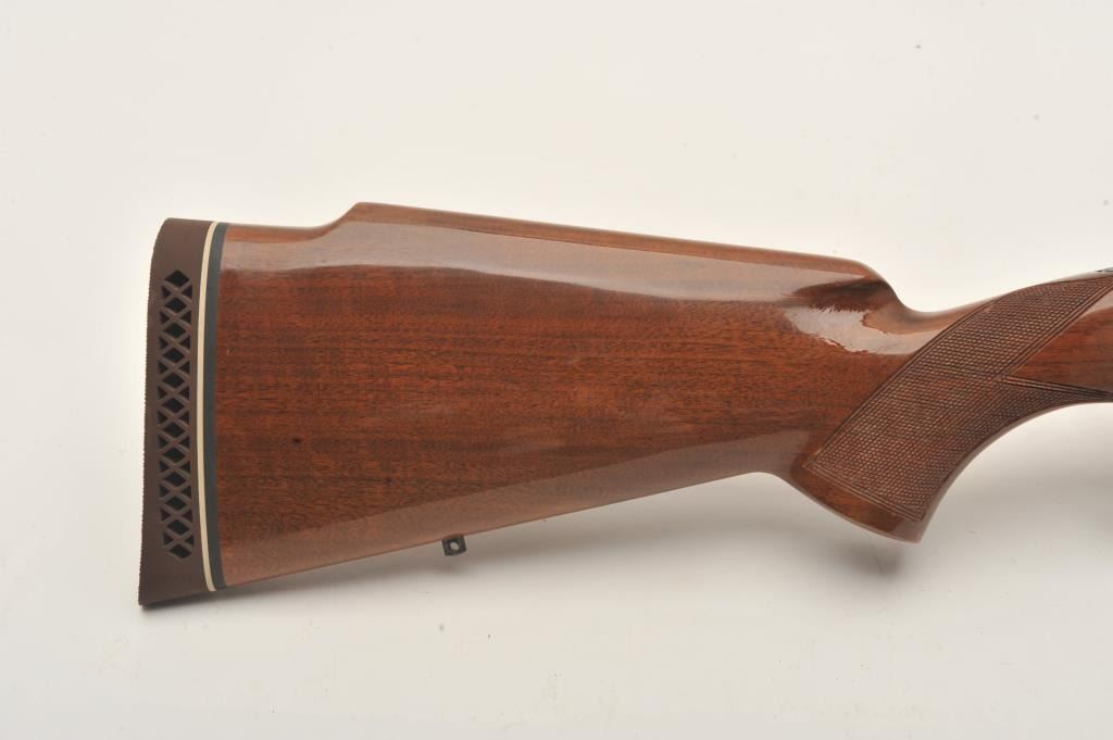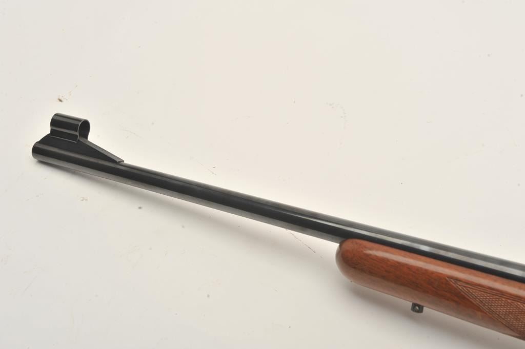 Belgian-made Browning Safari bolt action rifle, missing bolt, 264 Win. Mag. caliber, 23” barrel, blued finish, checkered wood stock, S/N 2L14584; very good bore, majority of original finish to metal surfaces, crispmarkings, good wood with several spots of re-finish to right side of butt stock. (Modern). Est.: $300-$600.