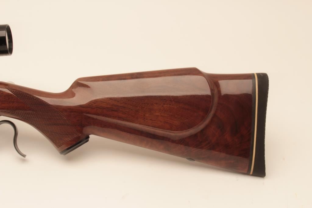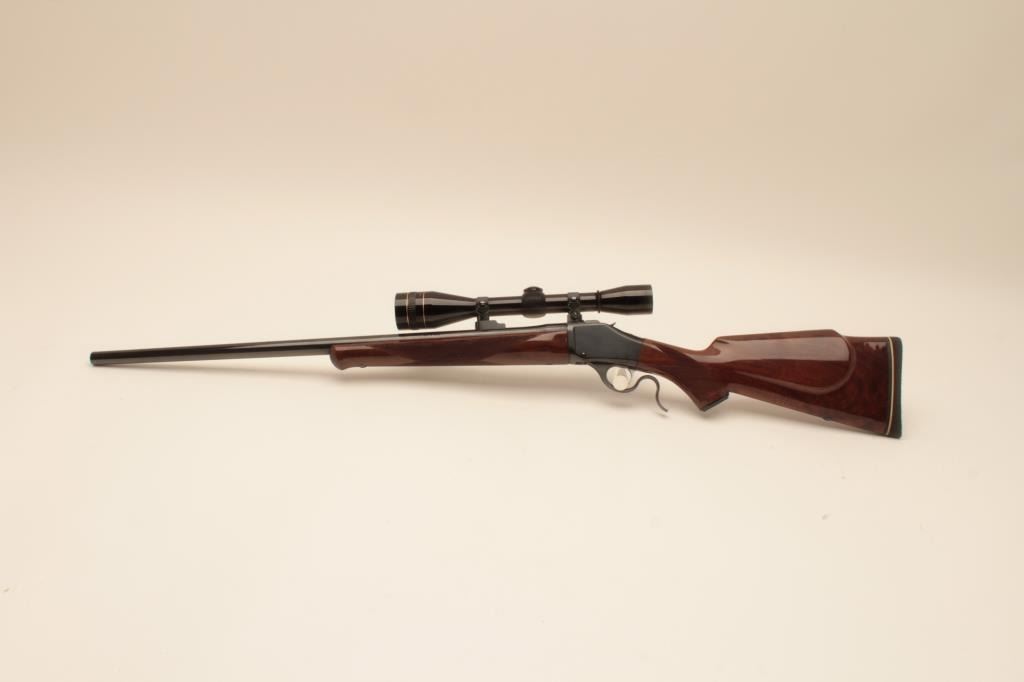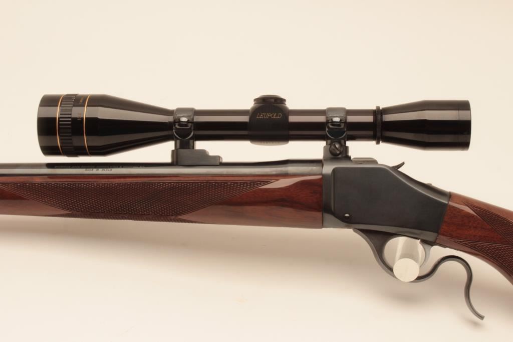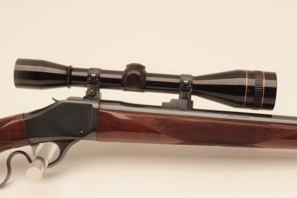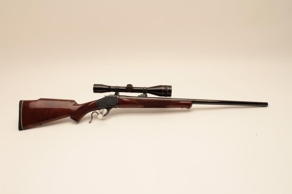 Browning High Wall (M78) Rifle in .22-250 caliber with a 26” round barrel mounted with Leupold 2 ½ x 10x scope on Browning mounts. Recoil pad added. Fine to excellent used condition. 97%-99% overall. Long out ofproduction and desirable. S/N 2188RT147. (Modern) Est.: $600-$1200