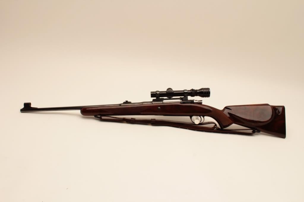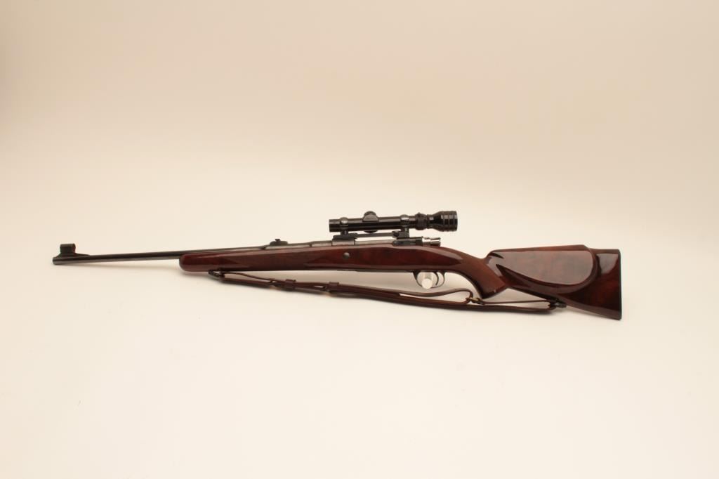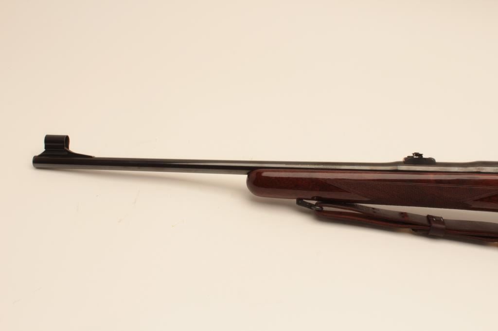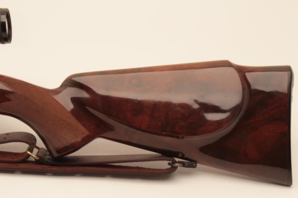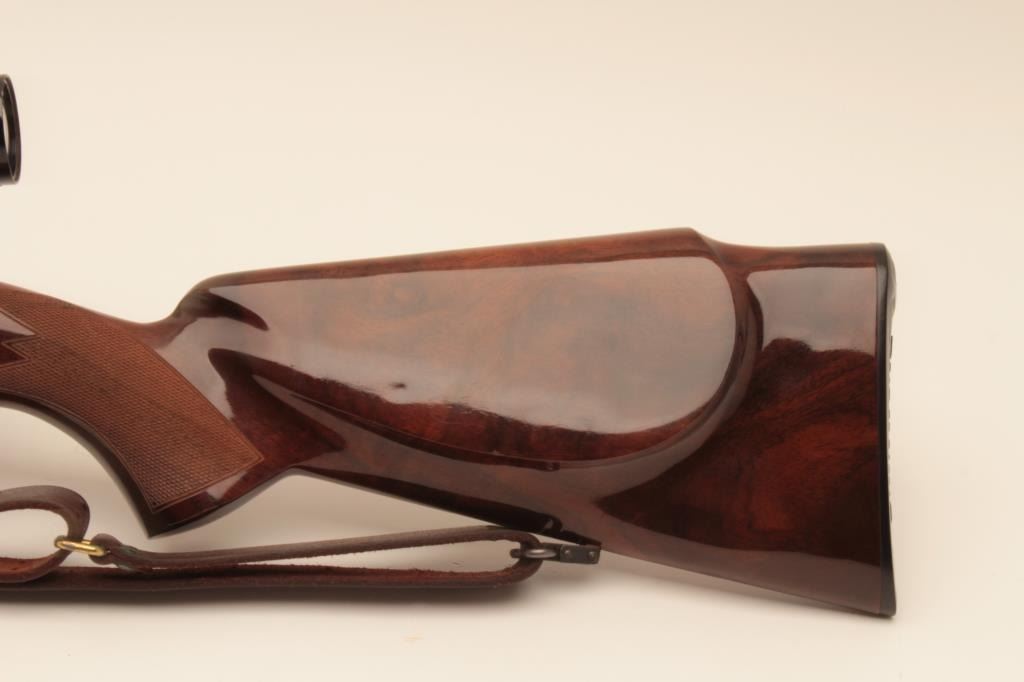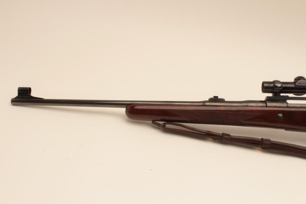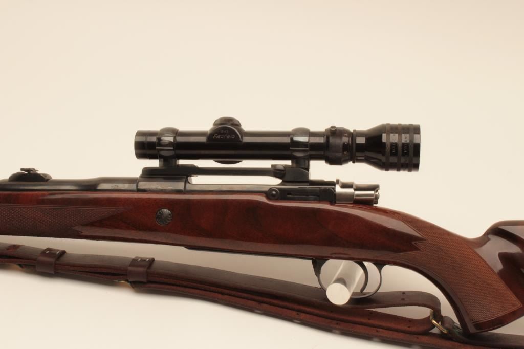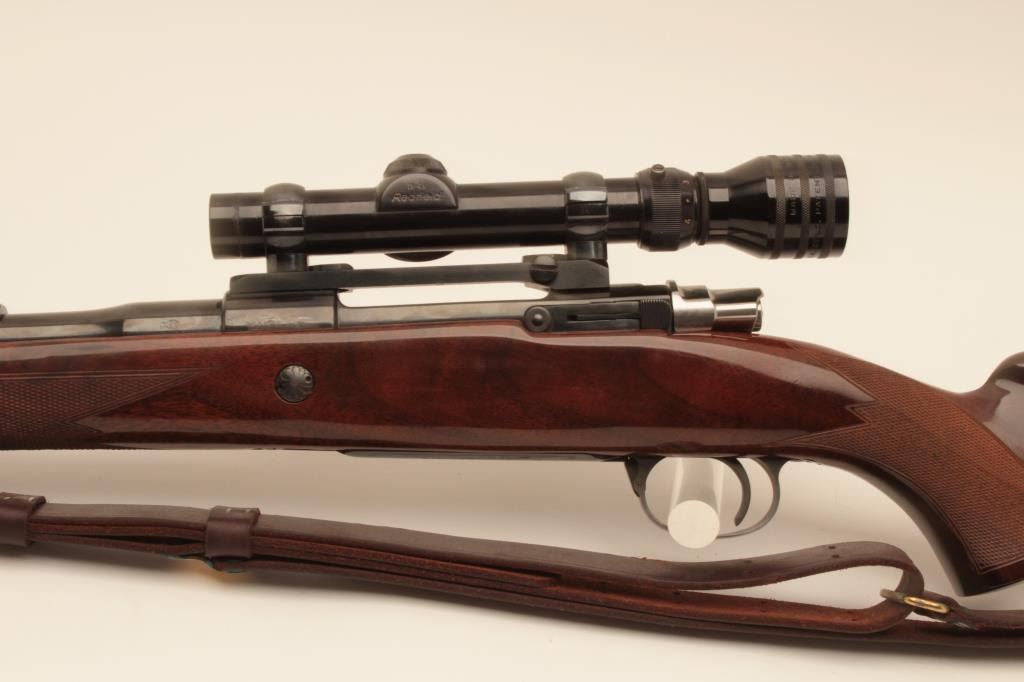Belgium Browning Safari grade .30-06 caliber bolt action rifle mounted with Redfield 1x4 scope on Redfield mount. Quick detachable sling swivels and sling included. The stock is professionally re-checkered and refinished with nice grain to wood and original butt plate. Folding rear sight added. Very good plus to almost fine used condition with small loss of finish on the left side of the action near breech. S/N 65646L73. Interiorand bore are excellent. (Modern) Est.: $700-$1400
