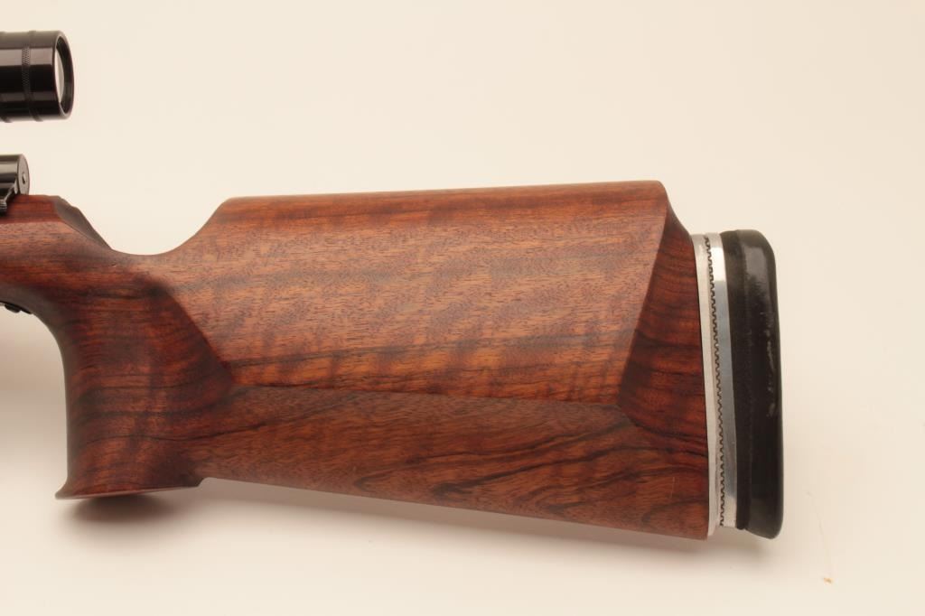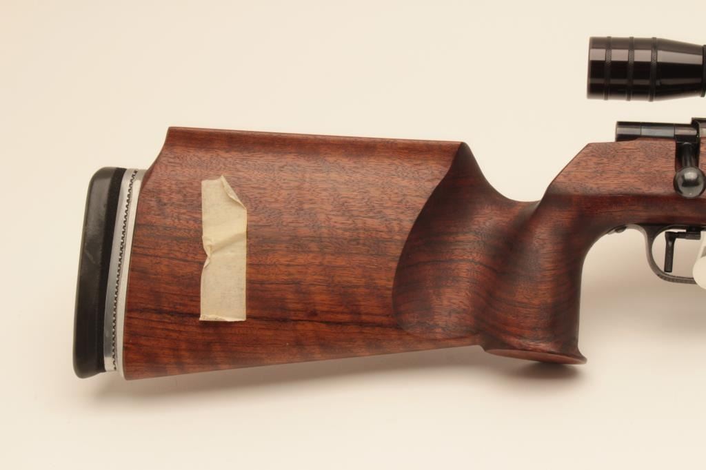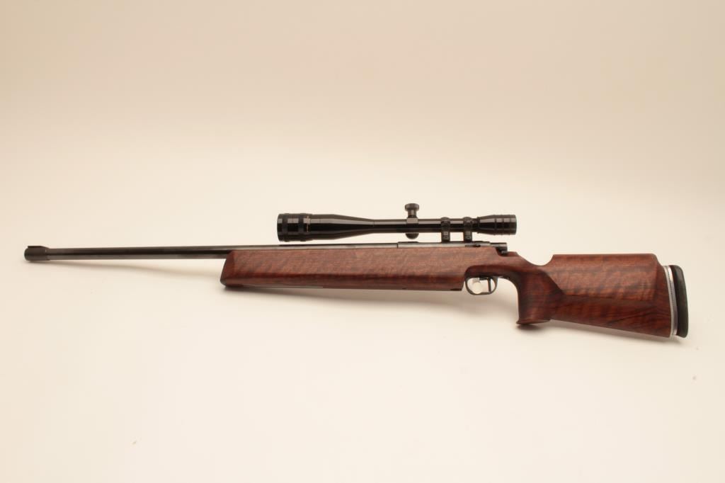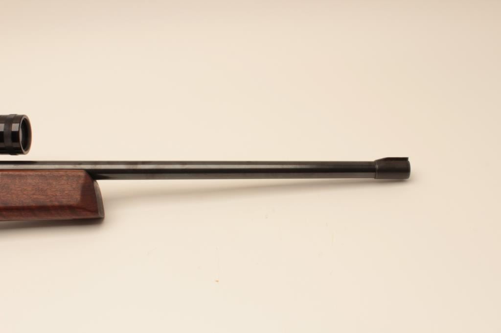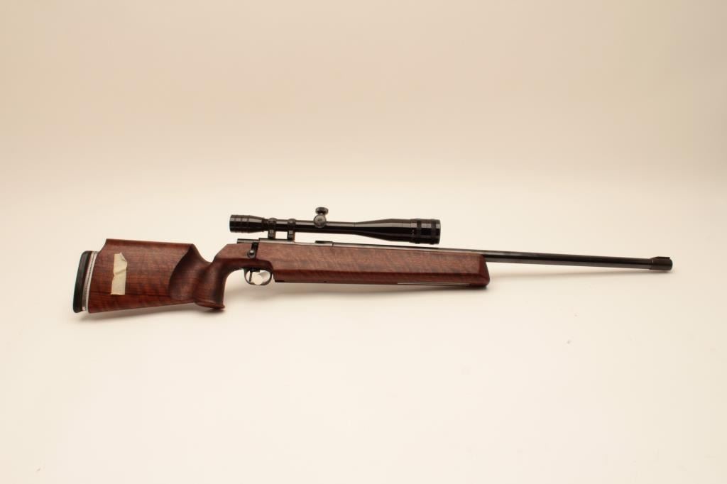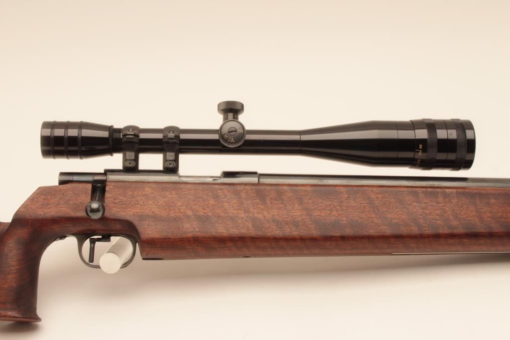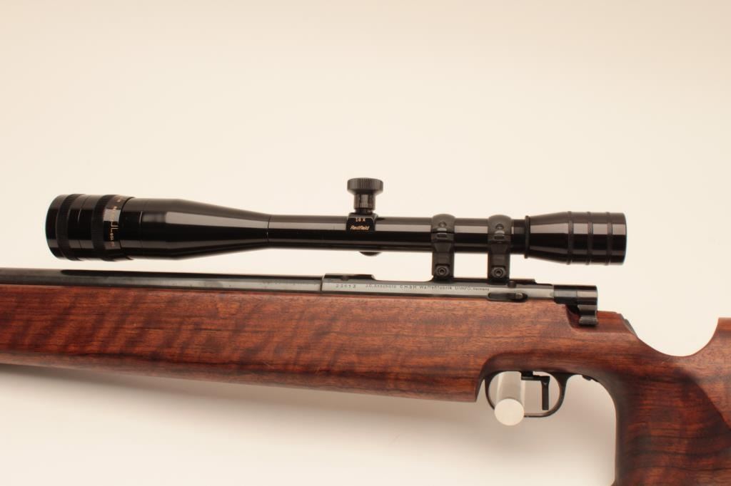 J.G. Anschutz-Ulm Germany .22 caliber match rifle, S/N 23613 mounted with 16x Redfield target scope. The heavy round barrel measures 28” along with adjustable trigger, target stock with adjustable butt plate and aluminum lined forward slot for palm rest or sling. Fine to excellent overall showing minor use. 97%-99% overall. (Modern) Est.: $900-$1800