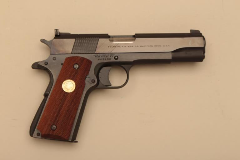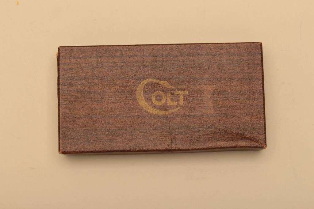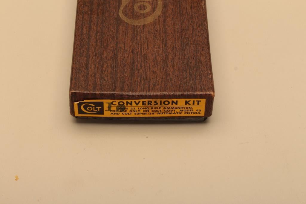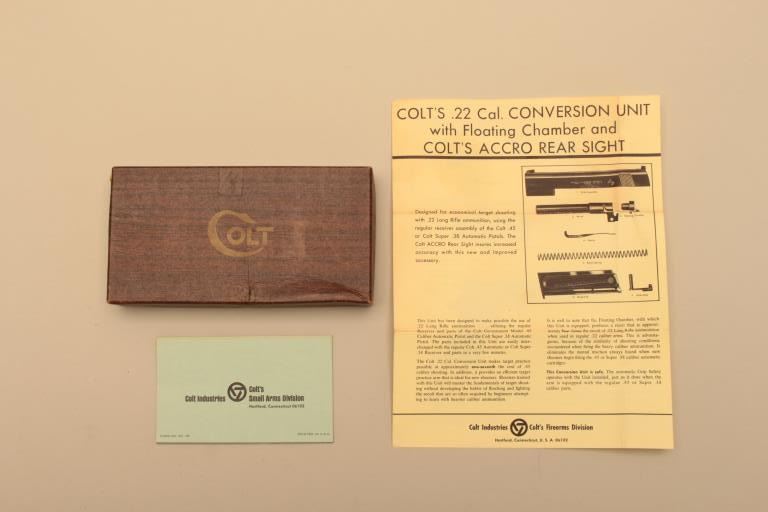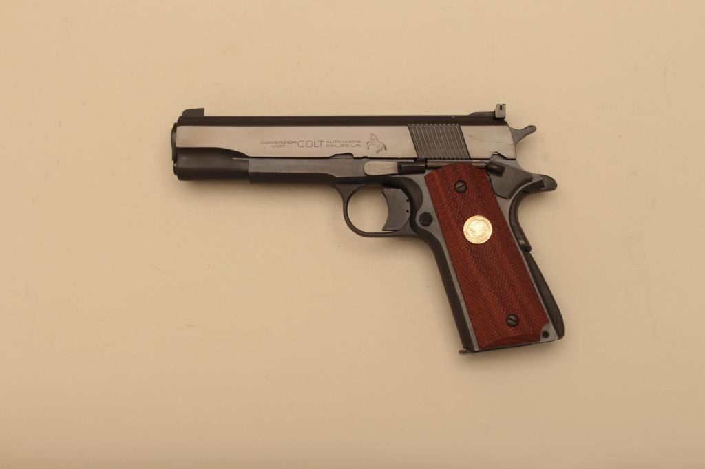 Auto Ordnance 1911A1 frame with Colt conversion unit slide in .22 caliber with a 4 ¾” barrel and checkered wood grips, S/N AOC51362. This pistol remains in very good plus condition with some light scratches from carry and use. The bore is good and the action good. With Colt marked magazine and Colt conversion box. (Modern/PPT) Est.: $800-$1600
