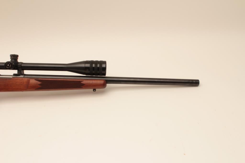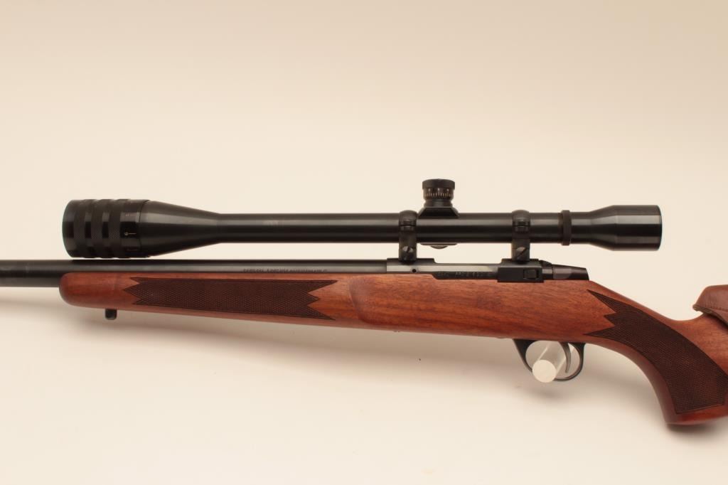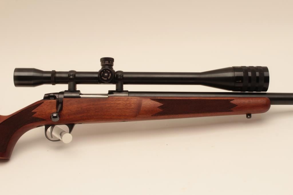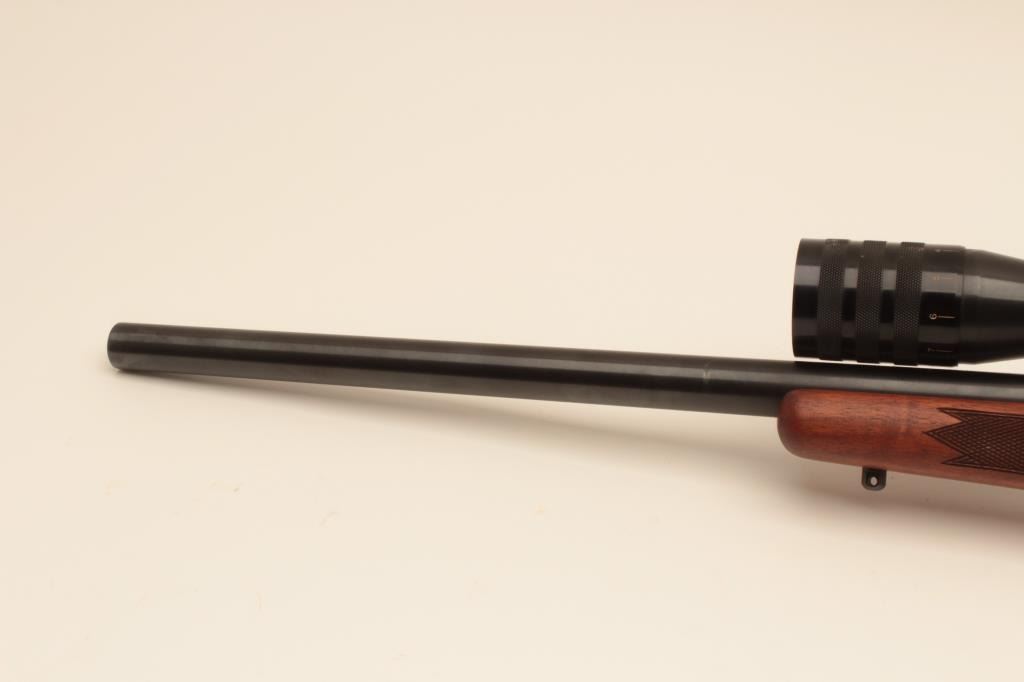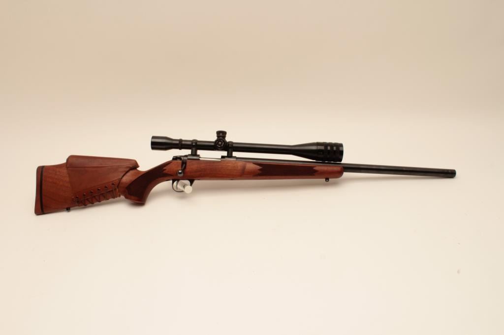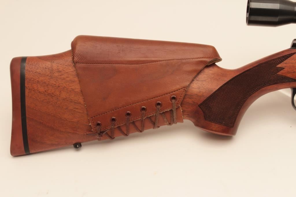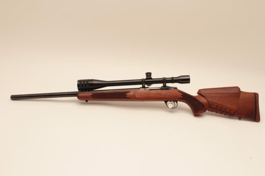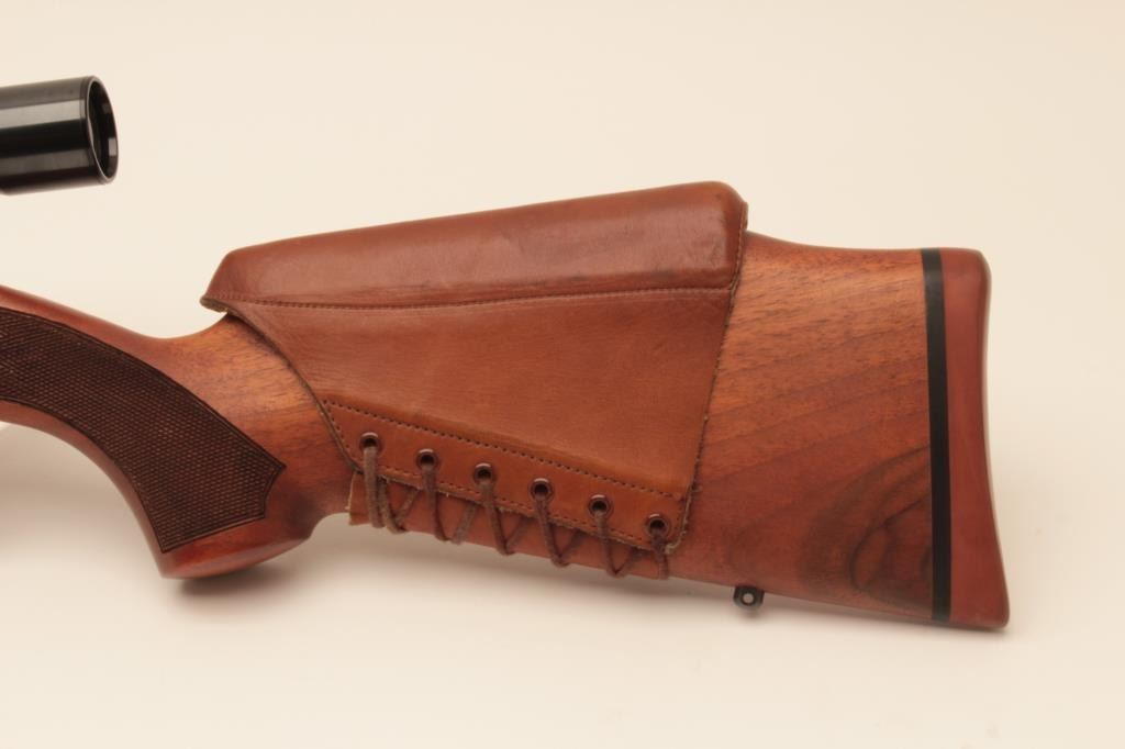 Sako heavy barrel 6mm PPC Finish made bolt action rifle, S/N PPCB630. The barrel measures 24” and mounted with a Weaver Microtrac T-25 scope. Removable leather cheek piece. Fine to excellent used condition.97%-99% overall. Very scarce and hard to find in this caliber and Finish made. (Modern) Est.: $900-$1800