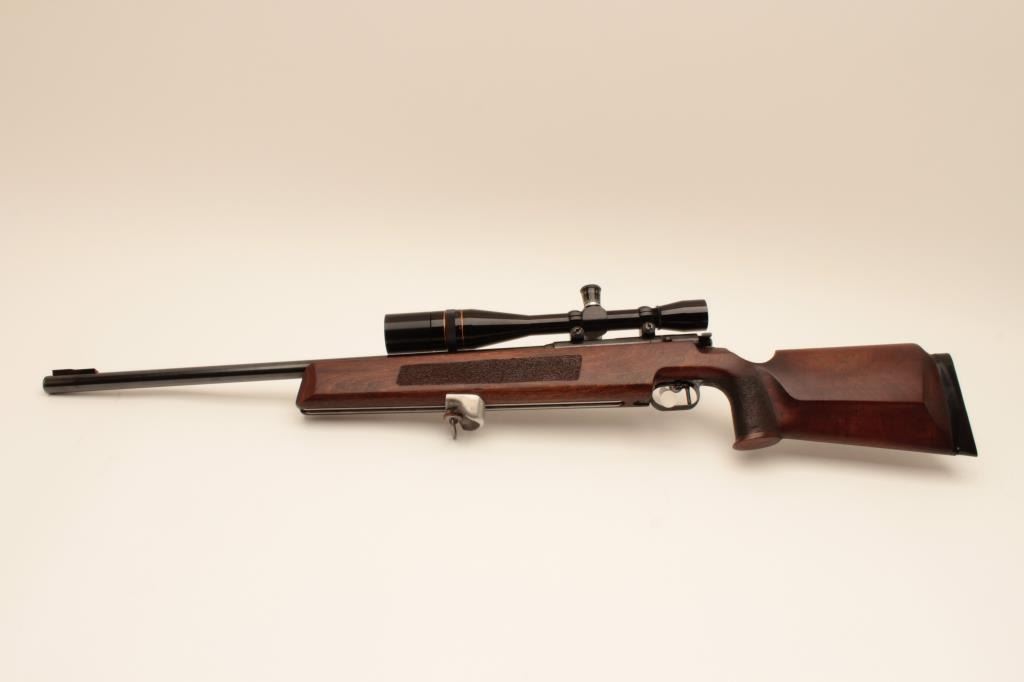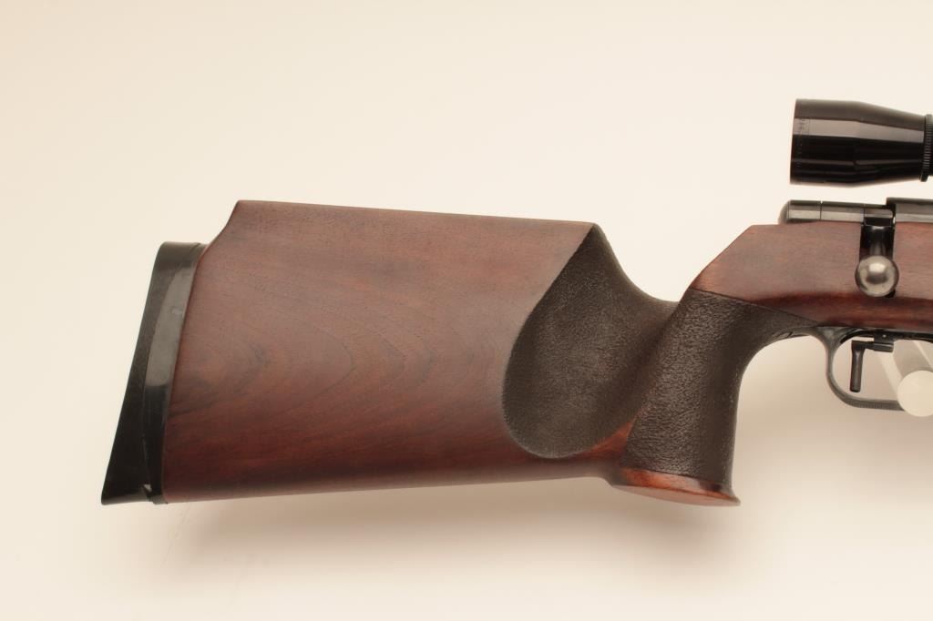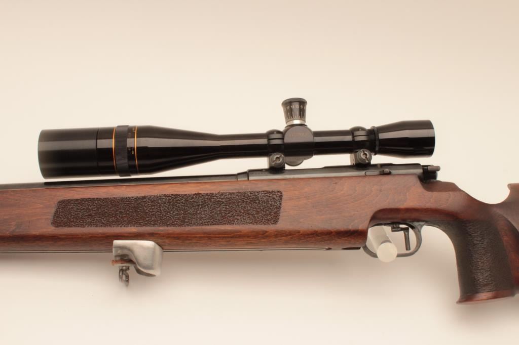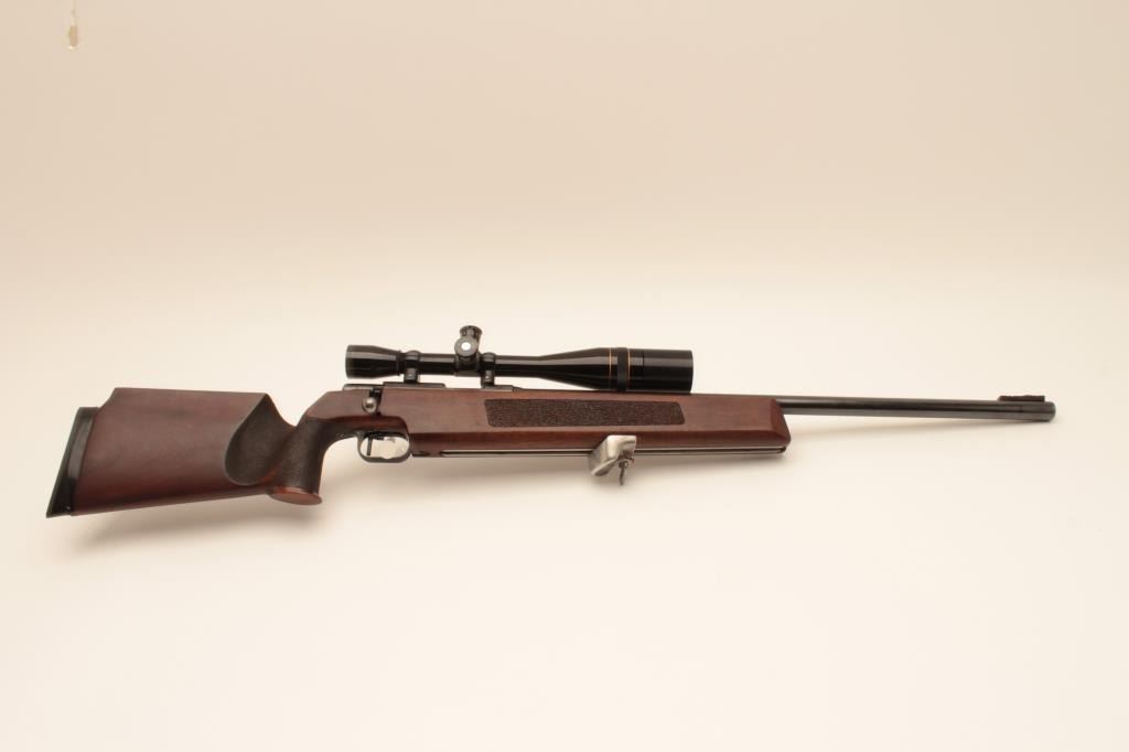 “J.G. Anshutz Ulm Germany” marked .22 caliber match rifle with full target features and mounted with Leupold 12 power target scope. 1970 proofed and dated, S/N 88089. Heavy 26” bull barrel, adjustable sling swivel(forward), adjustable trigger, target stock, and adjustable butt plate. Fine to excellent used condition. 95%-98% overall. Minor evidence of use only. (Modern) Est.: $900-$1800