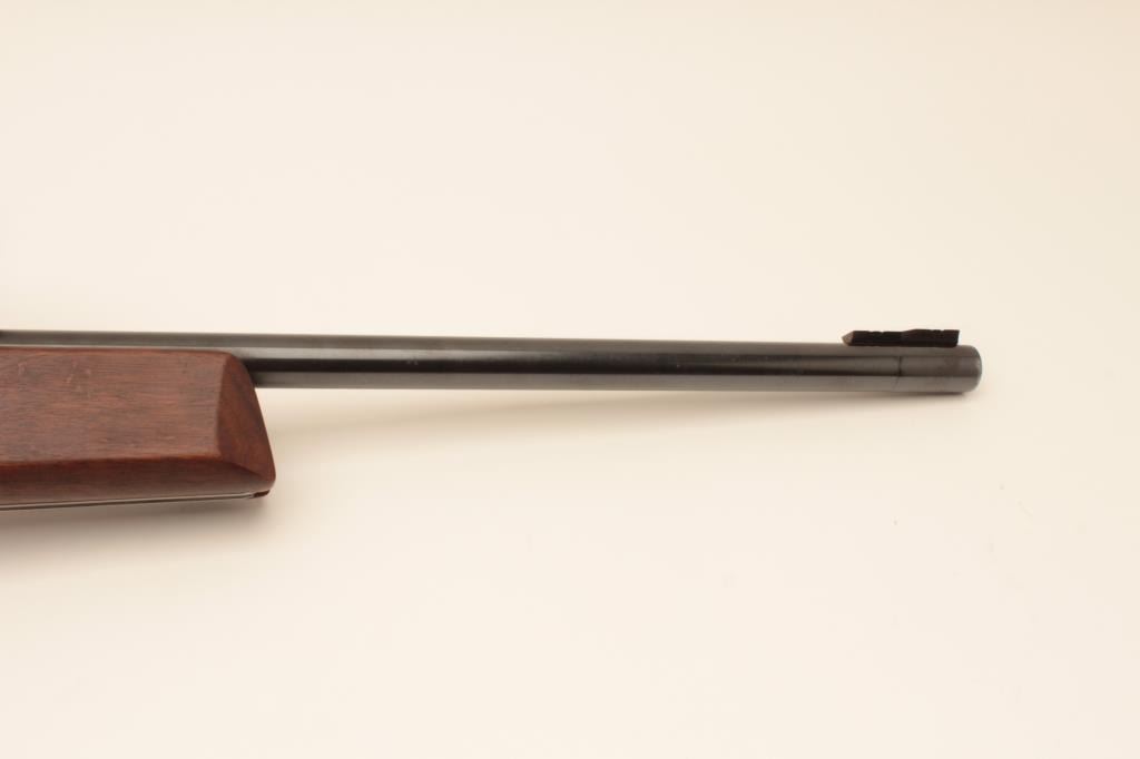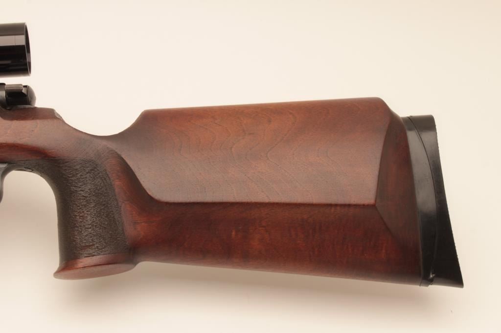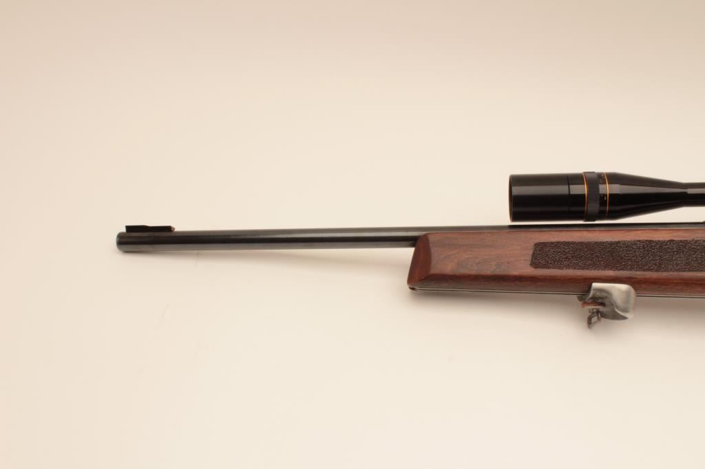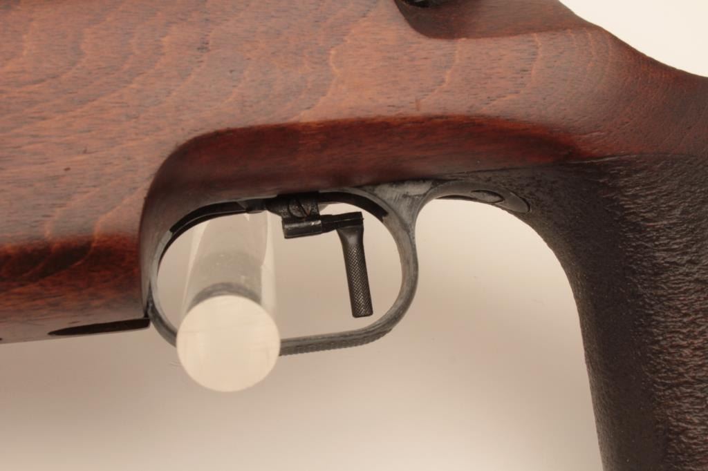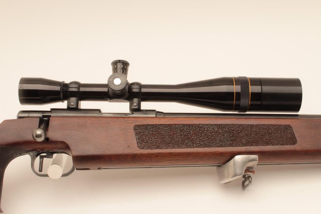 “J.G. Anshutz Ulm Germany” marked .22 caliber match rifle with full target features and mounted with Leupold 12 power target scope. 1970 proofed and dated, S/N 88089. Heavy 26” bull barrel, adjustable sling swivel(forward), adjustable trigger, target stock, and adjustable butt plate. Fine to excellent used condition. 95%-98% overall. Minor evidence of use only. (Modern) Est.: $900-$1800