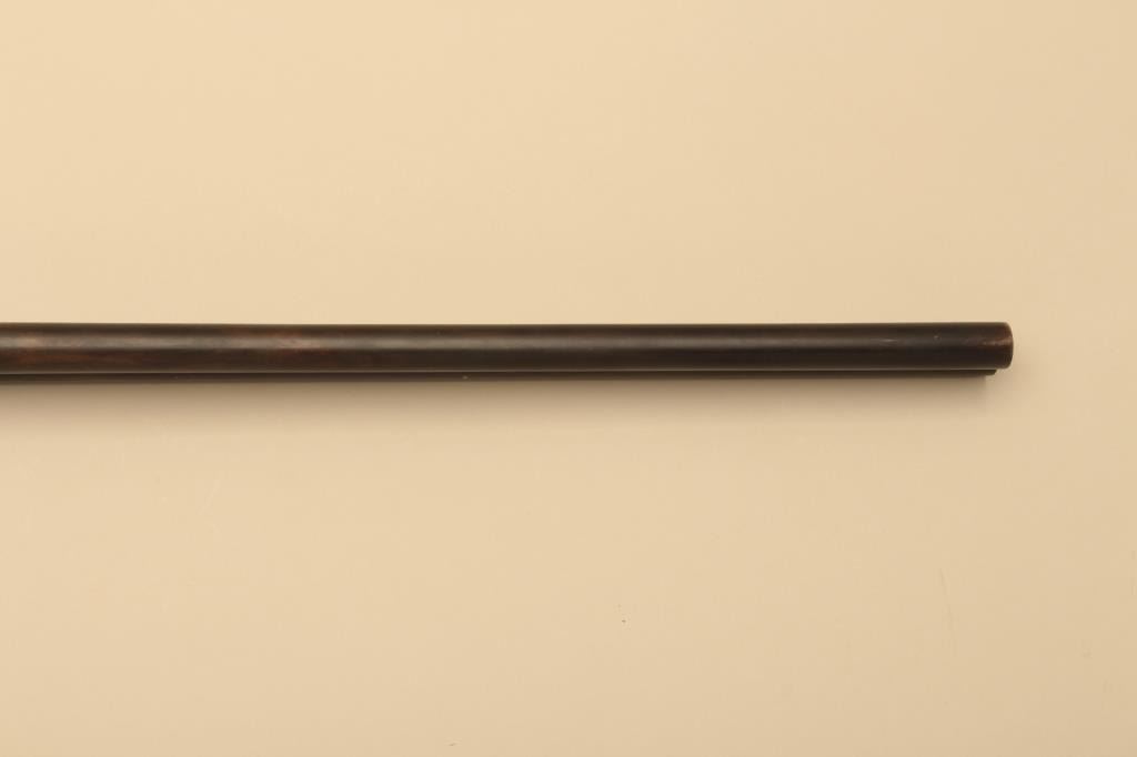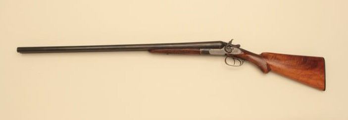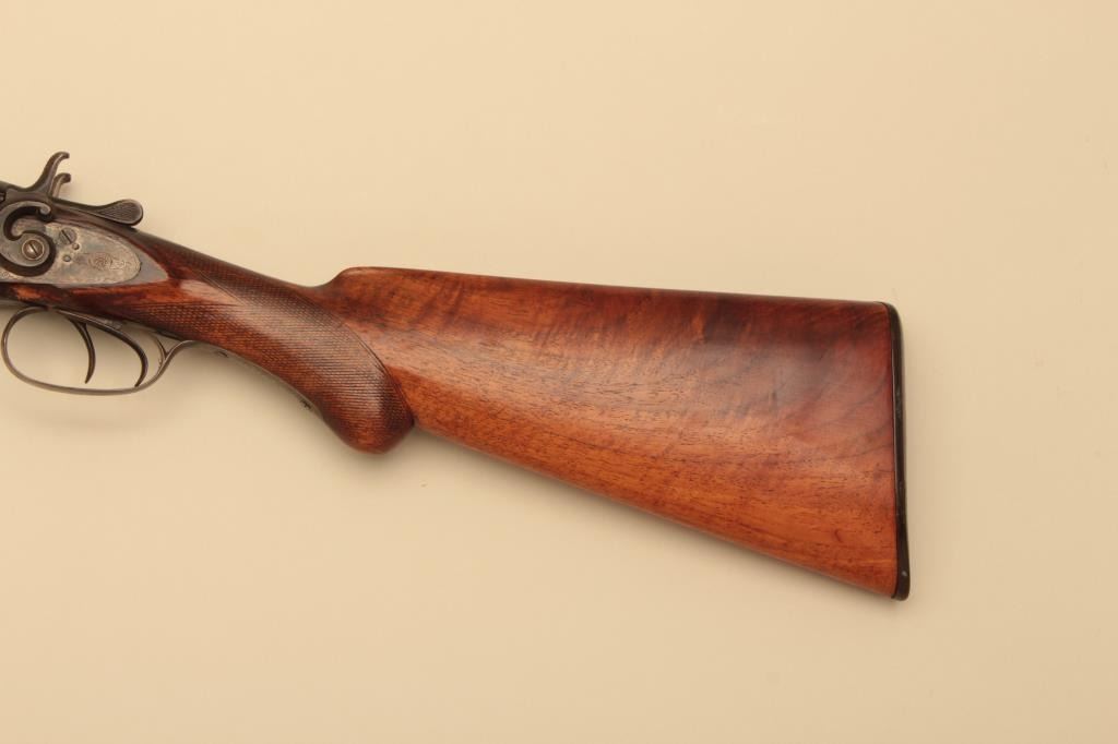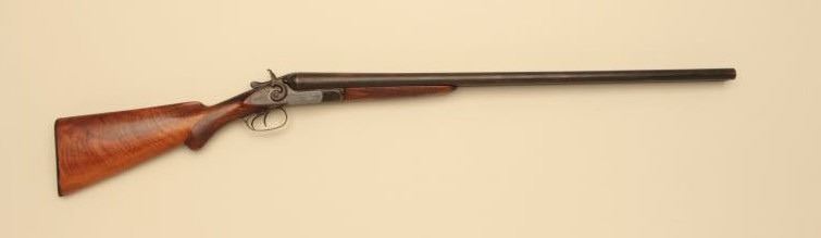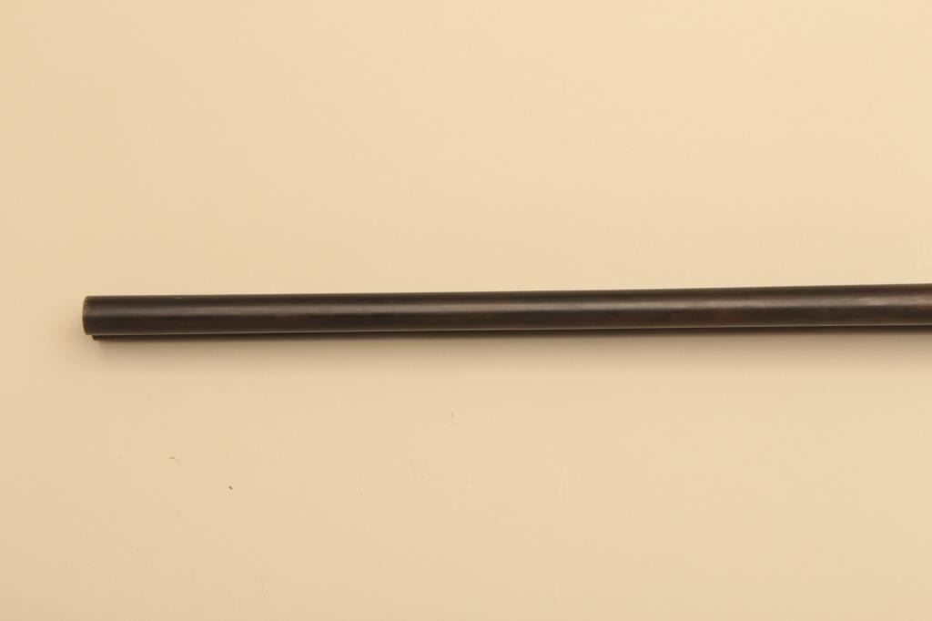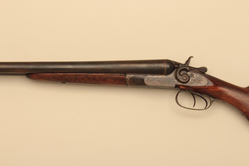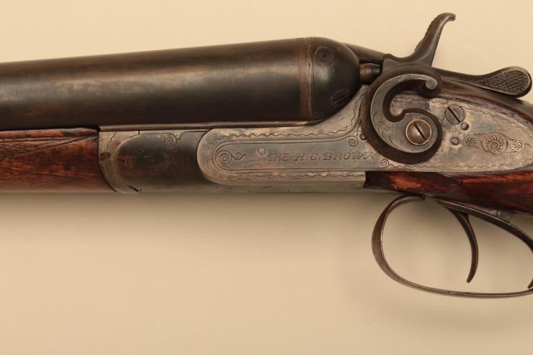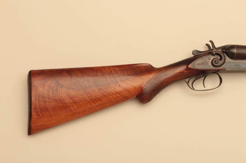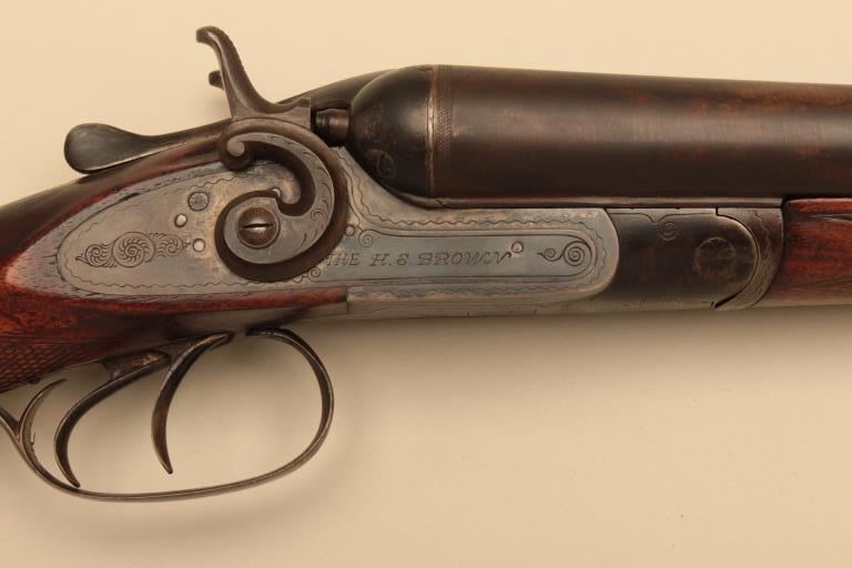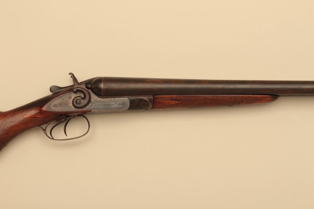 H.S. Brown SxS 12GA Damascus barrel with exposed hammers, S/N 3070. The barrels measure 30” and choked modified in both barrels. Locks tight with fair to good bores needing cleaning. 50%-70% old reblue. Stockdamaged with large loss below the left lock plate. Original buttplate. (Antique) Est.: $125-$250