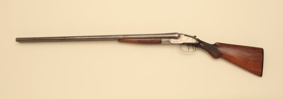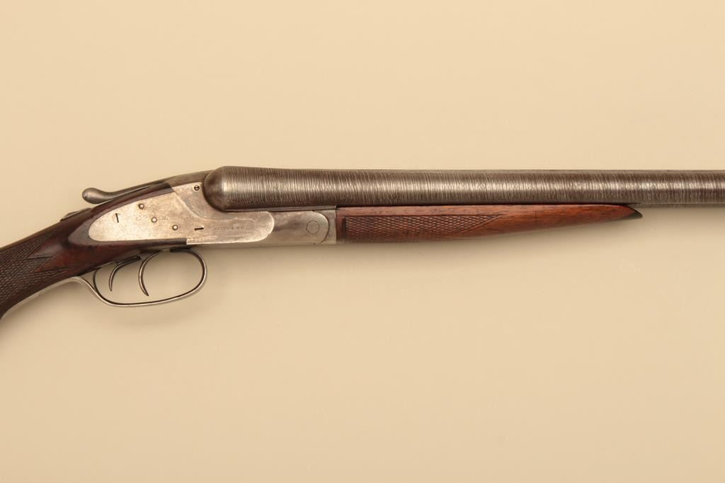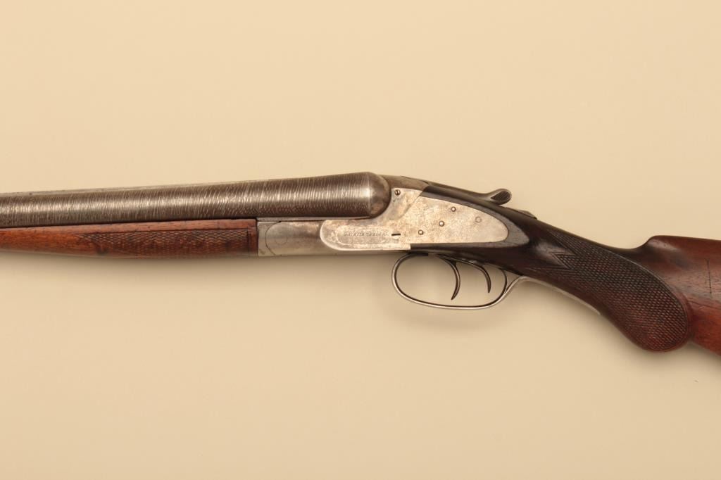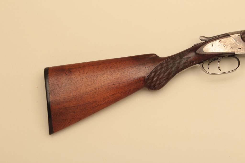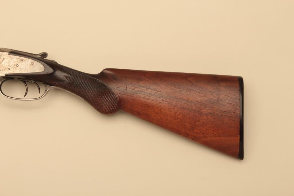 Batavia Leader by Baker Gun Co. 12GA SxS Damascus shotgun, field grad, S/N 88546 with 29 7/8” barrels choke modified right and full left. Standard extractors and double triggers. 14” to the end of the plate. FalseDamascus etched pattern about 80%-90% intact with 30%-50% drifting case colors on action. 30%-50% blue on the trigger guard. Great lock up and very tight. The bores are very good plus and bright. The wood is good to verygood with normal imperfections. (Modern) Est.: $250-$500