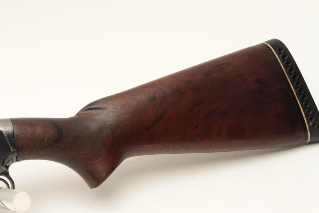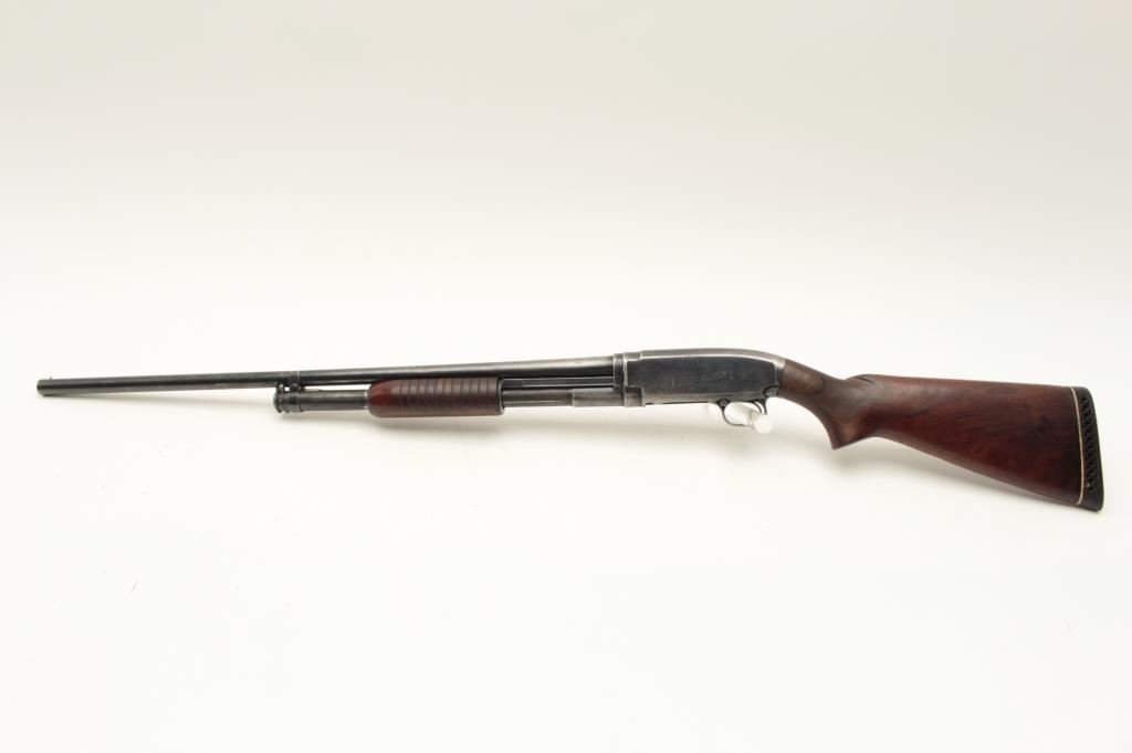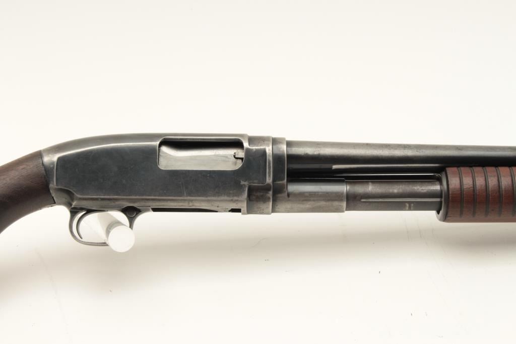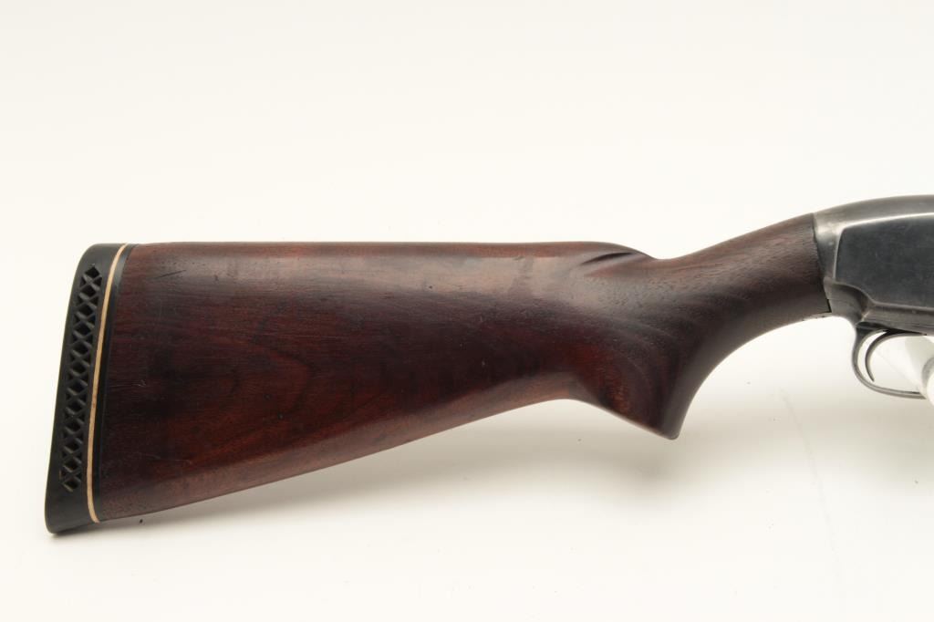 Winchester Model 12 pump action takedown shotgun, 12 gauge, modified choke, 28” barrel, blued finish, wood stocks, S/N 1248296, in overall good to very good condition with a very good bore, crispaction, good markings and wood with added White Line hard rubber butt pad. (Modern). Est.: $250-$500.