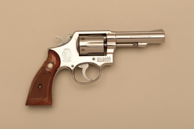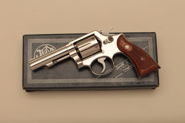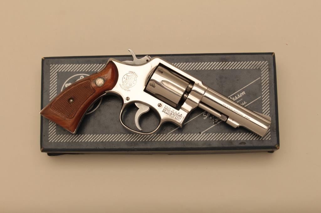 Smith & Wesson Model 64-1 Military & Police DA revolver, .38 Special caliber, 4” heavy barrel, stainless, checkered wood medallion grips, S/N 1D3505; overall fine condition with a crisp action and markings, fine boreand very good to fine grips. Accompanied by a factory two piece cardboard box with end piece description matching the features of this gun. (Modern/NO CAL. SALE). Est.: $400-$800.