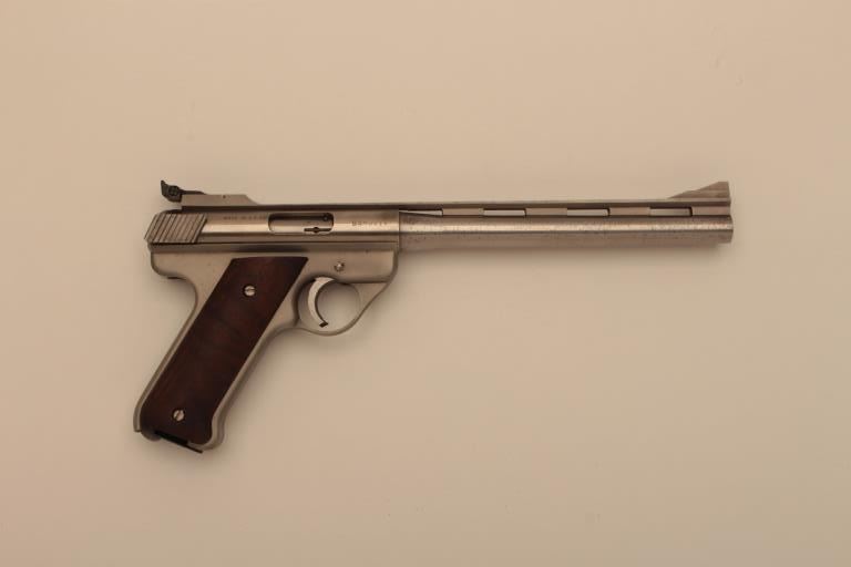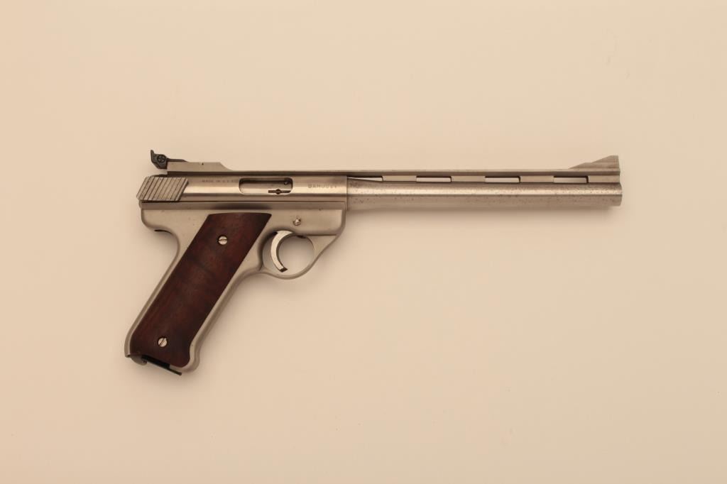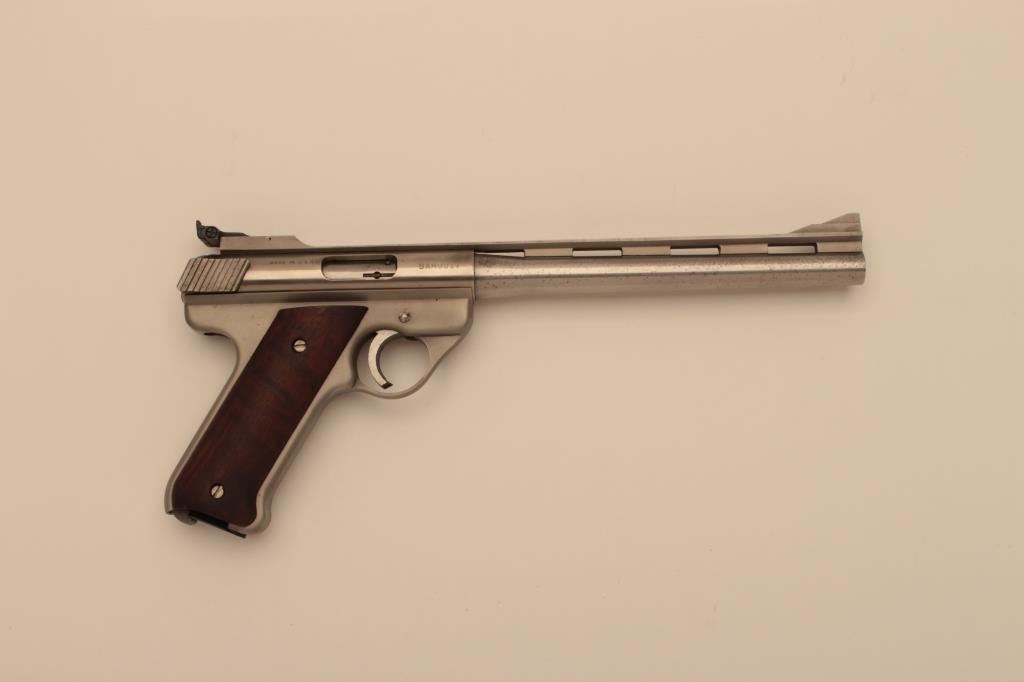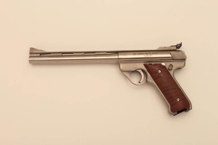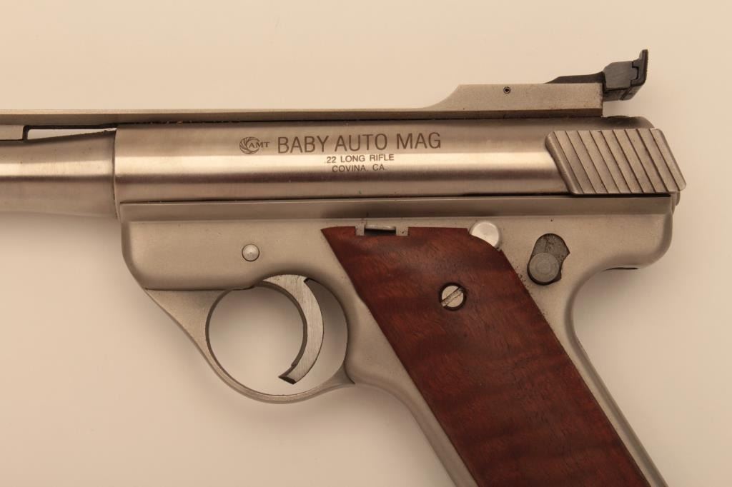 AMT Baby Automag (Covina, CA.) semi-automatic pistol, .22LR caliber, 8.5” ventilated rib barrel, stainless, smooth wood grips, S/N BAM0817; overall very good + condition displaying some scattered light pittingconfined primarily to the right side of the barrel, very good + bore, crisp action, very good markings and near fine grips. (Modern/NO CAL. SALE). Est.: $400-$800.