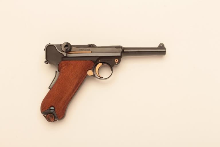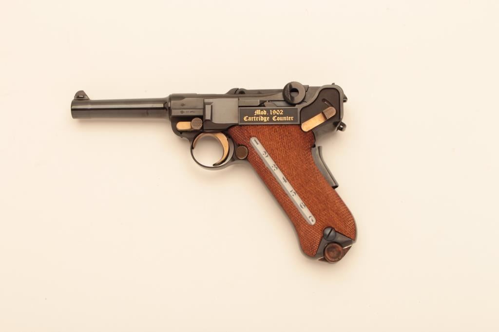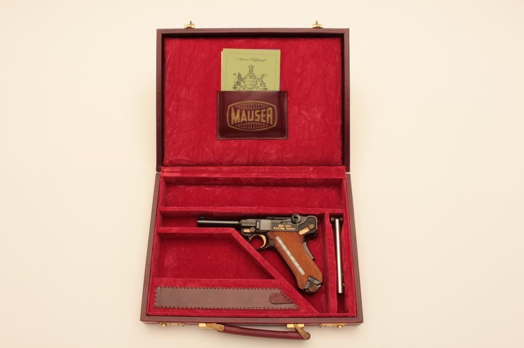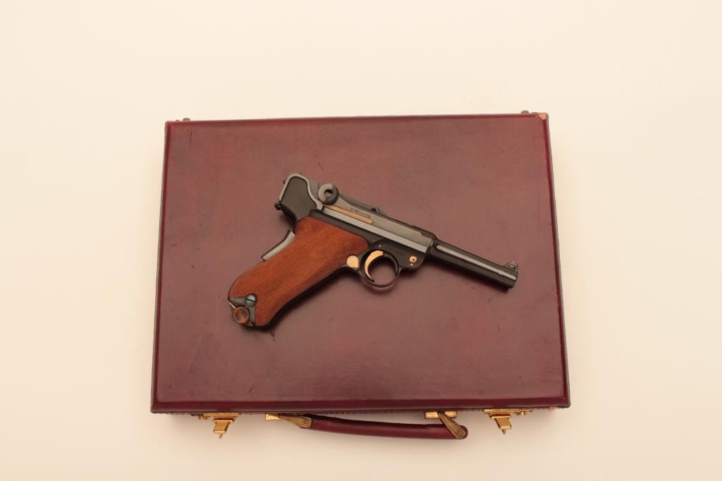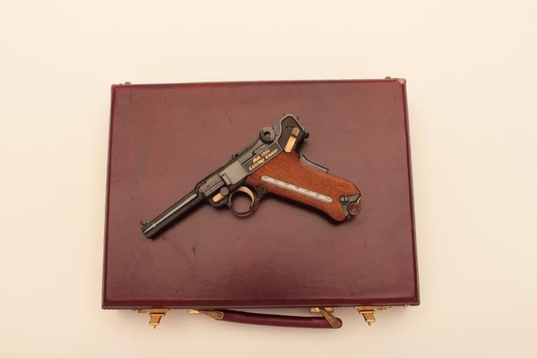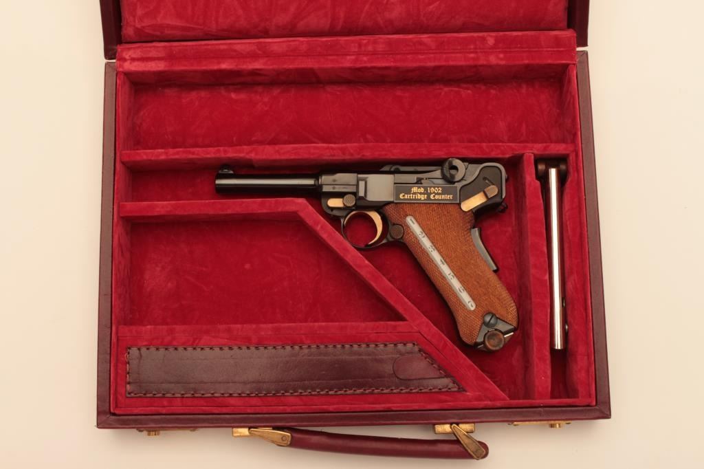 Rare and desirable Mauser Oberndorf made American Eagle Luger with cartridge counter in grip, S/N C153VON250. Deluxe leather briefcase style presentation case with 2 mags, rod, takedown tool, certificate andMauser papers. Gold decorations. Excellent to near mint. 99.9% to almost mint and no evidence of use. Only 250 made in seventies and never seen on the market! (Modern/PPT) Est.: $2500-$5000