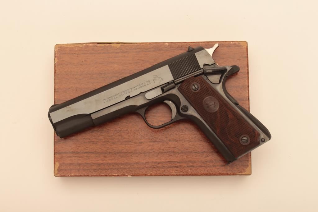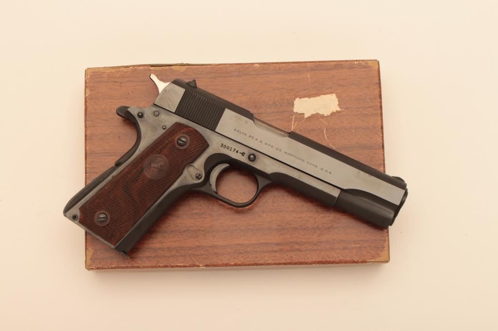 Colt Government Model 1911A1 post WWII commercial .45 ACP caliber pistol with original box, S/N 300174C and made in 1965. Fine to excellent condition with 98%-99% original finish. Slight use only. Earlygrips. (C&R/PPT) Est.: $1250-$2500