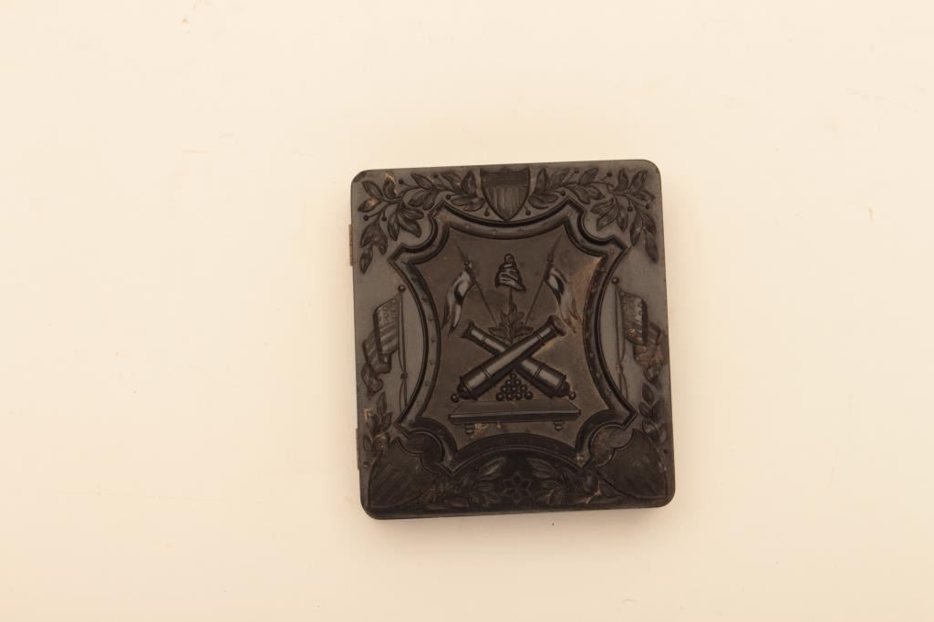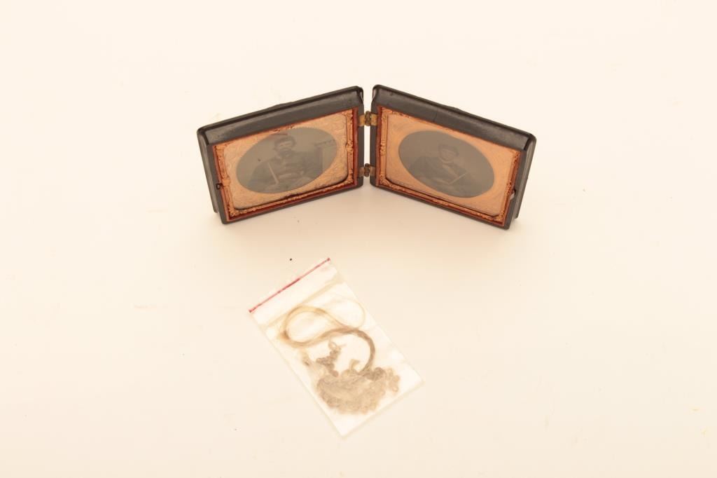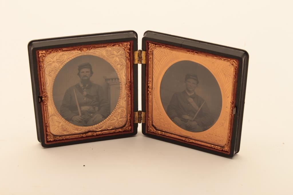 Pair of tintypes in patriotic gutta percha case id’d as Josiah Haskell and Willard Haskell with braided locket of hair. The older brother is wearing a beard in uniform holding bayonet. Younger is clean shaven also with bayonet as prop. Most likely taken at the same time. The image measures 2 5/8” from top to bottom. The images and case are very good with minor imperfections and aging. Est.: $250-$500