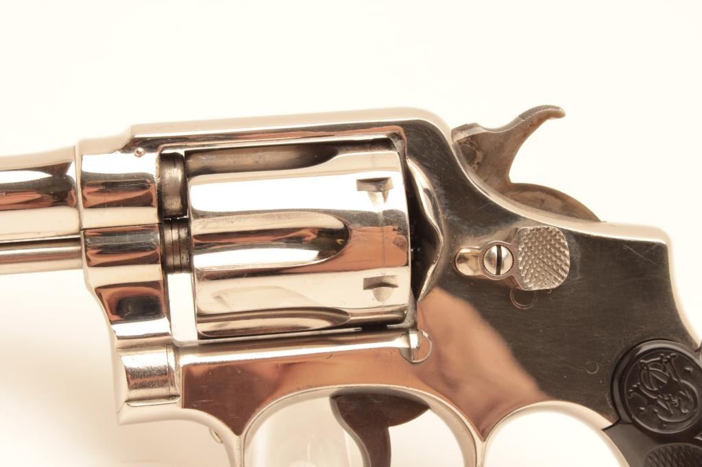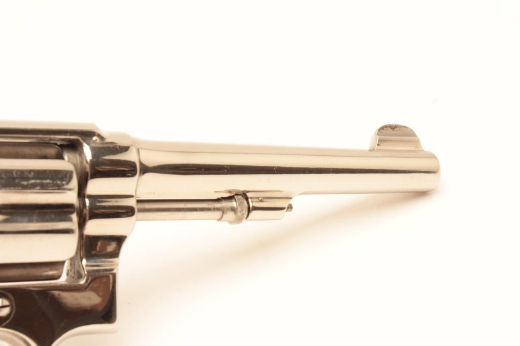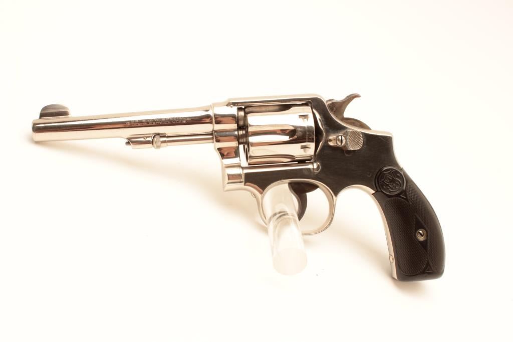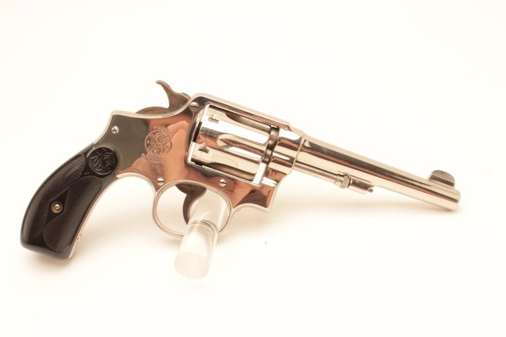 Smith & Wesson Model 1905 hand ejector, 5 screw DA revolver, .38 Special caliber, 5” barrel, high quality old re-nickel finish, checkered hard rubber grips, S/N 106746; overall good to very good condition with agood bore, crisp action and markings, very good + grips. (C&R). Est.: $250-$500.