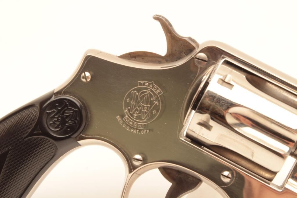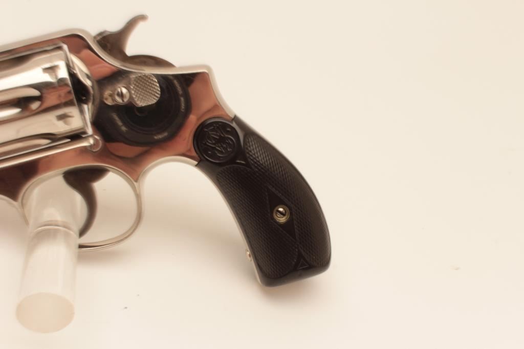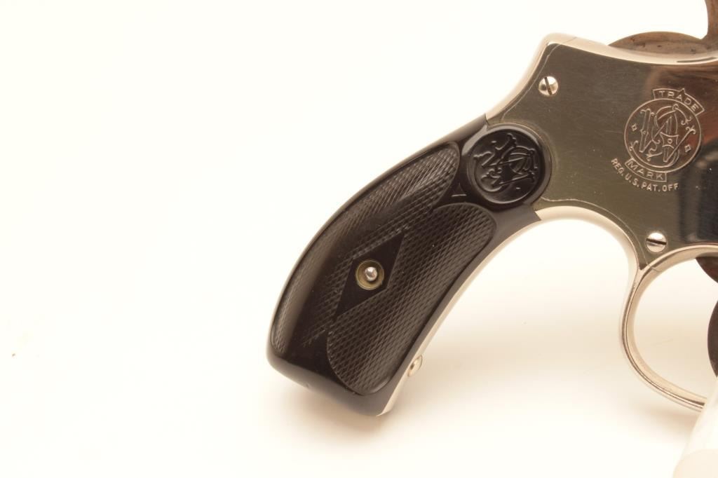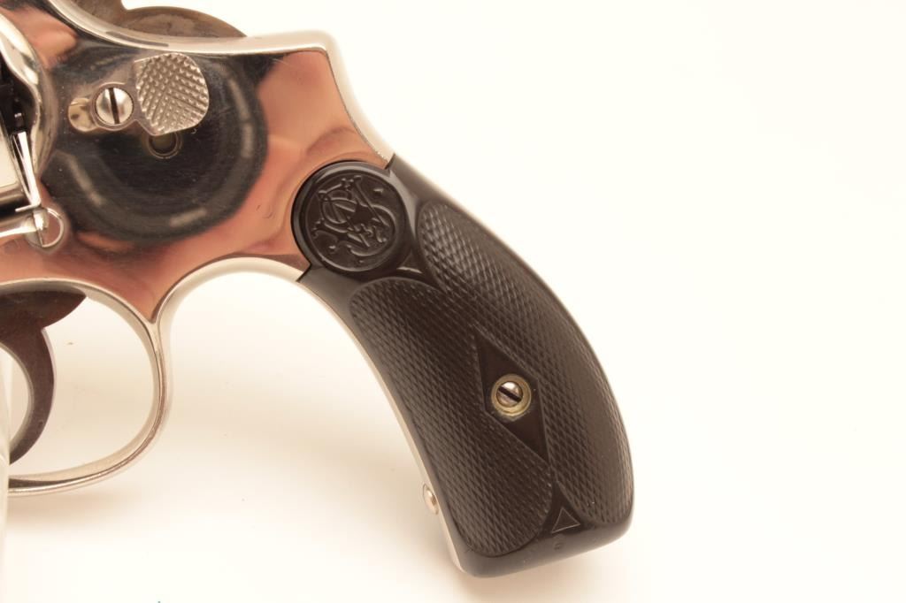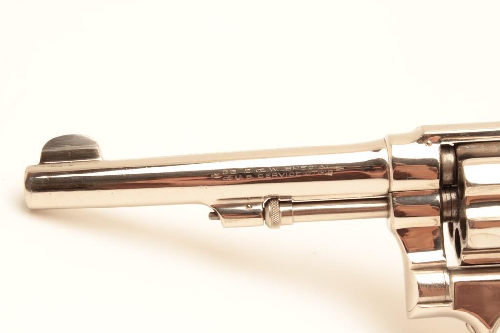 Smith & Wesson Model 1905 hand ejector, 5 screw DA revolver, .38 Special caliber, 5” barrel, high quality old re-nickel finish, checkered hard rubber grips, S/N 106746; overall good to very good condition with agood bore, crisp action and markings, very good + grips. (C&R). Est.: $250-$500.