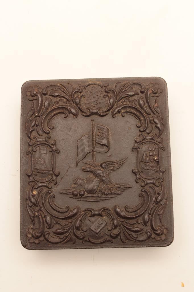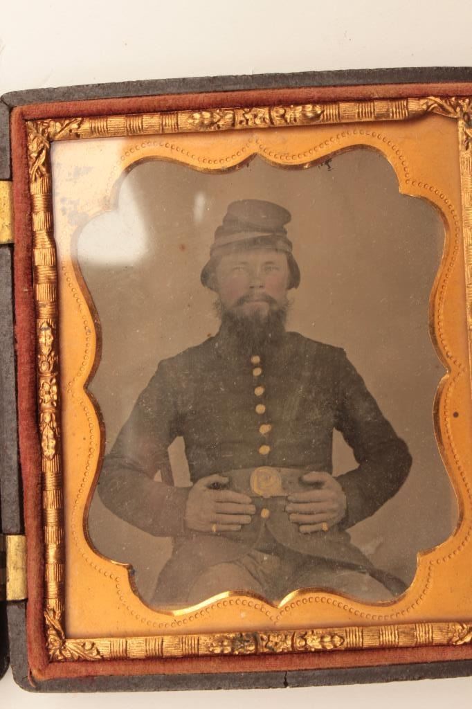 Tintype in gutta percha case of Corporal seated in uniform with “bummer” cap and belt showing buckle. Measures approximately 3” top to bottom. The condition is good with normal aging. The case is also good with typicalaging. Est.: $150-$300