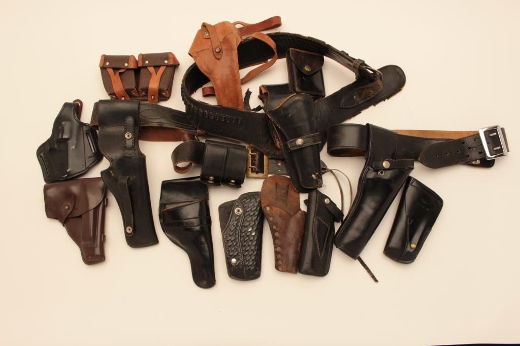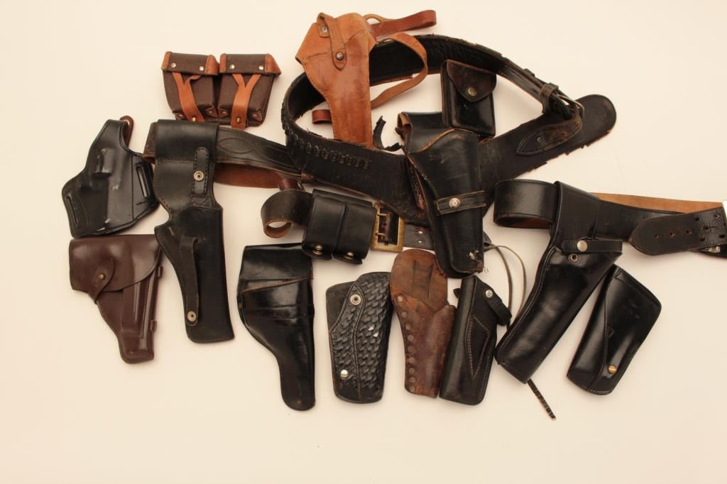 Bonanza leather lot of 12 holsters, belts, magazine pouches, leather ammunition belts, flashlight and other assorted accoutrements. A great lot for the gun show circuit. Est.: $150-$300.