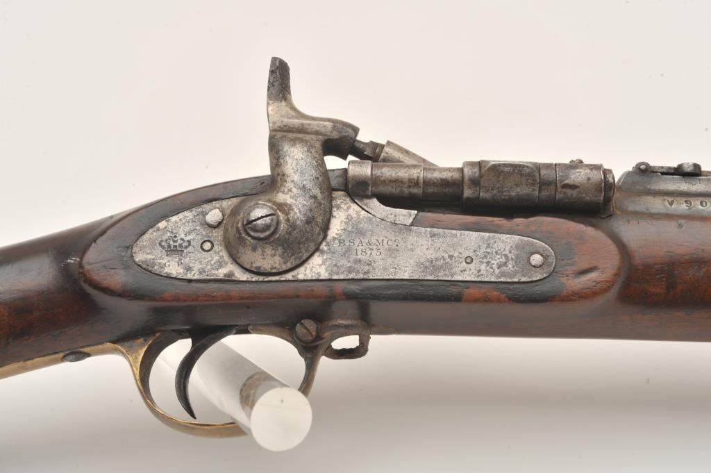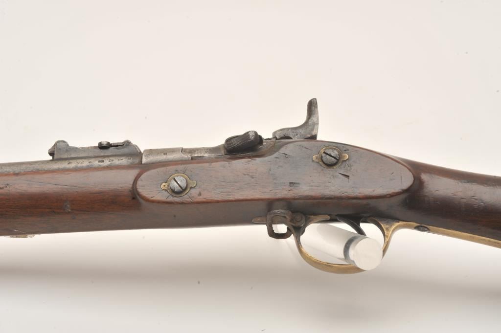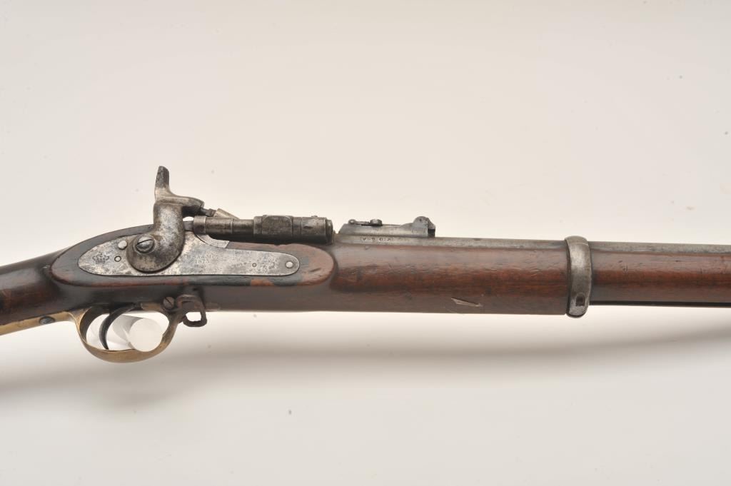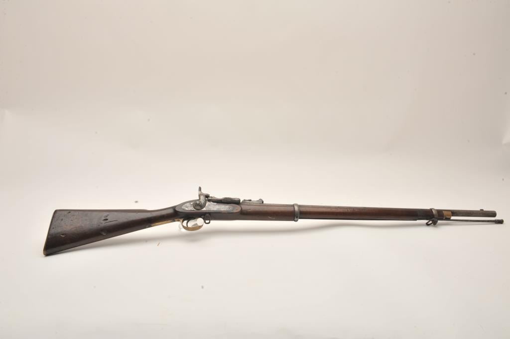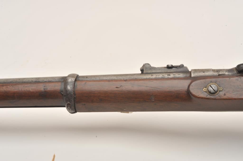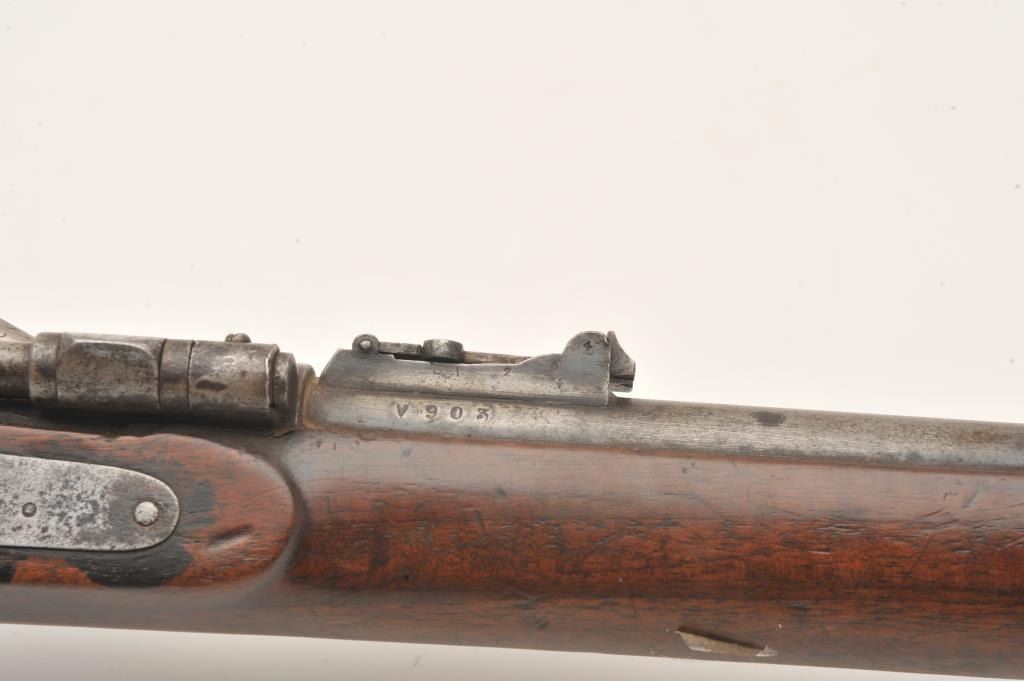 Snyder single shot percussion rifle, .58 caliber, Serial #V903. The rifle is in fair overall condition with a 30” barrel with a post front and military tangent style rear sights. The metal surfaces have taken on agrey patina with light surface erosion and numerous British proof marks on the barrel. The side plate is marked BSA & Co. and dated 1875. The smooth wood stock is in fair condition showing heavy use with numerousdents and compressions. The stock features brass hardware and ends with a smooth brass butt plate. The bore is fair, the markings are legible and the action functions. Est.: $200-$400. (Antique).