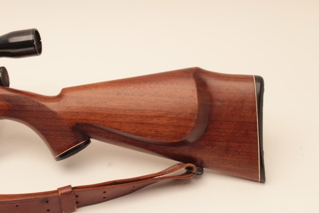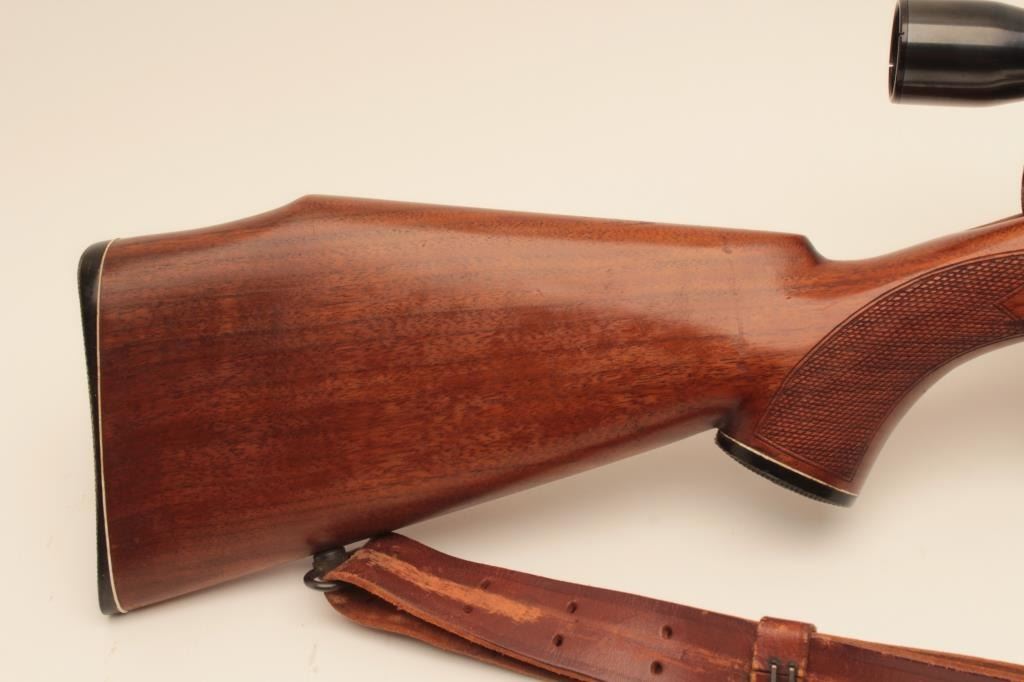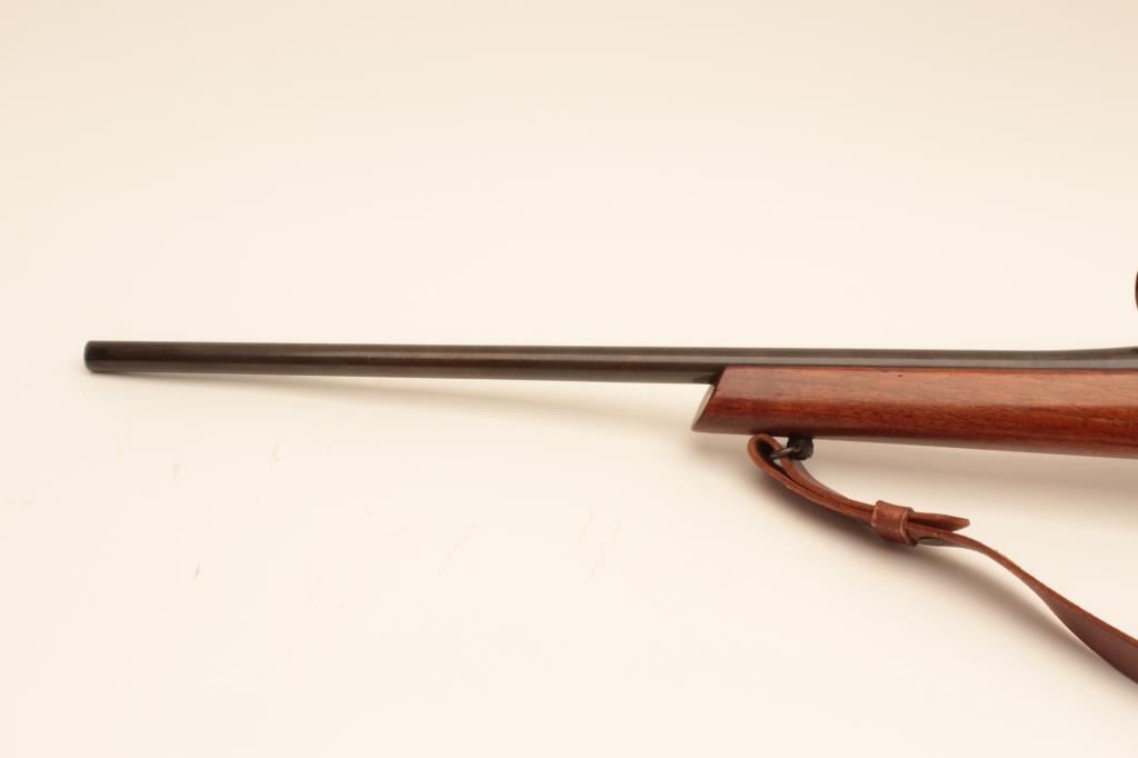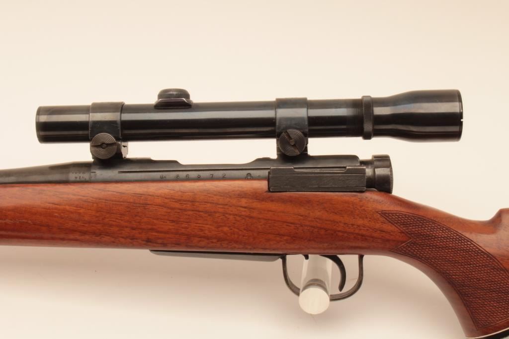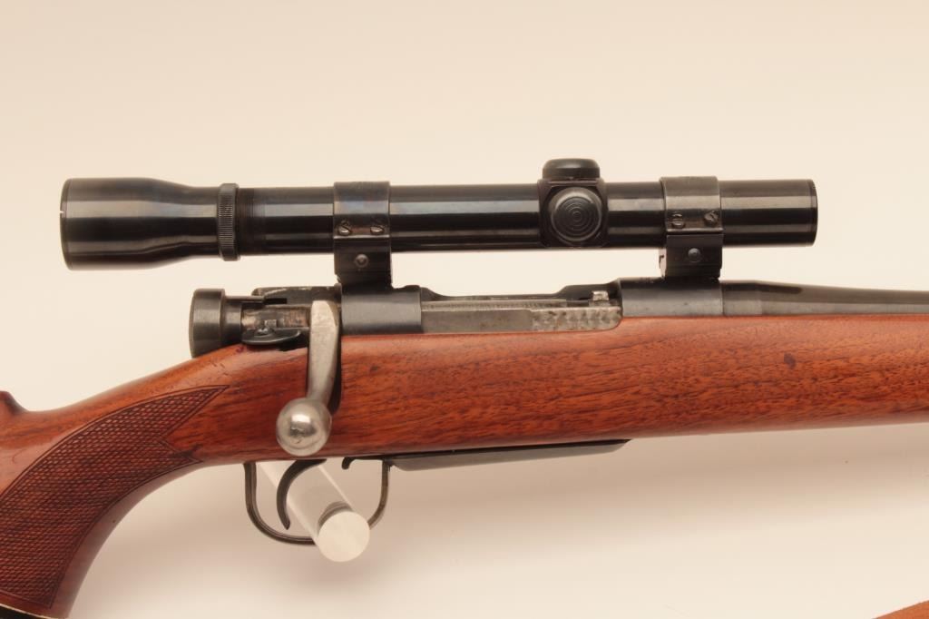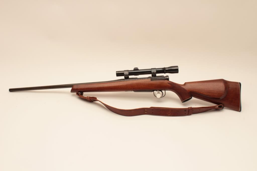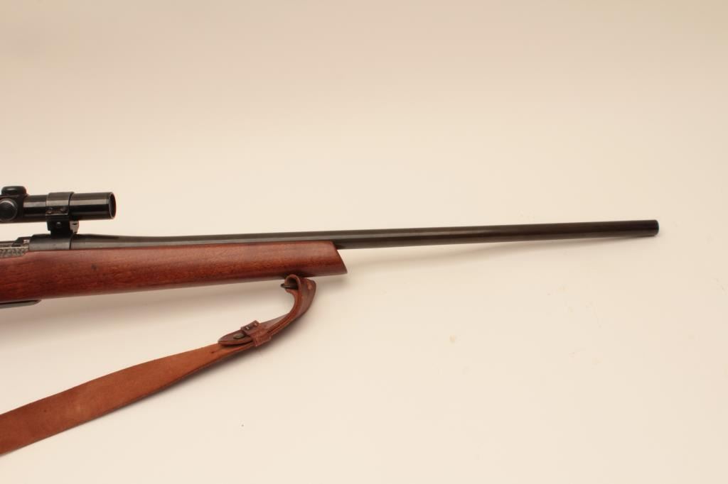Sporterized Japanese Arisaka bolt action rifle, .308 Winchester caliber, Serial #86572. The rifle is in good overall condition as sporterized with a 22” barrel. The metal surfaces retain the majority oftheir thinning blue finish with the remainder going to grey patina. The custom checkered wood stock is in good condition with mars and scratches from carry and use. The bore is good, the action is crisp and markings arelegible. The lot includes a leather military style sling and the rifle is topped with Weaver rings and a Weaver K3 fixed power scope. Est.: $200-$400. (C+R).